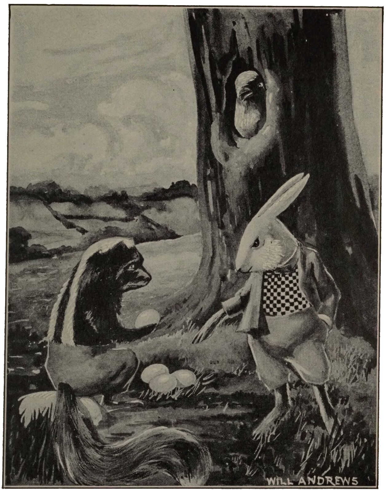 “What’s that?” cheeped Bob. He simply couldn’t believe his ears. “Well, I’ll be feathered! I’d as soon expect the Great Horned Owl to tell me such a thing. Eggs? You’re perfectly welcome. It’s not too late to nest over again. But for a skunk you’re certainly queer.”
