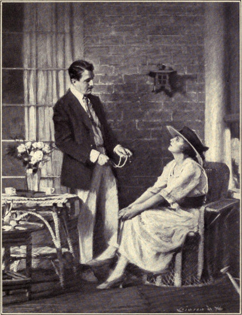 Perhaps some one had seen me from a window, for in a little while there was the click of high heels on the bare steps of the stairway. Then out on the veranda came a figure too little to be tall and too tall to be considered little, carrying herself proudly, placing her dainty feet daintily, but advancing toward me instead of going away. She was dressed in white, with a scarlet band about her waist and another about her dashing Panama, of the same shade as her lips. In the opening at the neck she wore a string of pearls. Lower down, the opening was fastened by a diamond bar-pin. In her hand she carried a gold-mesh purse, which she threw carelessly on a table as she passed.