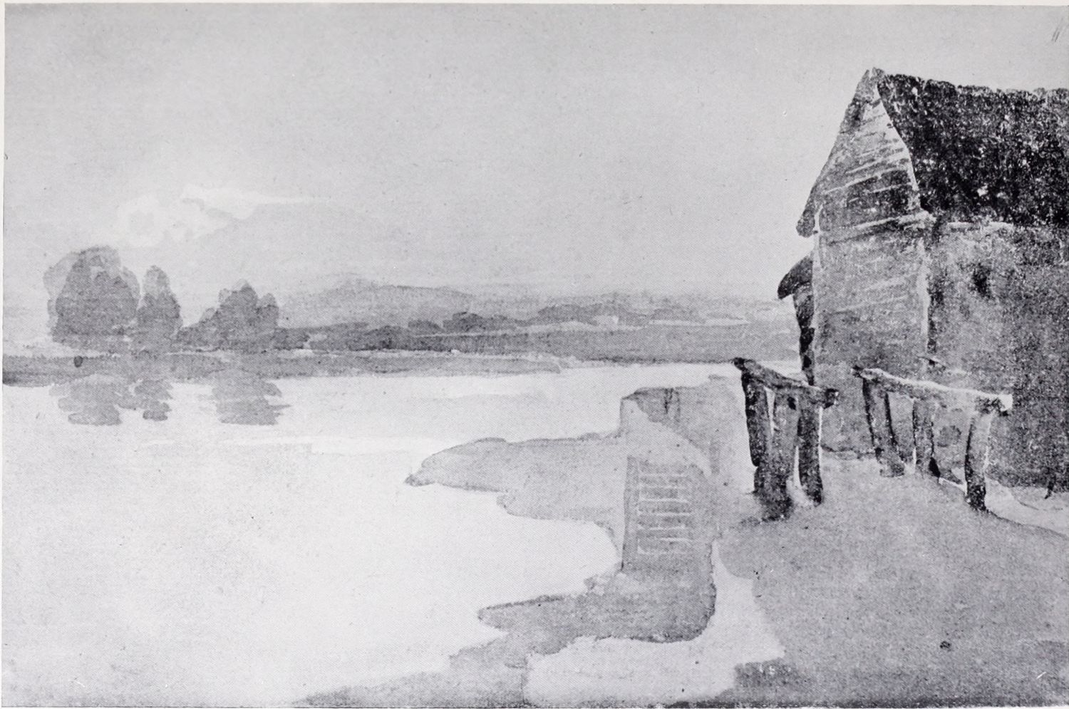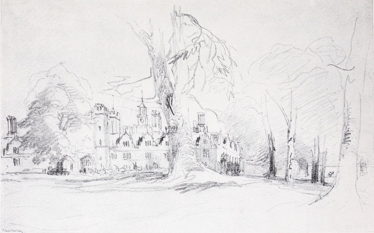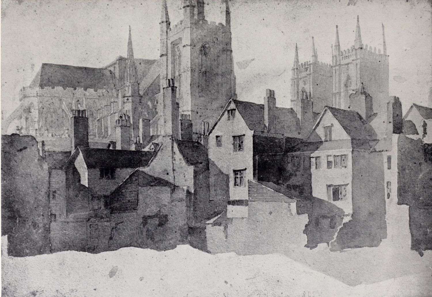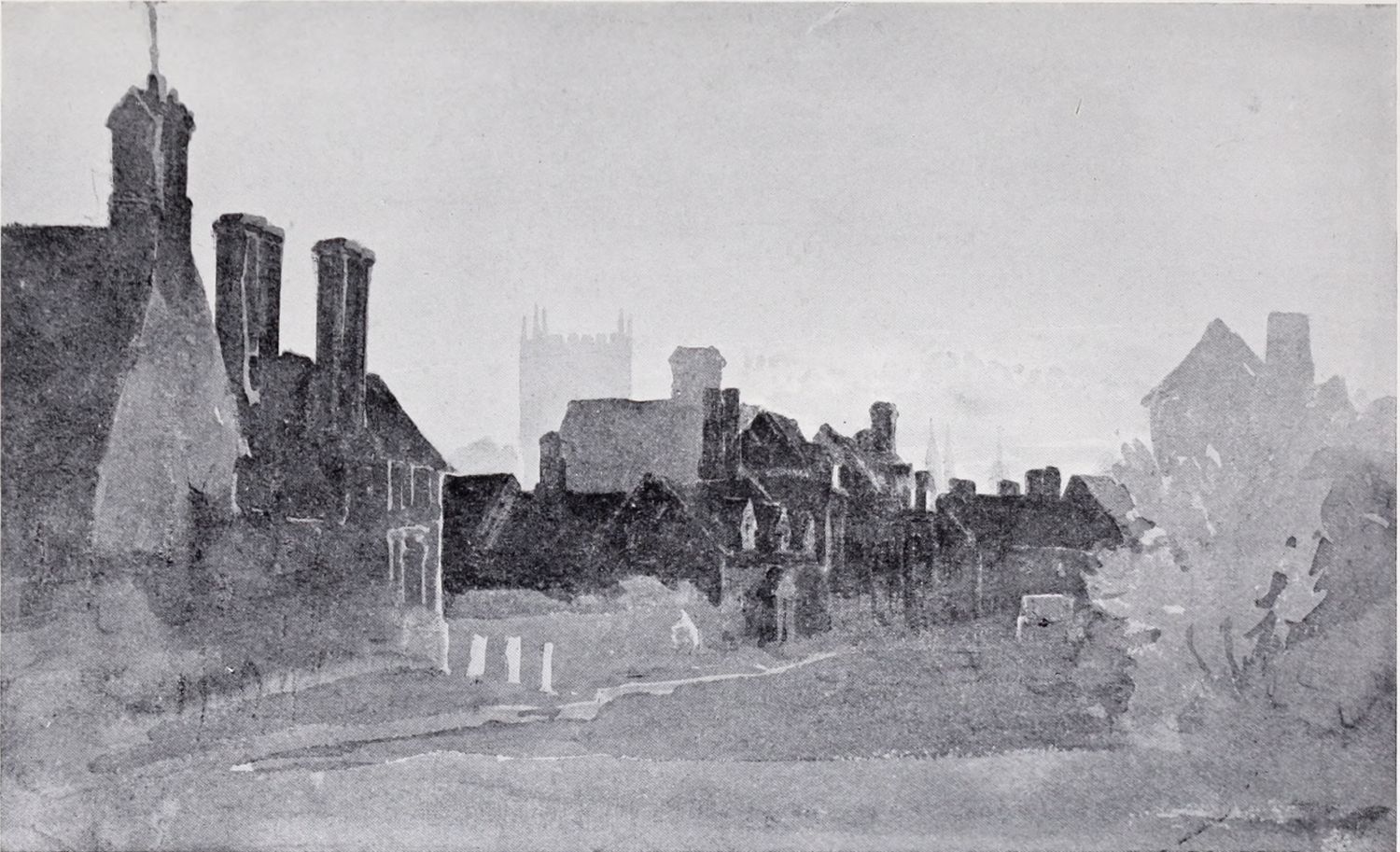 In pursuance of this plan of appropriating what he could from the practice and methods of the proficients in the art, Cox determined to take lessons from the living as well as from the dead. For some time his choice hesitated between John Varley, John Glover, and William Havell. He finally decided to go to Varley, who treated him with much kindness. Varley, who was only five years older than Cox, was one of the most successful teachers of the time, and, in addition to Cox, he numbered Mulready, W. H. Hunt, Linnell, Samuel Palmer, Copley Fielding, and De Windt among his pupils. His early manner was modelled largely on the practice of John Cozens and Girtin; and the simplicity, directness and dignity of much of Cox’s early work is certainly due to the thoroughness{10} with which Varley had mastered the traditions of the earlier English water-colour painters, and to his capacities as a teacher. The second plate in this volume is a reproduction of one of Cox’s drawings of this period. The original water-colour, Old Westminster, is probably one of the most successful of Cox’s purely architectural drawings; it might almost pass for a Girtin.