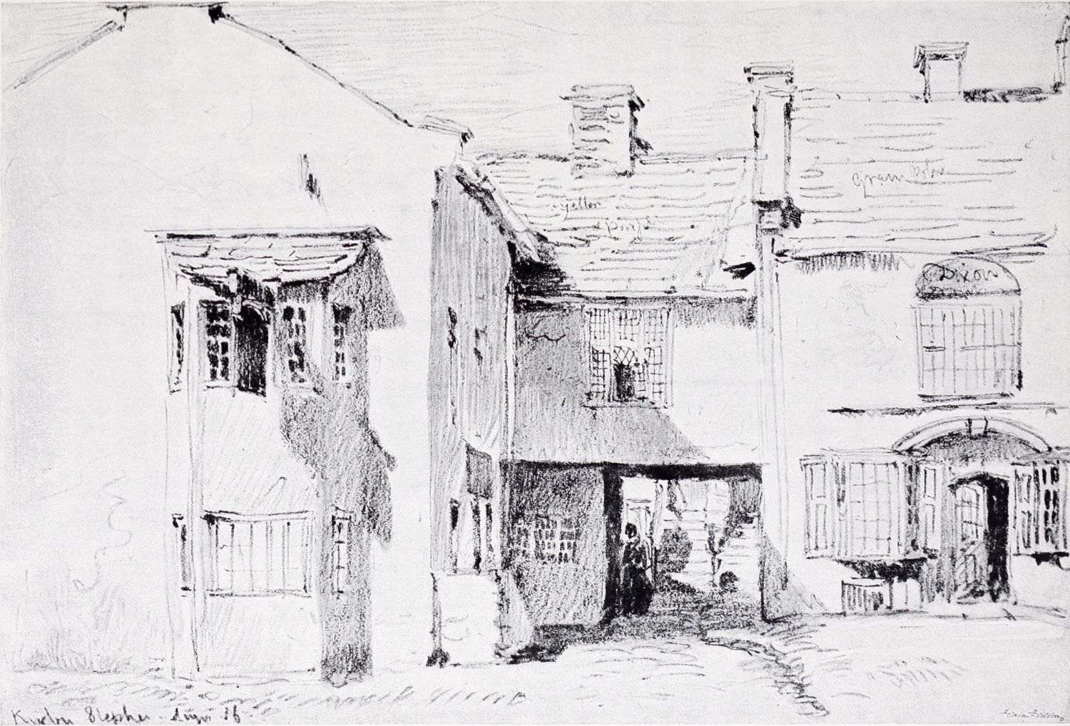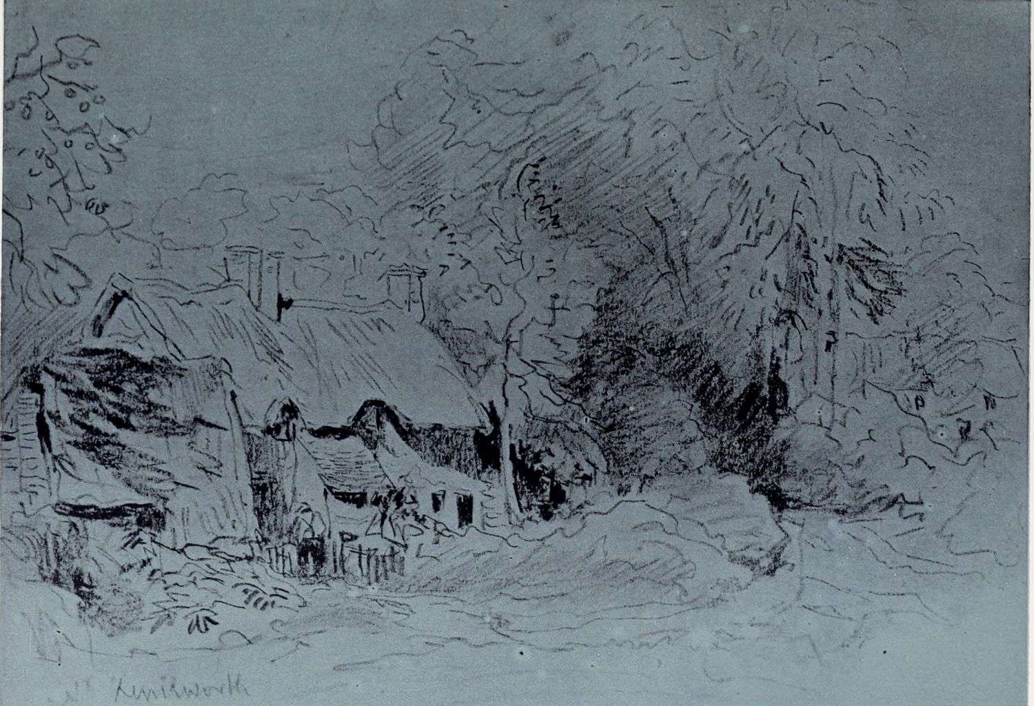Nearly every year during his residence in London, Cox made a journey to visit his old father and his other friends at Birmingham. The sketch book he used on his 1810 visit is still in existence, and Plate XVIII., a drawing of some half-timbered houses “near Birmingham,” represents the contents of one of its pages. The drawings are all made on rough blue paper; and among the other subjects contained in this singularly interesting book are some striking studies of scenes down a mine at Dudley, and sketches at and near Kenilworth. The handling is not so loose as in Cox’s later work;{11} but what the drawings lack in freedom is more than compensated by their directness and admirable restraint, as our reproduction amply proves.
