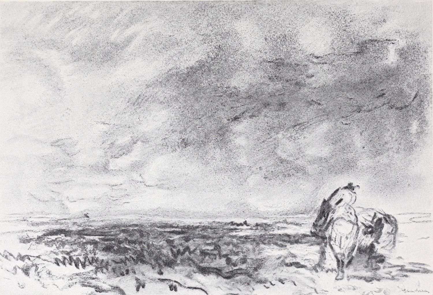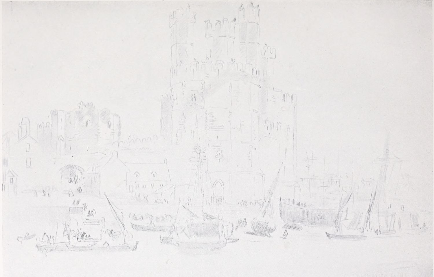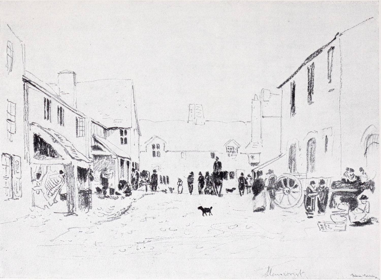 Reproductions of a number of charcoal and chalk sketches belonging to this later period of his life have been included in the present volume. Large charcoal drawings like The Salt Marsh (Plate XXV.), The Beach (Plate XXVII.), Windy Weather (Plate XXVIII.), and The Hill Side (Plate XXXIII.), lose something of their impressiveness when reduced in size, as these have necessarily been, but enough remains, even in this form, of their freshness, largeness of conception and sense of movement, to delight the intelligent amateur. No one at all susceptible to the higher beauties of art could remain insensible to the fascination of the bold, synthetic handling of The Peasants on Horseback (Plate III.). In some of these late sketches—notably in the two Near Kenilworth (Plates VII.{18} and XXIV.)—the loose, flowing touch often seems a trifle too disdainful of the individual forms of objects. But when the artist is serenely self-possessed his style is delightfully intimate and unbuttoned, a candid revelation of his sympathies and moods. When thoroughly interested he becomes astonishingly vivid and succinct, as in the Kirkby Stephen (Plate XX.), Llanrwst (Plate XVI.), and Clapham, Yorkshire (Plate XXII.). How much his art had become a matter of feeling and impulse is shown by the glaring way he fails when his sympathies have not been aroused; the draughtsmanship of the Architectural Study (Plate XXII.) is about as bad as draughtsmanship can well be—bald, perfunctory, external. The pencil and stump drawing of Carnarvon Castle (Plate XXX.), for all its lightness and charm of atmospheric suggestion, is “mappy” in draughtsmanship—its drawing being mere “spacing,” without intimacy in the form or sympathy with the structure. The drawing of Rotterdam (Plate XLI.) is again external and unsympathetic. These drawings might well have been chosen as illustrations of the truth of one of Cox’s own remarks: “Merely to paint” (or draw) “is not enough, for when no interest is felt nothing is more natural than that none should be conveyed.”