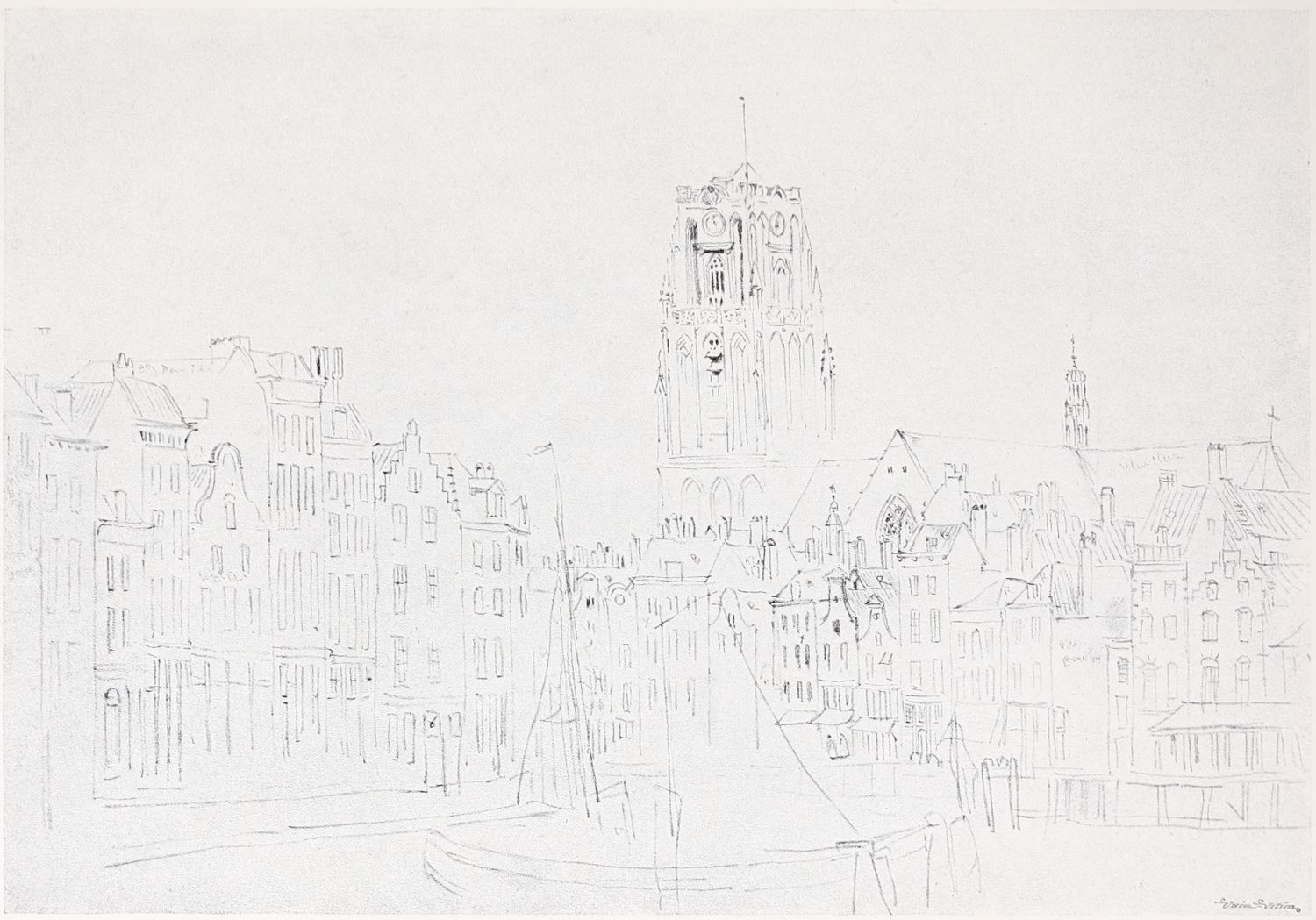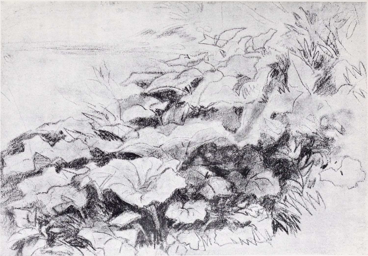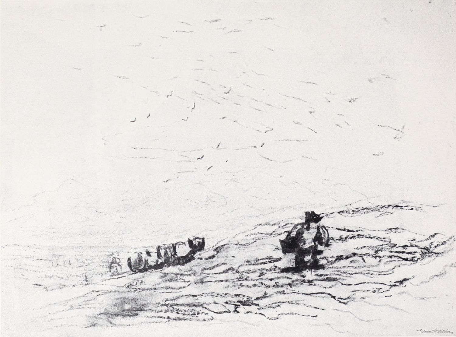Reproductions of a number of charcoal and chalk sketches belonging to this later period of his life have been included in the present volume. Large charcoal drawings like The Salt Marsh (Plate XXV.), The Beach (Plate XXVII.), Windy Weather (Plate XXVIII.), and The Hill Side (Plate XXXIII.), lose something of their impressiveness when reduced in size, as these have necessarily been, but enough remains, even in this form, of their freshness, largeness of conception and sense of movement, to delight the intelligent amateur. No one at all susceptible to the higher beauties of art could remain insensible to the fascination of the bold, synthetic handling of The Peasants on Horseback (Plate III.). In some of these late sketches—notably in the two Near Kenilworth (Plates VII.{18} and XXIV.)—the loose, flowing touch often seems a trifle too disdainful of the individual forms of objects. But when the artist is serenely self-possessed his style is delightfully intimate and unbuttoned, a candid revelation of his sympathies and moods. When thoroughly interested he becomes astonishingly vivid and succinct, as in the Kirkby Stephen (Plate XX.), Llanrwst (Plate XVI.), and Clapham, Yorkshire (Plate XXII.). How much his art had become a matter of feeling and impulse is shown by the glaring way he fails when his sympathies have not been aroused; the draughtsmanship of the Architectural Study (Plate XXII.) is about as bad as draughtsmanship can well be—bald, perfunctory, external. The pencil and stump drawing of Carnarvon Castle (Plate XXX.), for all its lightness and charm of atmospheric suggestion, is “mappy” in draughtsmanship—its drawing being mere “spacing,” without intimacy in the form or sympathy with the structure. The drawing of Rotterdam (Plate XLI.) is again external and unsympathetic. These drawings might well have been chosen as illustrations of the truth of one of Cox’s own remarks: “Merely to paint” (or draw) “is not enough, for when no interest is felt nothing is more natural than that none should be conveyed.”