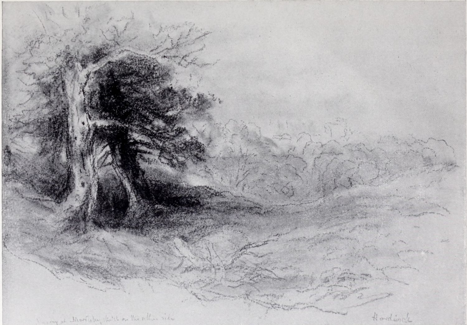 The house stood in a lane leading to Harborne Church, beyond which meadows and open country stretched out in the direction of{17} Hagley. The garden was a large one, surrounded on both sides by trees, and Cox took great interest in it, often working there himself. He enjoyed cultivating broad-leaved plants, such as rhubarb and the various kinds of docks, and he was especially fond of Scotch thistles and hollyhocks. At Harborne, he spent some of the happiest years of his life; he was happy in his home, in his work, and in his surroundings. As Mr. Solly says, “Cox’s wants were few and simple; his ambition took no flight beyond the constant aim of his life, namely, to excel in the practice of his art. The inexhaustible wealth of nature, his genius, and the love of his family and friends, sufficed to fill his cup with more happiness than is allotted to most men; even when his steps were fast approaching that goal to which all human efforts tend, he was still serene and generally cheerful.” We need not wonder that the most moving and powerful of all the artist’s works were painted after his removal to Harborne.