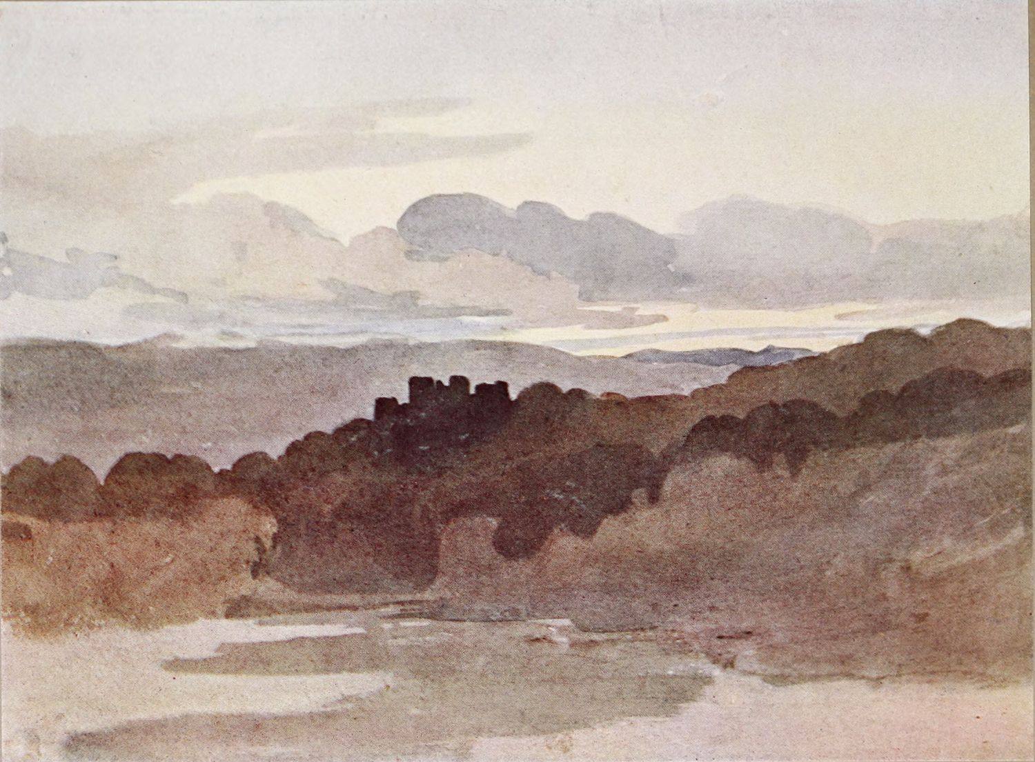 All the coloured reproductions in the present volume represent drawings made during the artist’s residence in Hereford. The Chepstow Bridge and Castle (Plate XII.) was probably one of the results of Cox’s first sketching tour after his removal, and this very drawing may possibly have formed one of the exhibits which he sent to the Society of Painters in Water-Colour in 1816. Plate XXIII. may represent the sketch made for the picture of Goodrich Castle on the Wye, which the artist exhibited in 1819. In both the drawings, as in the unfinished Frontispiece, the colour scheme is less severe than in the earlier Westminster. They are less like Girtin’s than like early Cotmans; and though they lack something of Cotman’s fastidiousness of selection, and the aristocratic charm of his draughtsmanship and design, they have a sobriety, reserve and seriousness of their own which must make them objects of delight to their fortunate possessor. The slightness of the execution of Low Tide (Plate XXXIV.) is no hindrance to the poignant expression of its sentiment. Unfortunately, it has not been found convenient to reproduce the magnificent—albeit unfinished—water-colour, entitled Autumn Woods, in its original colours. The half-tone reproduction (Plate XIX.), however, is useful as a suggestion of the simple dignity that reigns in this beautiful drawing—assuredly one of the finest works produced during the artist’s residence in Hereford.