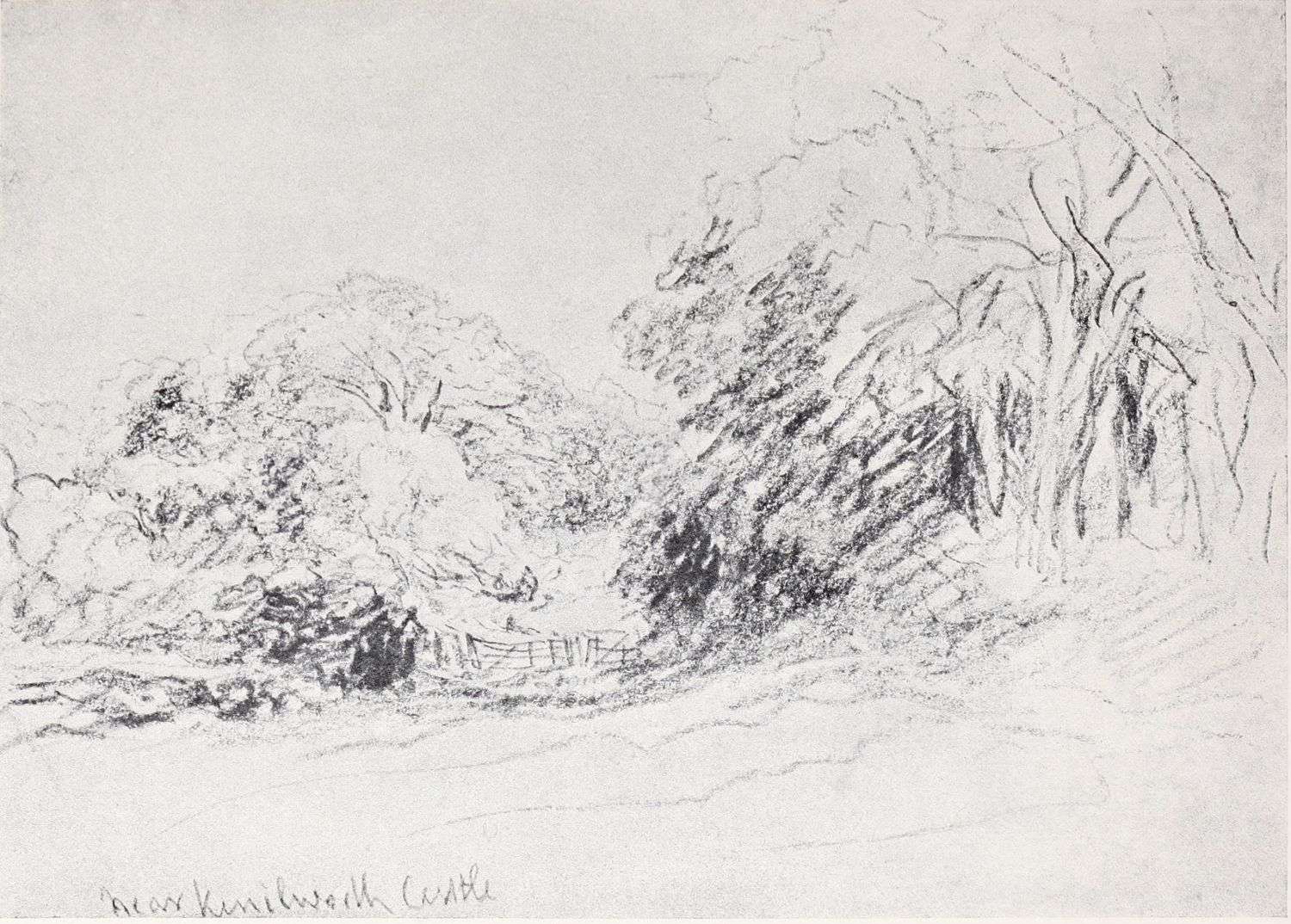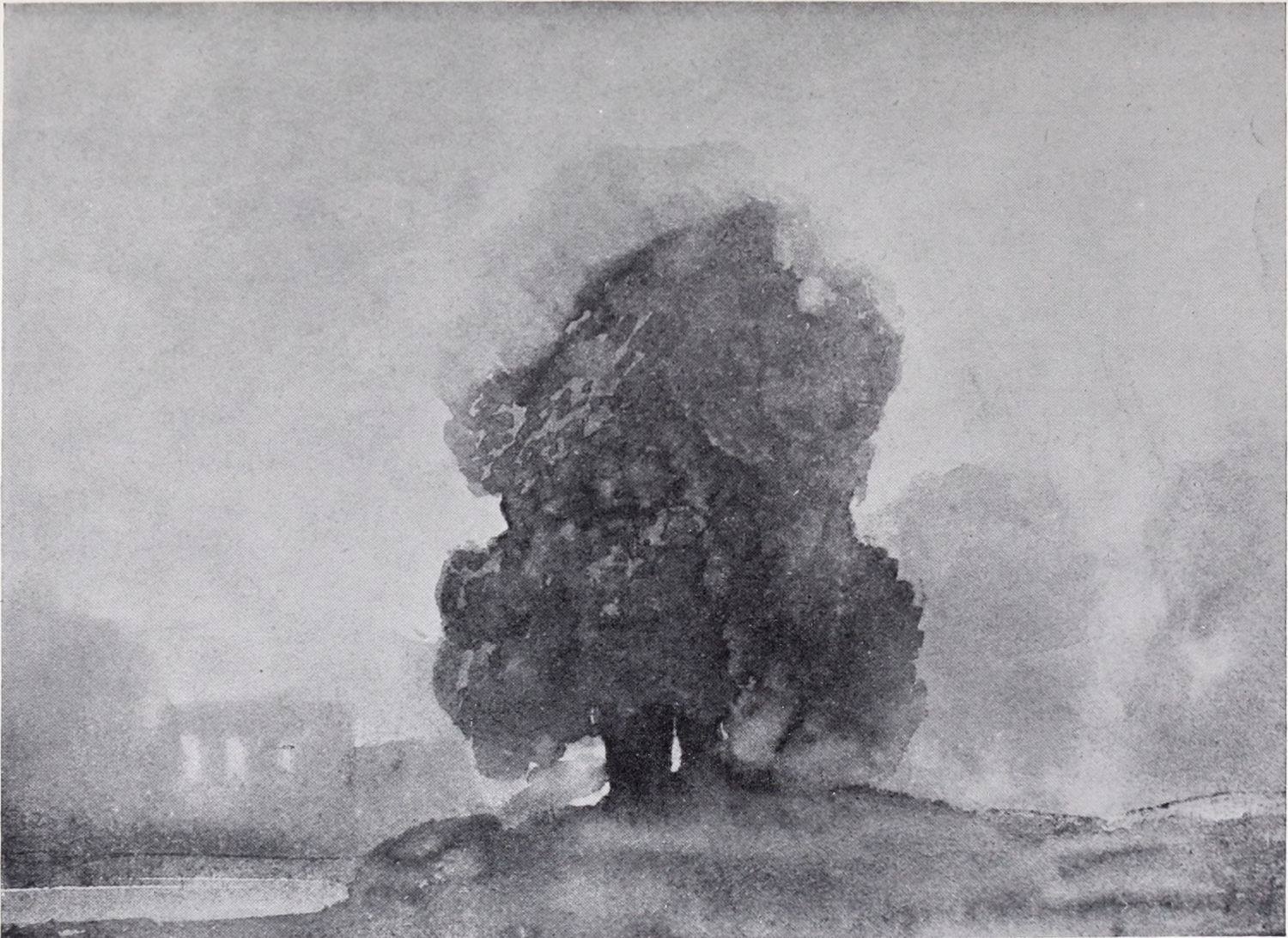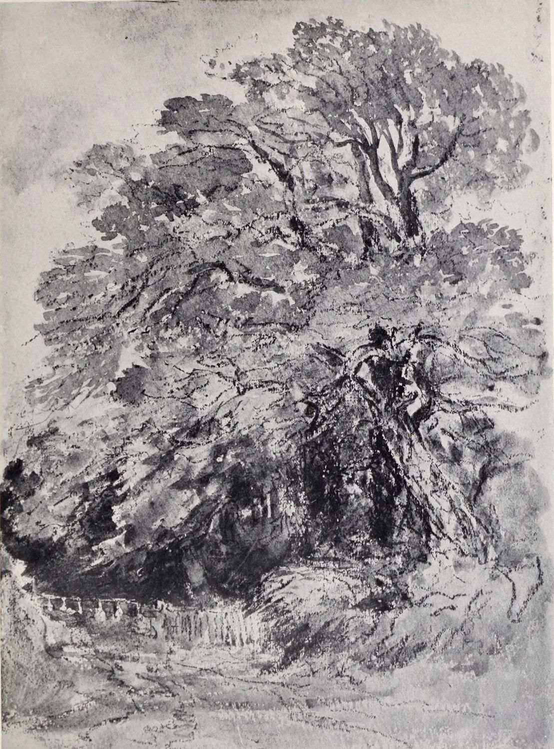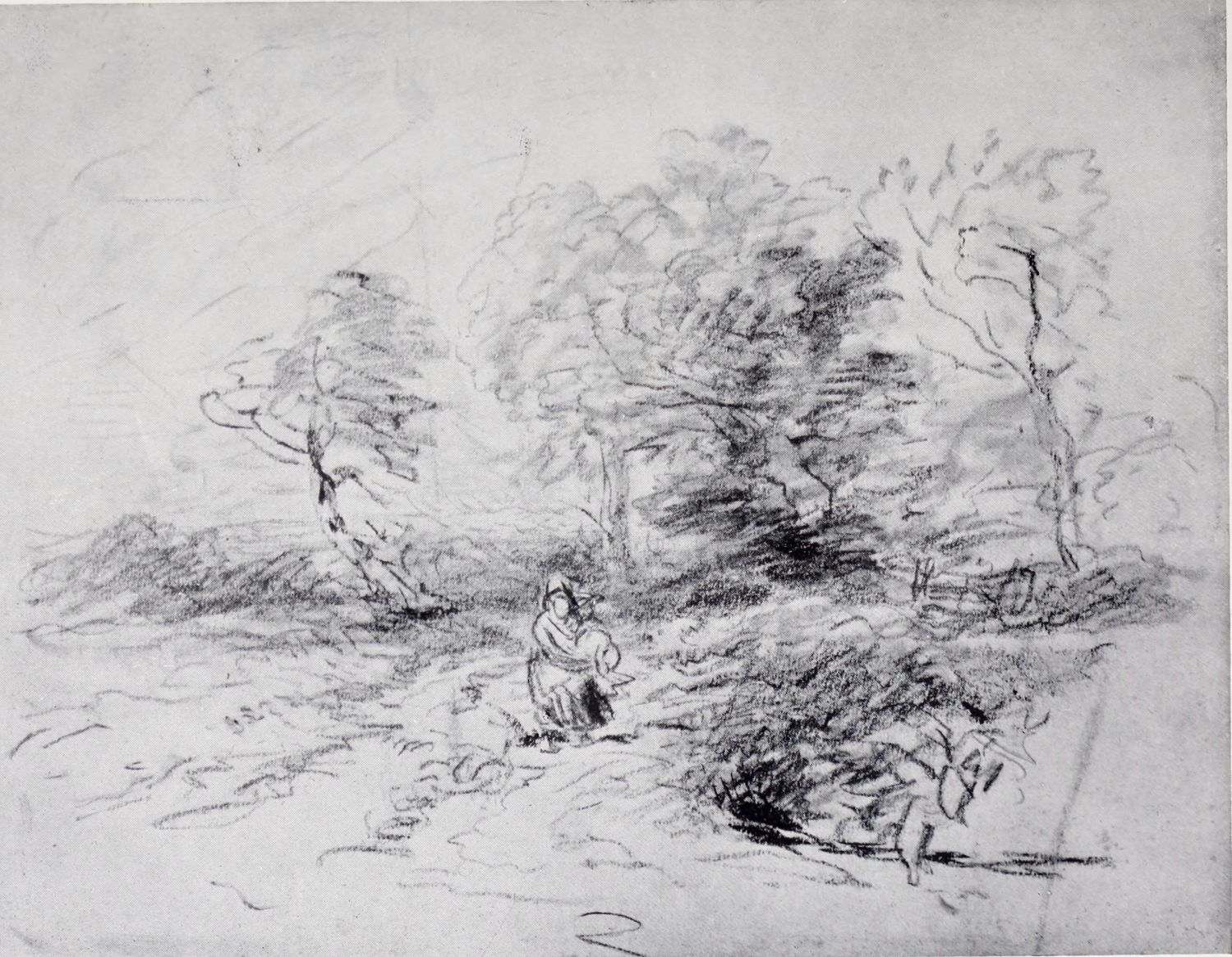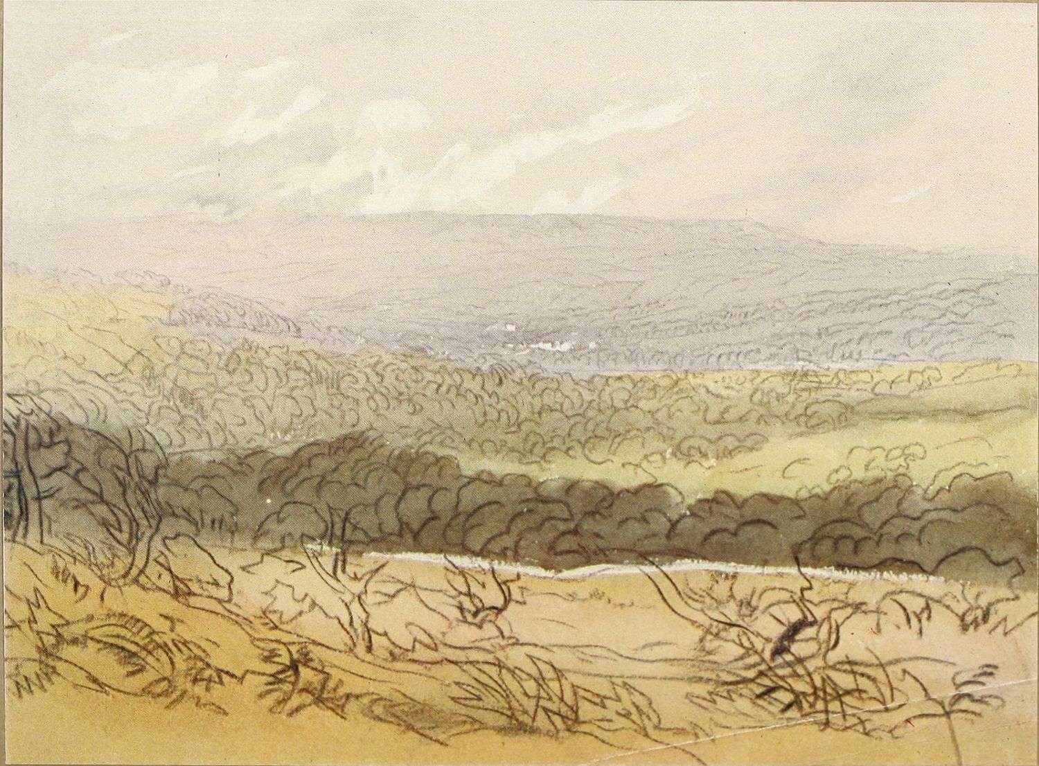Even now, however, we have not come to the end of Cox’s multifarious activities during this period. Besides being an amateur agitator and gardener, a prolific artist in water colour, and an overworked teacher, he seems to have turned author as well. In 1814 he published an educational work on landscape art, called: “A Treatise on Landscape Painting and Effect in Water-Colours, from the first Rudiments to the finished Picture, with Examples in Outline Effect and Colouring.” This was illustrated by a number of soft-ground etchings. It was followed, in 1816, by “Progressive Lessons in Landscape for Young Beginners,” a series of twenty-four soft-ground etchings without letterpress; and in 1825, his “Young Artist’s Companion, or Drawing-Book of Studies,” appeared. It was perhaps as a preliminary study for one of the illustrations to these volumes that the pen and ink drawing reproduced in Plate XIV. was made. At any rate the interest of these publications depends rather upon the illustrations than upon the letterpress, many of the etchings containing the first ideas of subjects which later had great success as water-colours; the etchings of Changing Pasture and Going to the Mill, for example, furnished the subjects of some of Cox’s latest paintings. It has also been rumoured that Cox was not entirely responsible for the letterpress, being indebted for assistance in its composition to some unknown “clergyman.” However this may be, it is pretty certain that the opinions must have been those which Cox himself held. And as the opinions of a great artist as to the aim and scope of his own art are always of interest it may be{14} advisable to quote a passage or two from these books, even though some other hand may have corrected the artist’s grammar and inflated his periods.