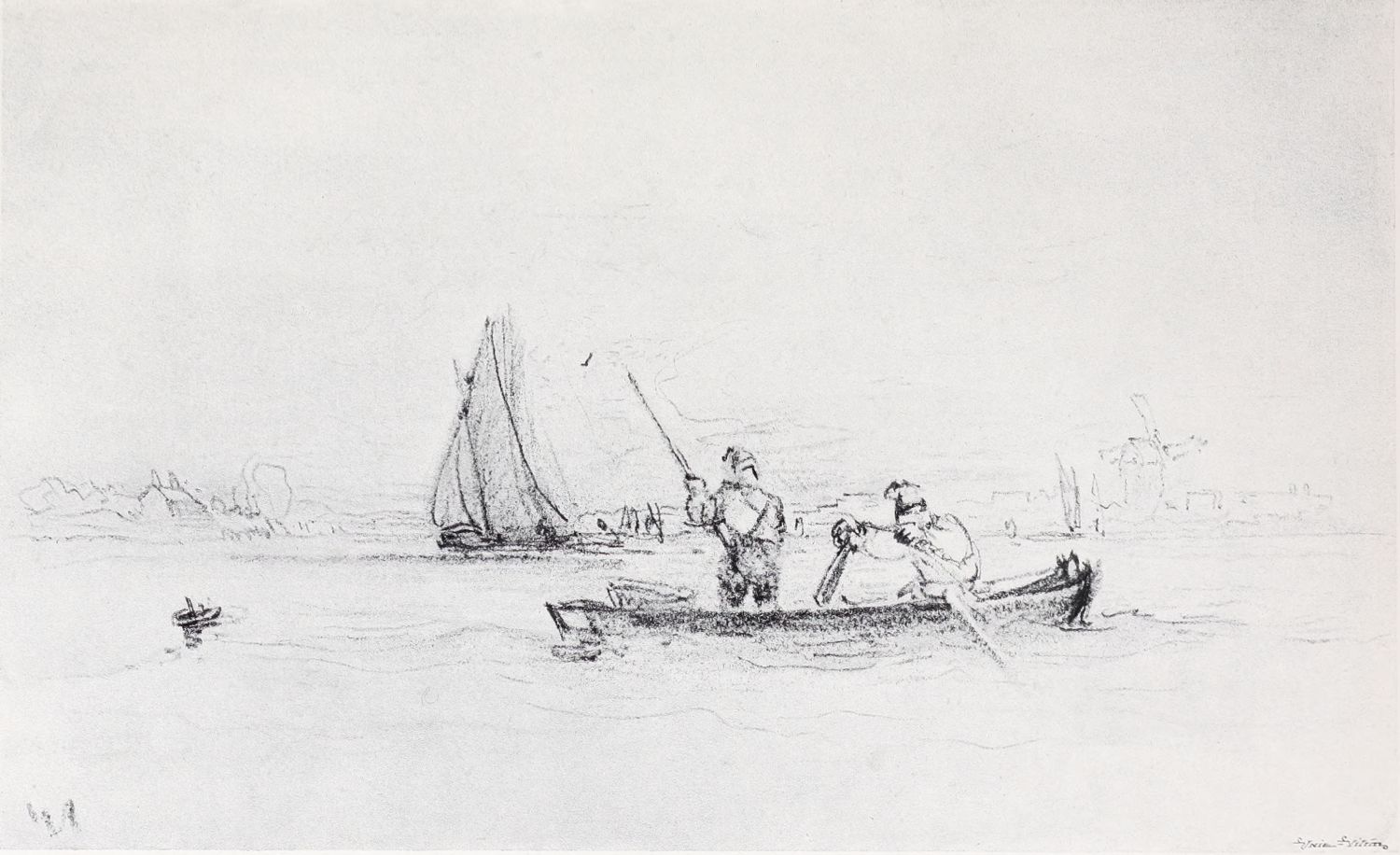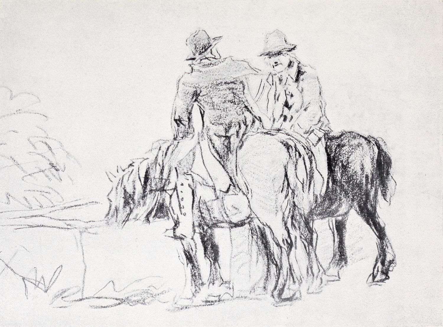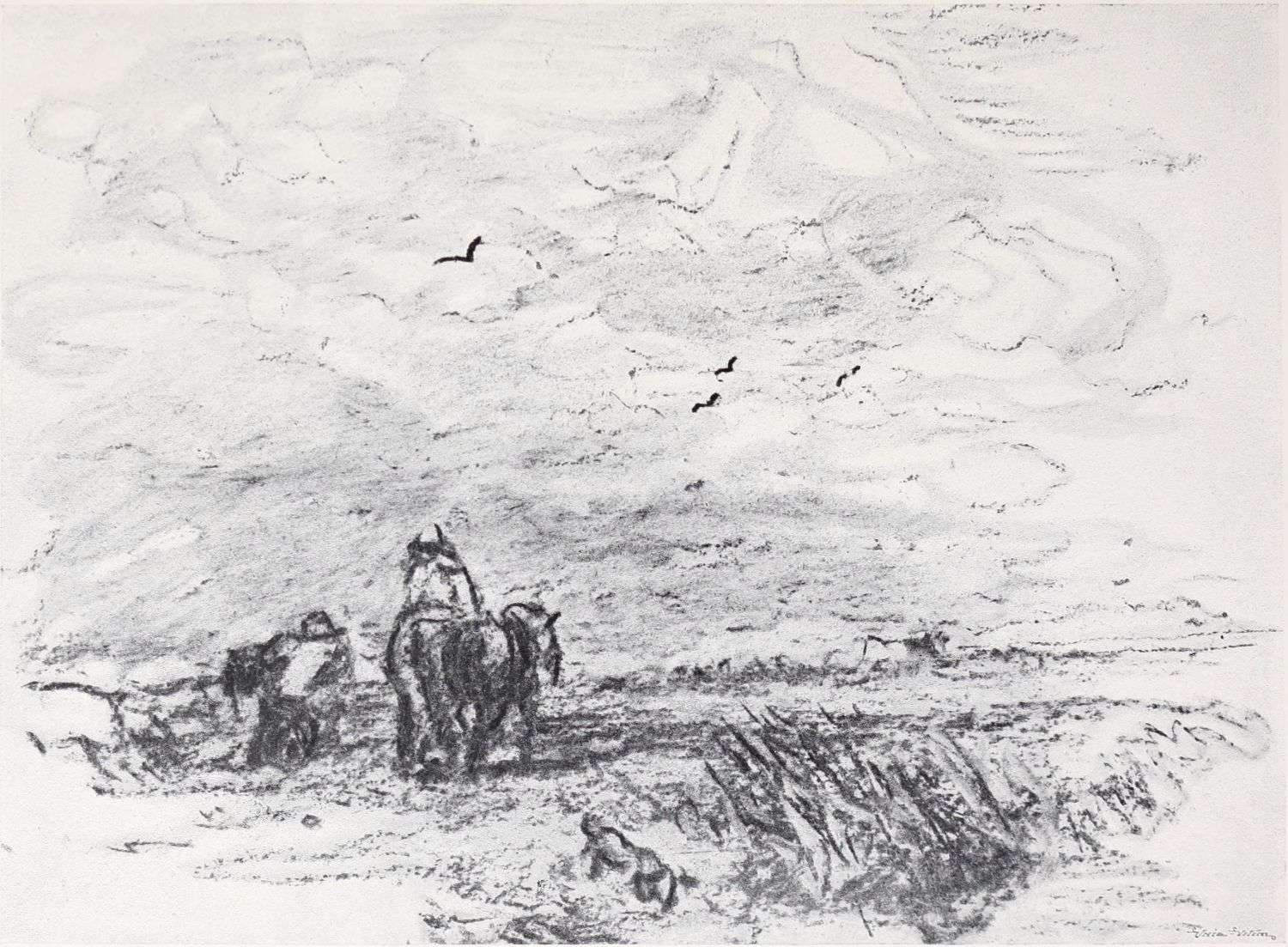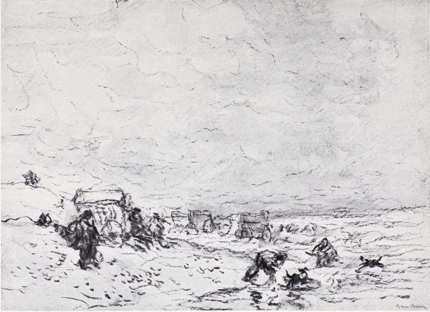 Reproductions of a number of charcoal and chalk sketches belonging to this later period of his life have been included in the present volume. Large charcoal drawings like The Salt Marsh (Plate XXV.), The Beach (Plate XXVII.), Windy Weather (Plate XXVIII.), and The Hill Side (Plate XXXIII.), lose something of their impressiveness when reduced in size, as these have necessarily been, but enough remains, even in this form, of their freshness, largeness of conception and sense of movement, to delight the intelligent amateur. No one at all susceptible to the higher beauties of art could remain insensible to the fascination of the bold, synthetic handling of The Peasants on Horseback (Plate III.). In some of these late sketches—notably in the two Near Kenilworth (Plates VII.{18} and XXIV.)—the loose, flowing touch often seems a trifle too disdainful of the individual forms of objects. But when the artist is serenely self-possessed his style is delightfully intimate and unbuttoned, a candid revelation of his sympathies and moods. When thoroughly interested he becomes astonishingly vivid and succinct, as in the Kirkby Stephen (Plate XX.), Llanrwst (Plate XVI.), and Clapham, Yorkshire (Plate XXII.). How much his art had become a matter of feeling and impulse is shown by the glaring way he fails when his sympathies have not been aroused; the draughtsmanship of the Architectural Study (Plate XXII.) is about as bad as draughtsmanship can well be—bald, perfunctory, external. The pencil and stump drawing of Carnarvon Castle (Plate XXX.), for all its lightness and charm of atmospheric suggestion, is “mappy” in draughtsmanship—its drawing being mere “spacing,” without intimacy in the form or sympathy with the structure. The drawing of Rotterdam (Plate XLI.) is again external and unsympathetic. These drawings might well have been chosen as illustrations of the truth of one of Cox’s own remarks: “Merely to paint” (or draw) “is not enough, for when no interest is felt nothing is more natural than that none should be conveyed.”