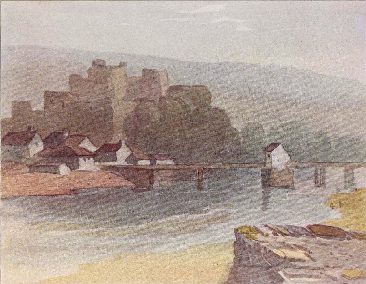 All the coloured reproductions in the present volume represent drawings made during the artist’s residence in Hereford. The Chepstow Bridge and Castle (Plate XII.) was probably one of the results of Cox’s first sketching tour after his removal, and this very drawing may possibly have formed one of the exhibits which he sent to the Society of Painters in Water-Colour in 1816. Plate XXIII. may represent the sketch made for the picture of Goodrich Castle on the Wye, which the artist exhibited in 1819. In both the drawings, as in the unfinished Frontispiece, the colour scheme is less severe than in the earlier Westminster. They are less like Girtin’s than like early Cotmans; and though they lack something of Cotman’s fastidiousness of selection, and the aristocratic charm of his draughtsmanship and design, they have a sobriety, reserve and seriousness of their own which must make them objects of delight to their fortunate possessor. The slightness of the execution of Low Tide (Plate XXXIV.) is no hindrance to the poignant expression of its sentiment. Unfortunately, it has not been found convenient to reproduce the magnificent—albeit unfinished—water-colour, entitled Autumn Woods, in its original colours. The half-tone reproduction (Plate XIX.), however, is useful as a suggestion of the simple dignity that reigns in this beautiful drawing—assuredly one of the finest works produced during the artist’s residence in Hereford.
