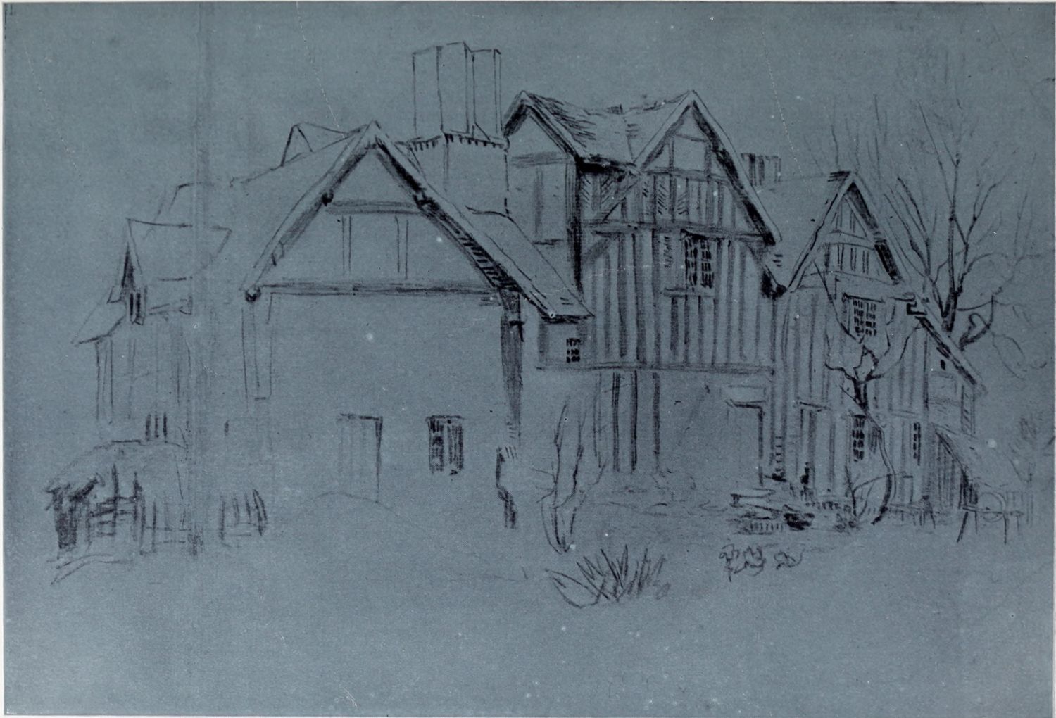 Nearly every year during his residence in London, Cox made a journey to visit his old father and his other friends at Birmingham. The sketch book he used on his 1810 visit is still in existence, and Plate XVIII., a drawing of some half-timbered houses “near Birmingham,” represents the contents of one of its pages. The drawings are all made on rough blue paper; and among the other subjects contained in this singularly interesting book are some striking studies of scenes down a mine at Dudley, and sketches at and near Kenilworth. The handling is not so loose as in Cox’s later work;{11} but what the drawings lack in freedom is more than compensated by their directness and admirable restraint, as our reproduction amply proves.