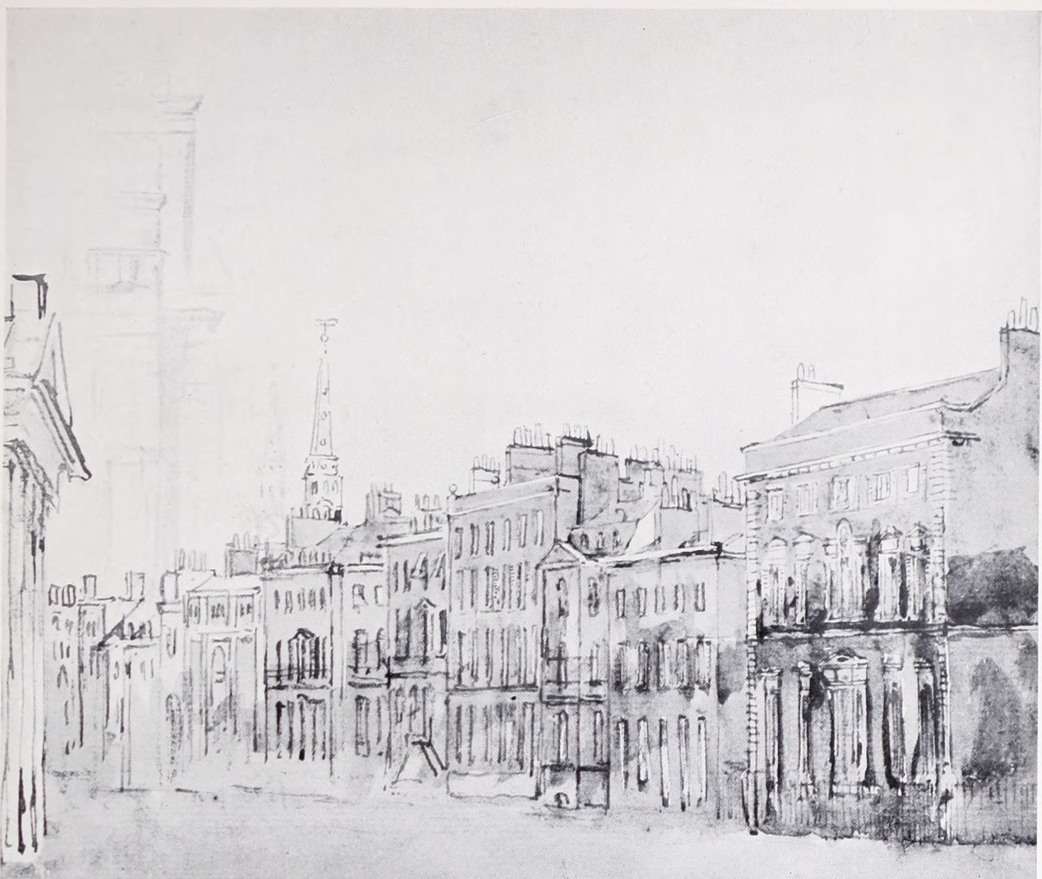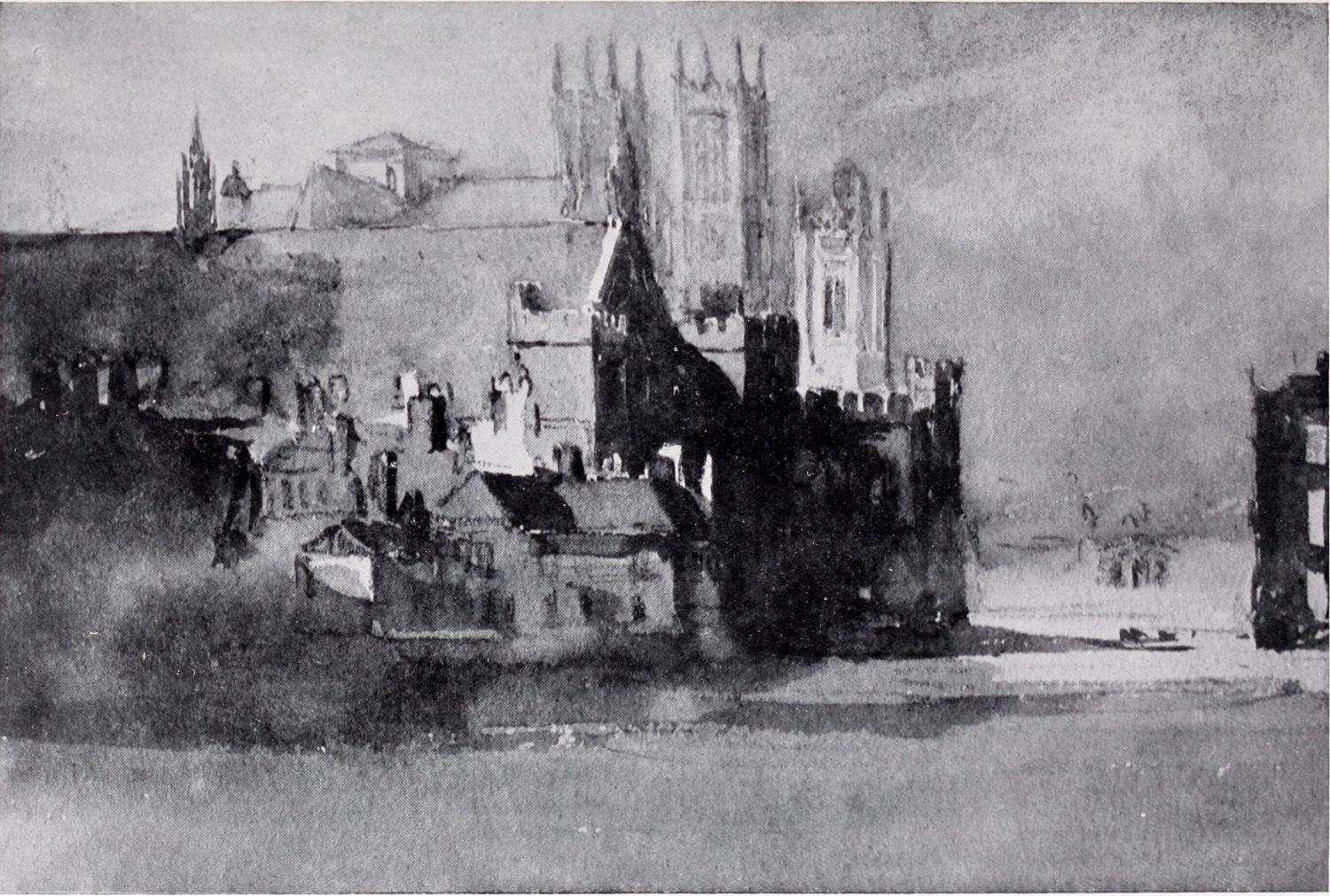 In pursuance of this plan of appropriating what he could from the practice and methods of the proficients in the art, Cox determined to take lessons from the living as well as from the dead. For some time his choice hesitated between John Varley, John Glover, and William Havell. He finally decided to go to Varley, who treated him with much kindness. Varley, who was only five years older than Cox, was one of the most successful teachers of the time, and, in addition to Cox, he numbered Mulready, W. H. Hunt, Linnell, Samuel Palmer, Copley Fielding, and De Windt among his pupils. His early manner was modelled largely on the practice of John Cozens and Girtin; and the simplicity, directness and dignity of much of Cox’s early work is certainly due to the thoroughness{10} with which Varley had mastered the traditions of the earlier English water-colour painters, and to his capacities as a teacher. The second plate in this volume is a reproduction of one of Cox’s drawings of this period. The original water-colour, Old Westminster, is probably one of the most successful of Cox’s purely architectural drawings; it might almost pass for a Girtin.
