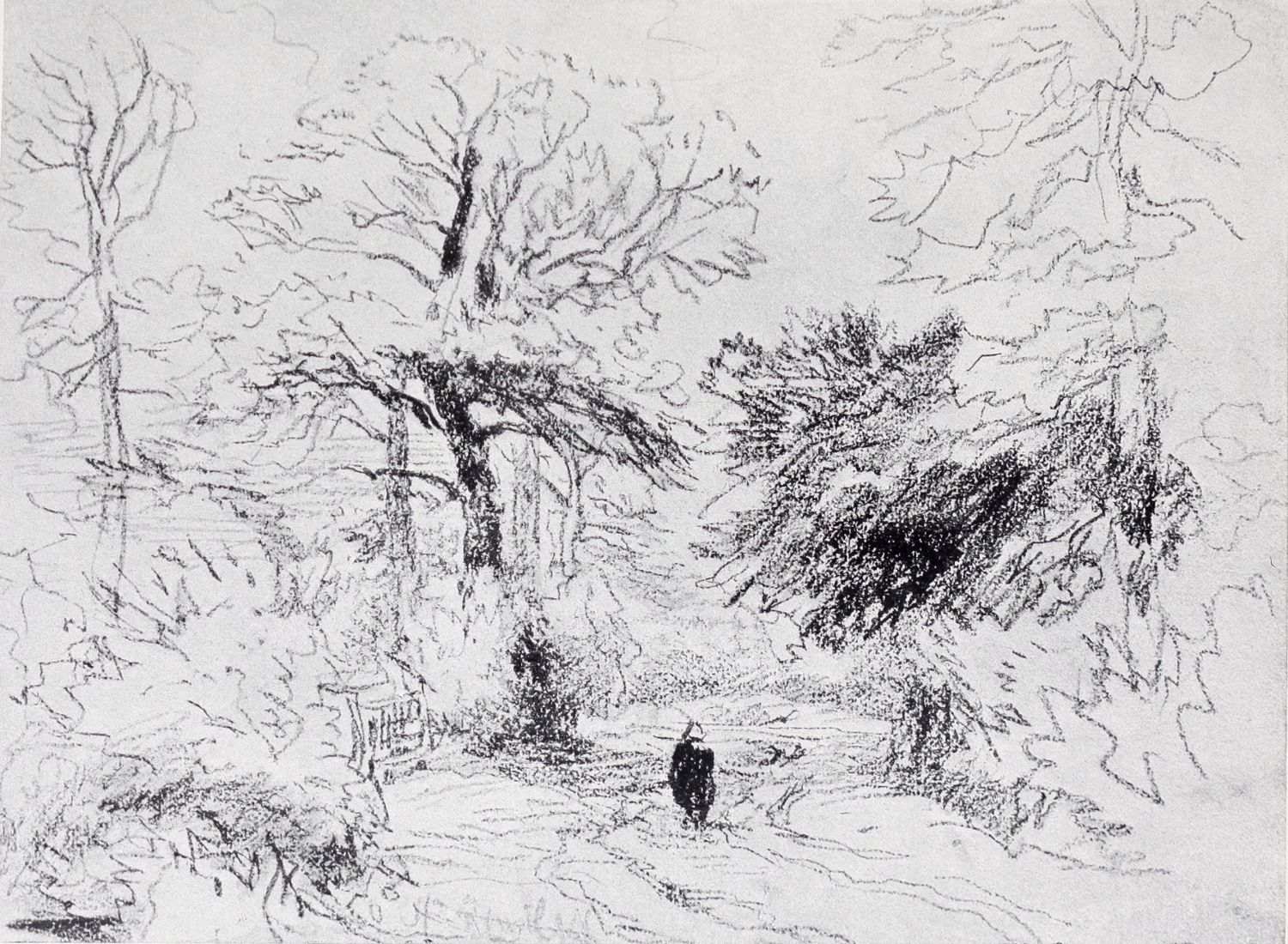 “In the selection of a subject from nature the student should ever keep in view the principal object which induced him to make the sketch, whether it be mountains, a castle, group of trees, a cornfield, river scene, or any other object. The prominence of this leading feature in the piece should be duly supported throughout; the character of the picture should be derived from it; every other object introduced should be subservient to it, and the attraction of the one should be the attraction of the whole. The union of too great a variety of parts tends to destroy, or at least to weaken, the predominance of that which ought to be the principal of the composition, and which the student, when he comes to the colouring, should be careful to characterise by turning upon it the strongest light. All objects which are not in character with the scenes should be most carefully avoided, as the introduction of any unnecessary object is sure to be attended with injurious consequences. This must prove the necessity of becoming thoroughly acquainted with and obtaining a proper feeling of the subject. The picture should be complete and perfect in the mind before it is ever traced upon canvas. Such force and expression should be displayed as would render the effect at the first glance intelligible to the observer. Merely to paint is not enough, for when no interest is felt nothing is more natural than that none should be conveyed.”