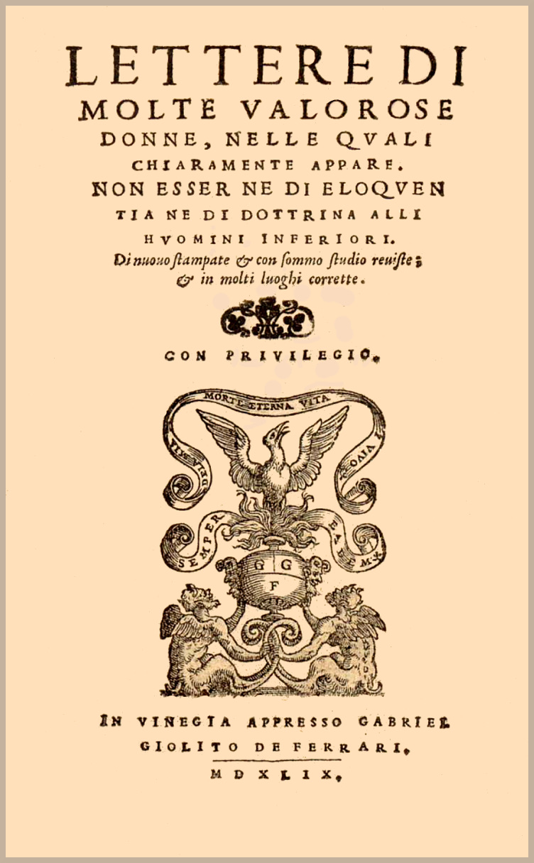 Havendo in un picciol volume ridotto molte lettere, da vari luoghi raccolte et da savie donne scritte, per publicarle poi al mondo per opra di diligente impressore: hò fra me stesso pensato esser quasi di necessità il dargli alcun protettore di molta autorità & di molto giudicio ornato; & questo accioche le maligne lingue nemiche de gli honori feminili, sbigottite si rimanessero di mordere, [2-v] et di lacerar le Donne, anzi letto che si havessero coteste lettere, imparassero hormai à riverire et honorare questo nobilissimo sesso: ne hò saputo per hora, dove meglio ricorrere che à voi, il quale, di cortesia, & di lealtà potete fronteggiare con il piu honorato Cavalliere che il Sol vegga, ò che la terra calchi, à voi adunque le dedico, & à voi per conseguente toccherà la difensione contra la nequitia de Calumniatori (se alcuno ne apparirà) ne altro intorno a ciò mi accade dirvi. Iddio da mal vi guardi. Di Vinegia alli XXIII di Ottobre. [3-r]