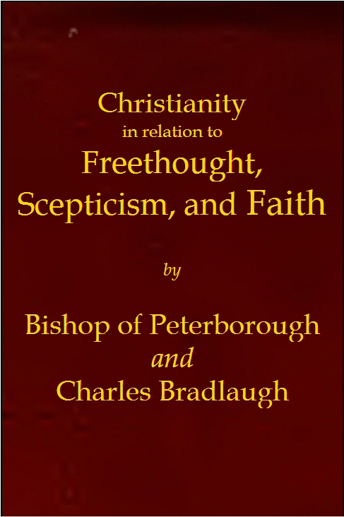 In treating the subject of “Christianity and Freethought,” in reply to the address of the Bishop of Peterborough, I am entitled to narrow, and shall narrow, the question covered by this reply, to one merely between the Freethinker and the Church of England Christian only. The litany, hymns, and prayers which formed the preface to the Bishop’s advocacy are here fair weapons to use against him. I do not stand here to-night to plead against Roman Catholic Christianity, or against Wesleyan, Independent, or Baptist nonconforming Christianity, nor do I plead against Unitarian Christianity. I am here to reply to the Church and State Christianity, the thirty-nine articles Christianity; to the system with which the Lord Bishop of Peterborough has identified his brilliant talents and great powers of speech, and with all the faults and corruptions of which he must rest burdened so far as this controversy is concerned. Here he must not throw aside any one of the three Creeds, here every line of the Prayer Book affects his teaching. The Christianity he must defend is that which the 9 and 10 William IV., cap. 32, maintains; the Christianity by law established.