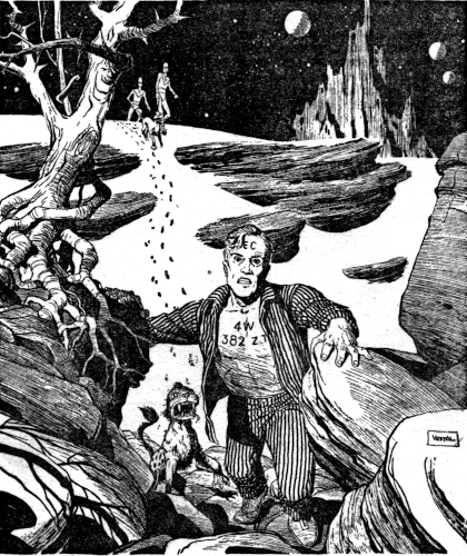 "There are a few settlements," answered the warden. "Mostly space rats and prisoners whose terms have been served but who do not want to go back to Earth. And the space pirates have bases on some of the moons and contacts with the villagers. If he gets to a settlement they will hide him until the space pirates take him in. But he can't escape the mertha."