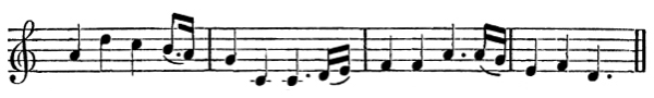 This type is more observable among savage tribes than among civilized nations. Folk-song is therefore not so permanent among the former as it [Pg 12] is among the latter. So far as we can gather, though it is difficult to get at the truth of this matter, among primitive people the savage does not appear to retain his song-traditions, but invents new lyrics as occasion calls. For example, one is continually reading in books of travel of negroes, or natives of wild countries, chanting extemporary songs descriptive of things which have been the happenings of the day, and telling of the white man who has come among them, of the feast he has provided, of the dangers they have encountered during the journey, and so forth. The tunes of these songs appear to be chiefly monotonous chants, and the accompanying music of the rudest character, produced on tom-toms, horns, reed-flutes, or similar kinds of instruments. A very typical description of this class of folk-song, the like of which may be found in most books of travel, occurs in Day’s Music and Musical Instruments of Southern India and the Deccan. The author says:—