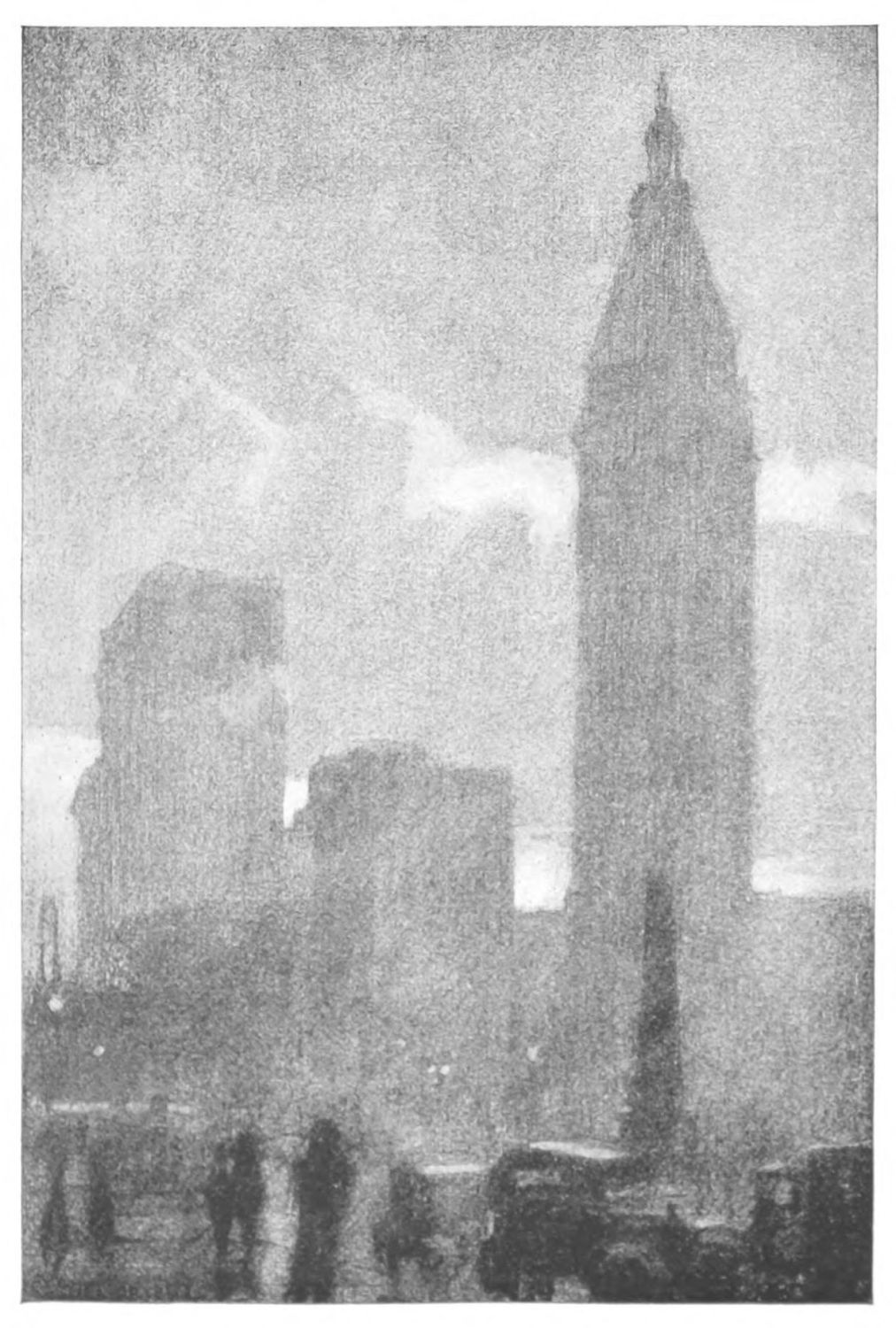 Hopkinson Smith once said that Venice is nothing but air and water. There all else has been so softened and moulded and enveloped as to become part and parcel of sea and cloud. The portrayal of this is preëminently a painter’s job. But New York, in addition to being a lot of other things, is a Venice in the making, and all the ugly paraphernalia by means of which this making is slowly going forward, all the unlovely processes, physical and chemical, structural and commercial, must be recognized and expressed and by the light of poetic vision be made a part of its beauty and romance.