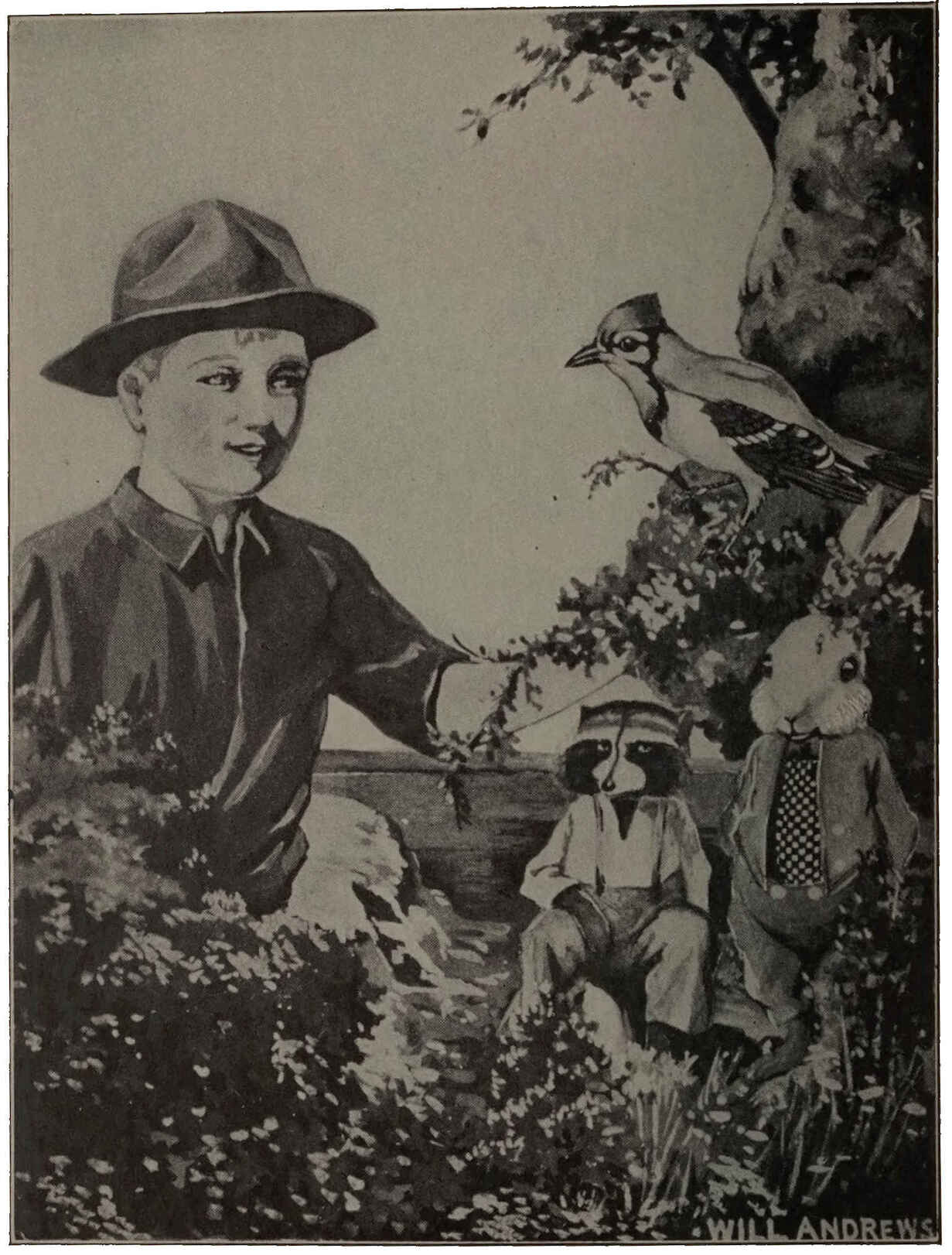 Prob’ly you’re all wondering what happened to Chaik Jay and Tad Coon when the big rain began to fall. Chaik had hurt his wing. He’d have had a bad time with it if he’d tried to stay in the pickery thorn bush, in the Quail’s Thicket, down by Dr. Muskrat’s Pond. Tad Coon knew a thing or two when he advised the bird to let Louie Thomson catch him. Well, when Louie burst into his mother’s kitchen with Chaik holding on tight to his fat, warm finger he was ’most bursting with pride. You know just how you’d feel if you were Louie. Chaik felt just a little fluttery, but he knew he was safe so long as the little boy held him. He waved his well wing and put up his crest, but he never let go his hold on the funniest perch he’d ever sat on.