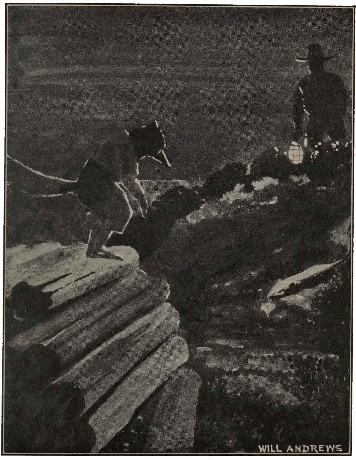 Pit-pat, pit-pat, swish. Tad could hear him coming, dragging his chicken. In one lantern swing his eyes lit up like the headlights of a little automobile, and he saw Tad’s ears, pointed right toward him. He dropped his bird and jumped at the very same breath as Tad Coon. In the next swing Louie Thomson’s father saw the white feathers lying on the ground—and he saw the fluffy tail and frilly fur pantaloons of Tad Coon diving down a big crown crock for a drain he was just going to dig.