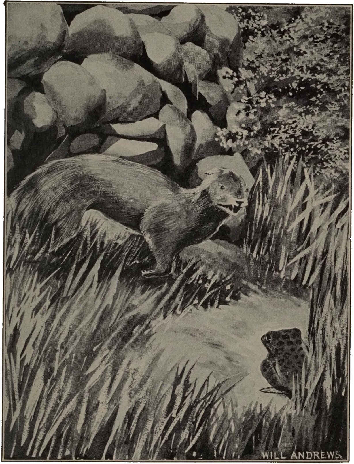 But they didn’t need him. Killer had gone padding up and down the banks of Doctor Muskrat’s pond looking for tracks of someone he could eat, and he’d left his own. He’d left a clear trail from the Hop-toad’s home to his own. “Lessee who’s here!” said Tommy Peele. He tried to lift one of Killer’s big stones.