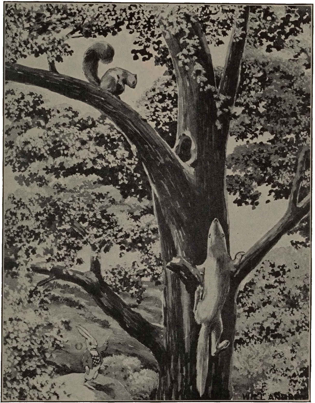 When he came out his nose was beginning to swell, but it wasn’t so swelled that he couldn’t smell Tommy and Louie, hunting for him. His eyes were beginning to close, but they weren’t shut so tight he couldn’t see them. He turned his head to look and ran right spang into Tad Coon’s tree. Up it he climbed and out across the limb where Chatter Squirrel comes over from his hickory when he wants a drink from the pond. Up that he climbed—high up. He wanted to squint across the bare limbs to see where the squirrel roads ran so he could follow them through the tree-tops.