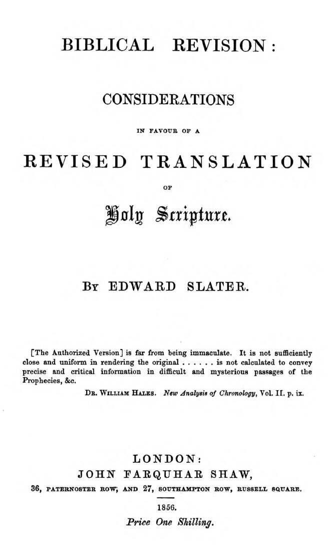 Thus far we have been occupied in clearing our ground, and essaying a hearing, with what chance of success we might, considering the outcry, more or less reasonable, with which the question before us is usually met. We take no further notice of the objections to our task, and proceed to explain more distinctly in what that task consists. But, first of all, we must premise, that we contemplate a “revised” p. 10rather than an entirely “new” version. Certain feelings have entwined themselves round the stock of the present version which it would not be safe or needful to sever, except where the imperious demands of fidelity to the sense necessitate the infliction.
