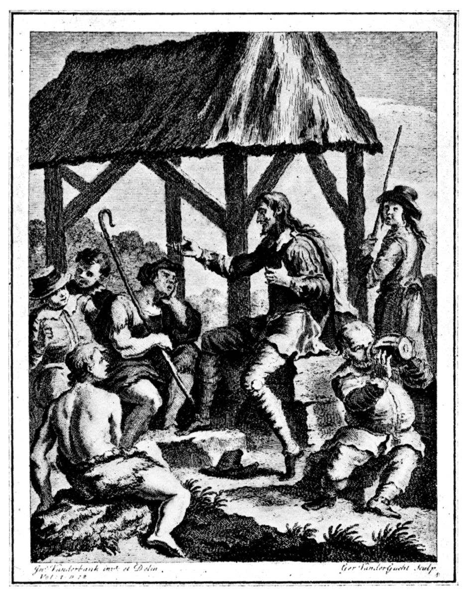Cervantes was still a stripling when he first evinced that interest in the acted drama, which he never entirely lost. Lope de Rueda, who did so much to produce order out of chaos in the drama of Spain, was at that time an actor-manager at the head of his own company of strolling players. It was this gold-beater of Seville, “admirable in Pastoral Poetry,” distinguished alike “for his acting and for his intelligence,” who brought comedies “out of their swaddling clothes and gave them habitation, and attired them decently and handsomely.” Cervantes must have attended the performances of the Rueda Company when they were in the neighbourhood of Segovia, in 1558; and in the preface to his volume of Comedies and Farces, published a year before his death, he gives us some interesting particulars of the theatrical impedimenta in use at that time. The performances were given in the morning and afternoon in the public square, and the only decoration{7} of the theatre was “an old blanket drawn aside by two ropes, which made what they call the green-room; behind which were the musicians, singing some old ballad without a guitar.” The properties consisted of “four benches arranged in a square, with five or six planks on top of them, raised but four handsbreadth from the ground;” while the whole apparatus of a manager of plays, was contained in a sack, and consisted of “four white sheep-skin dresses, trimmed with gilt leather, and four beards, wigs, and crooks, more or less.”