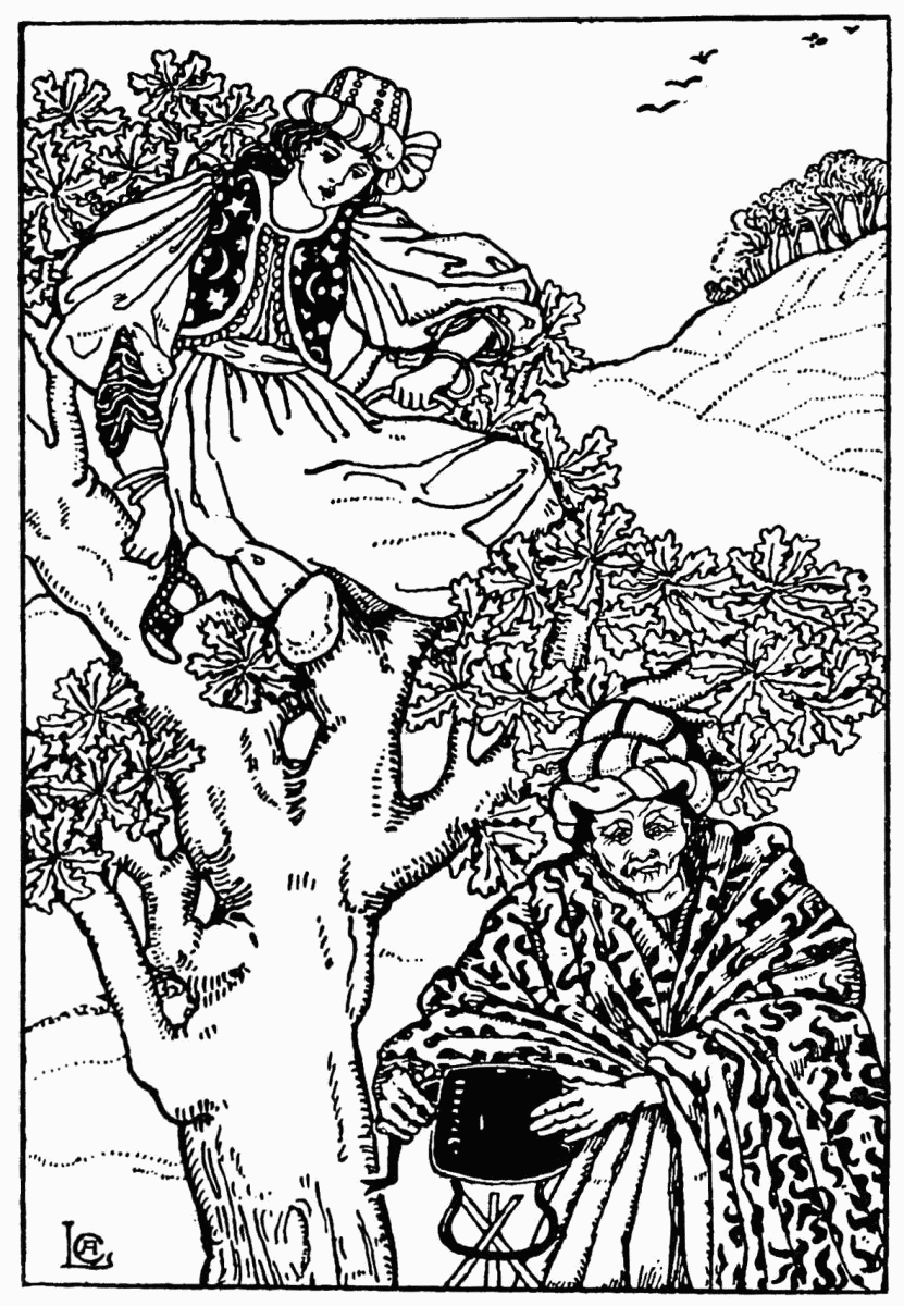 The Moor-girl looked up, and when she saw the wondrously beautiful shape of the damsel in the tree, she climbed up beside her and spake coaxing words to her: “Oh, my little golden damsel, thou wilt get the cramp from crouching there so long; come, rest thy head!” And with that she laid the damsel’s head on her breast, felt in her bosom, drew out a needle, pricked the damsel with it in the skull, and in an instant the Orange-Damsel was changed into a bird, and pr-r-r-r-r! she was gone, leaving the Moor all alone in the tree.