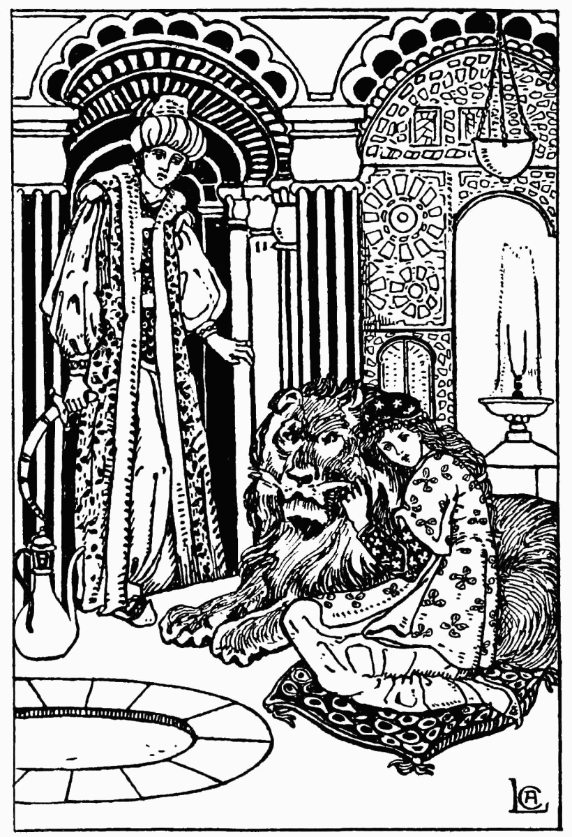 Now there was a beautiful garden in the palace, with a fountain in the midst of it, and there the Sultan’s damsel used to walk about. One day, with a golden saucer in her hand and a silver sandal on her foot, she went towards the great fountain, and the black slave followed after her and pushed her in. There was a big fish in the basin, and it immediately swallowed up the Sultan’s pet damsel. Then the black slave returned to the palace, put on the golden raiment of the Sultan’s damsel, and sat down in her place.