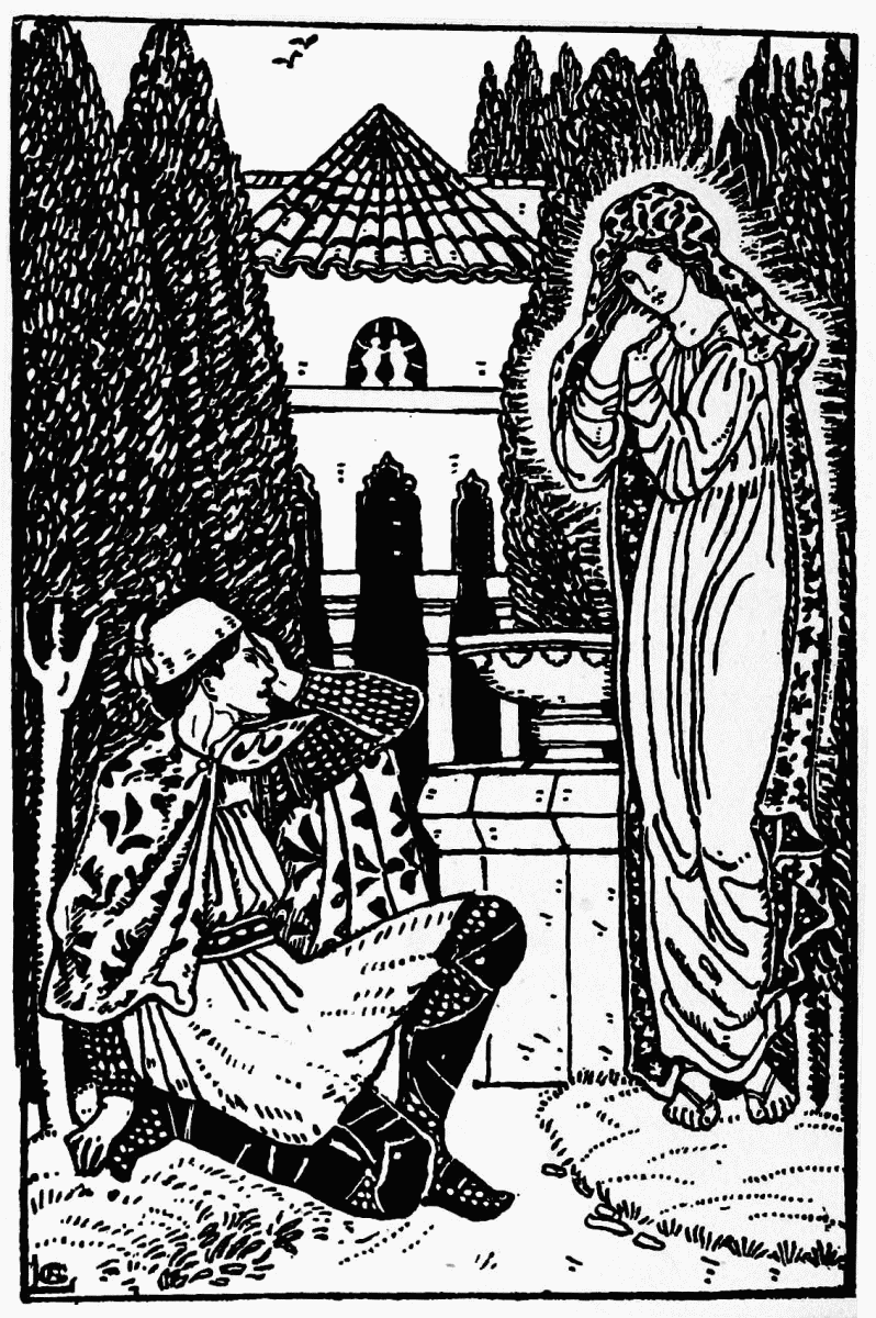 “Thou art downright crazy,” replied her mistress, drew out a mirror, and showed it to her; and when the Moor-girl saw her face in it, she took up another pitcher and went to the fountain for the third time.{24} The damsel’s face again appeared in the water, but just as she was about to break the pitcher again, the damsel called to her from the tree: “Break not thy pitchers, ’tis my face thou dost see in the water, and thou wilt see thine own there also.”