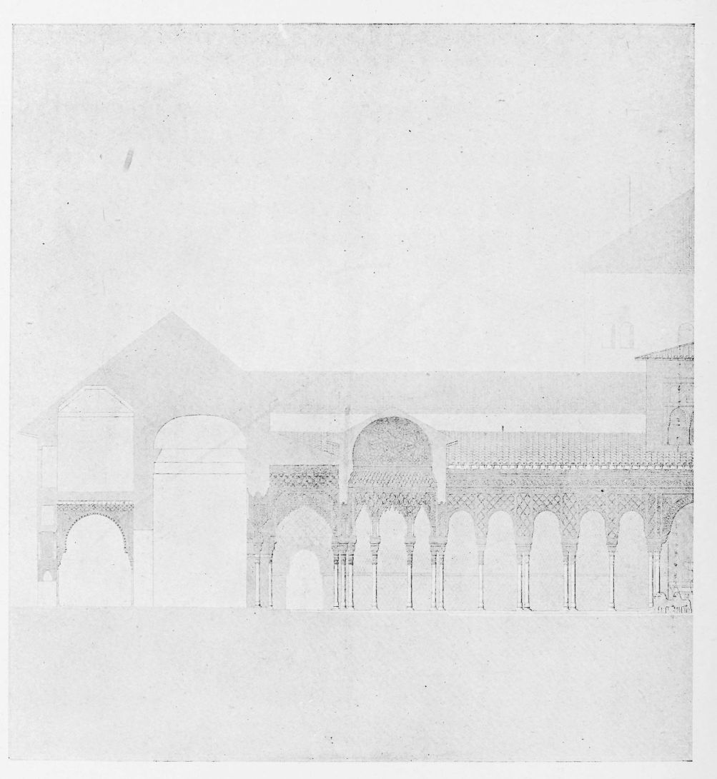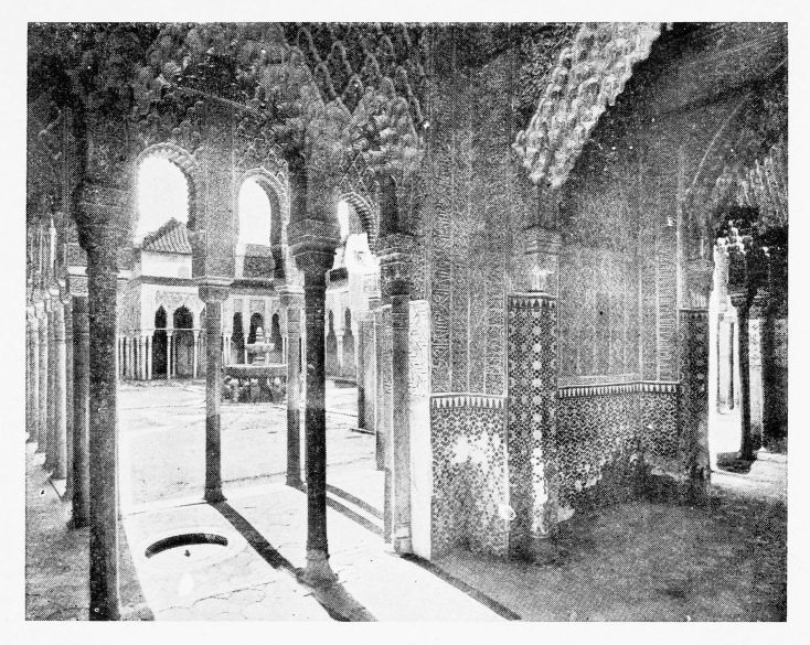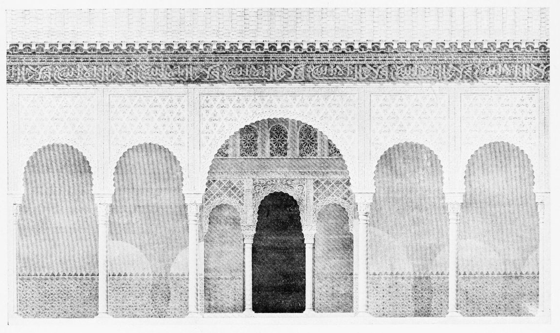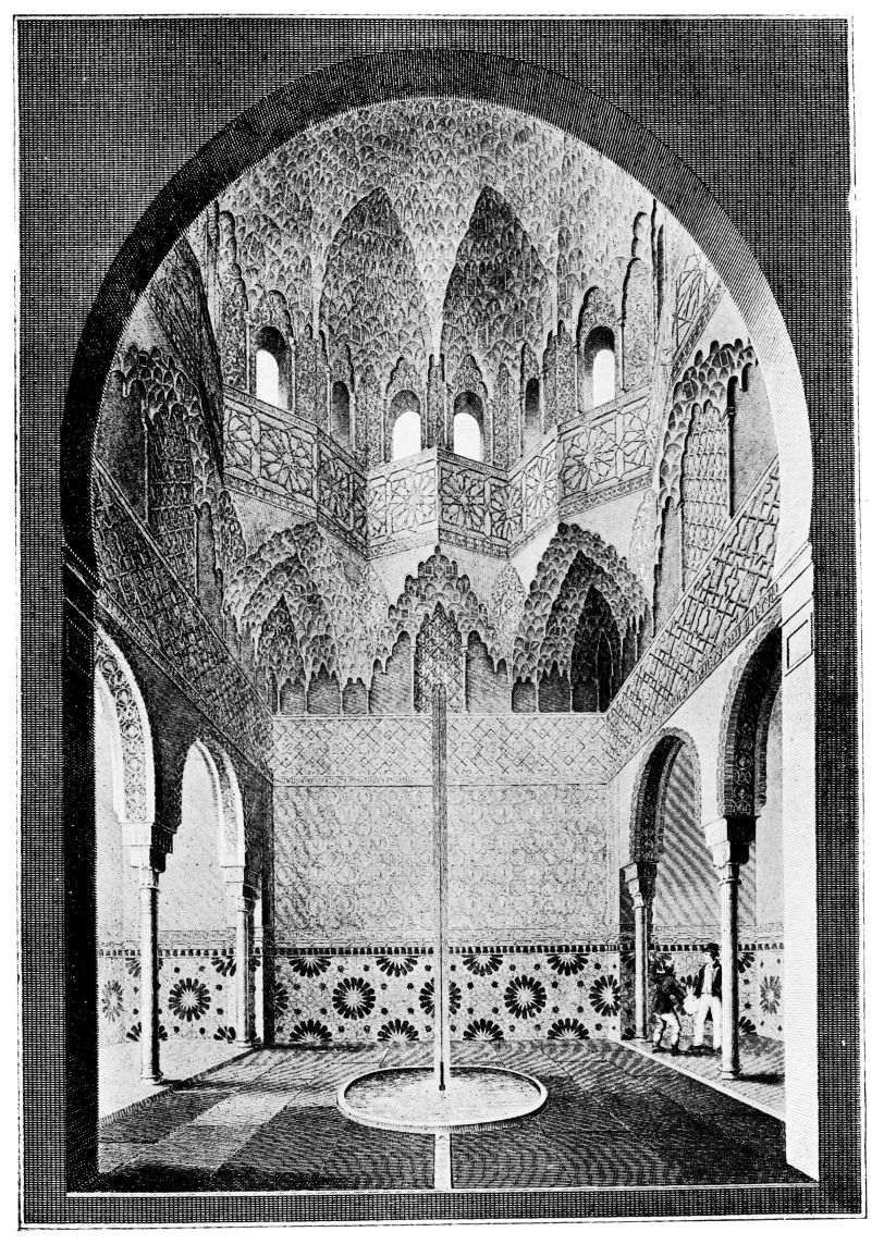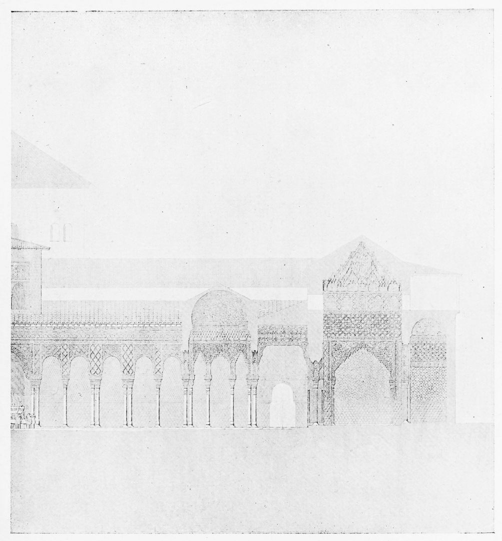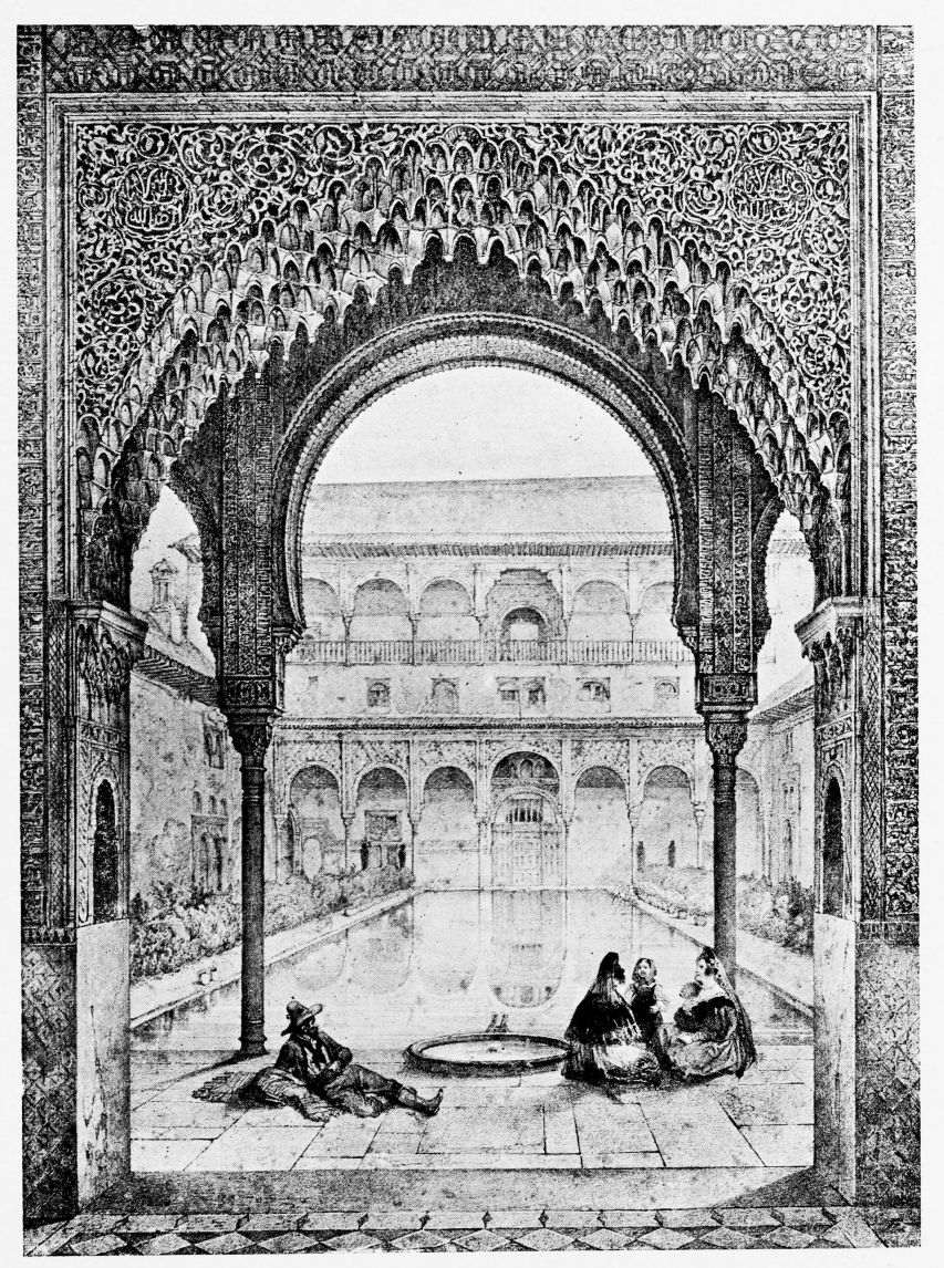 Don Mariano Contreras, Conservator of the Alhambra, the son of the gifted Raphaël Contreras, who devoted thirty-seven years of his life to the restoration of the Palace—gave me the benefit of his knowledge of this unique treasure-house of art; and I have also laid under contribution the beautiful plates of Owen Jones, who disposed of a Welsh inheritance in order to produce his great work on the Plans, Elevations, Sections and Details of the Alhambra. Jones’s Grammar of Ornament, which has been described as “beautiful enough to be the horn-book of the Angels,” also contains the result of his researches in the Alhambra, which occupied him for the greater part of eleven years. A selection of these illustrations is here rescued from the obscurity of public libraries and the inaccessible recesses of private collections. The inclusion of John F. Lewis’s drawings, and the reproduction of a series of pictures by James C. Murphy, who spent seven years in the study of the artistic marvels of the Alhambra, I do not feel called upon to defend. The photographs, several of which were placed at my disposal by Don Rafaël Garzón, represent the buildings as they appear to-day; the drawings were made before the Palace was damaged by the disastrous fire of September, 1890.{ix}