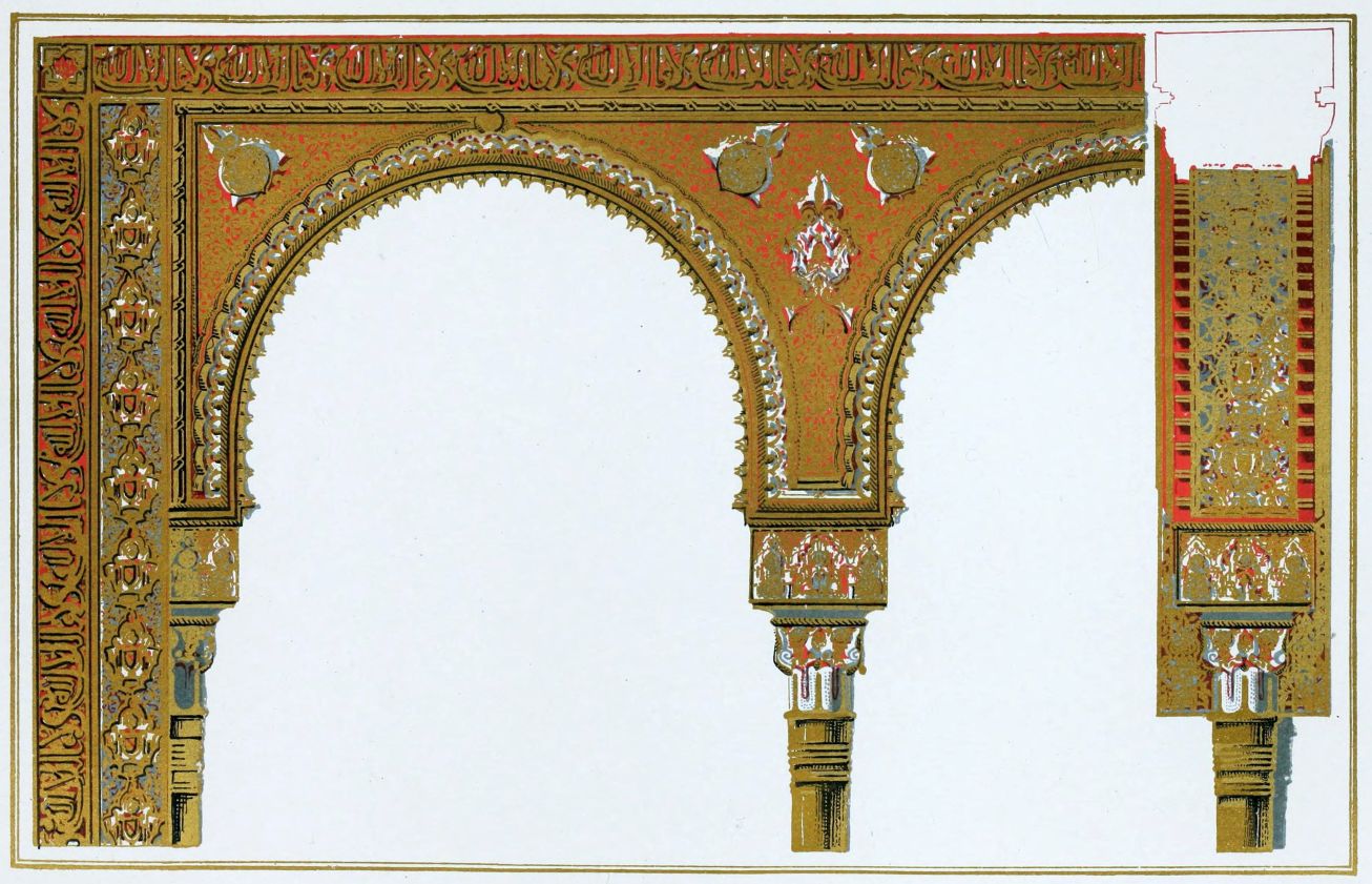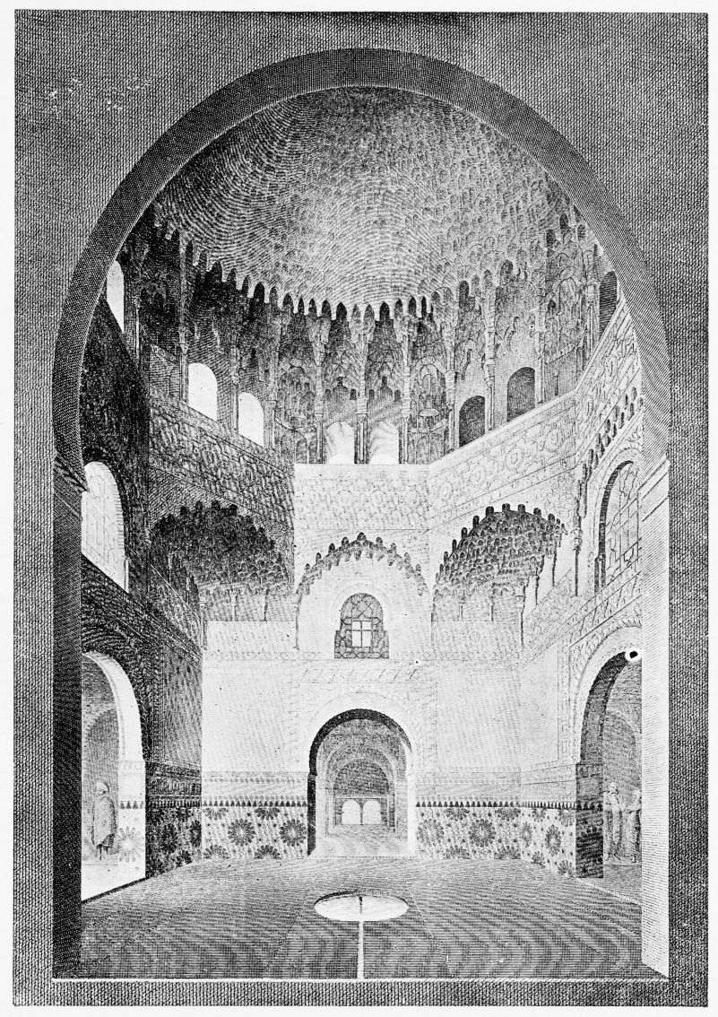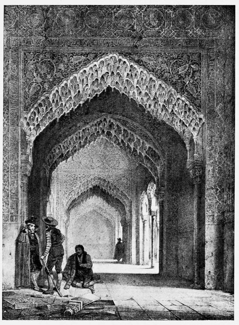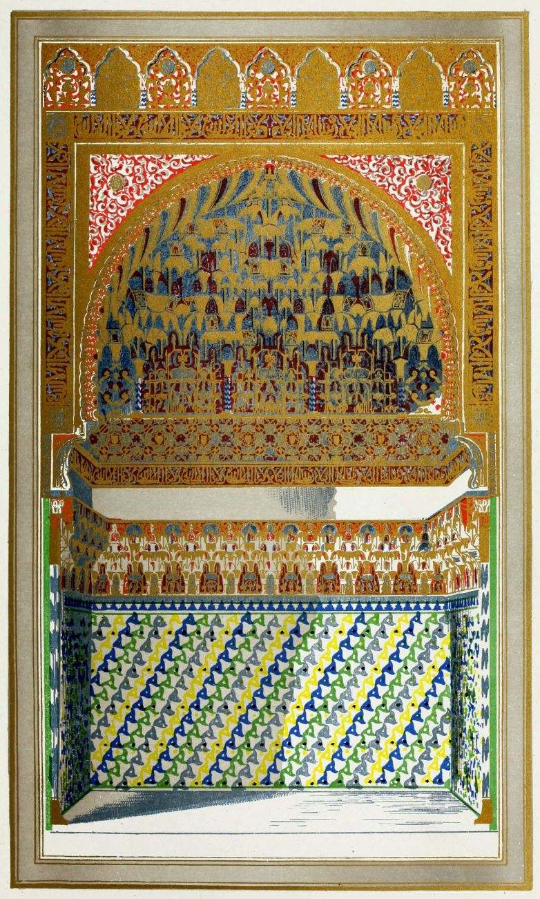 Don Mariano Contreras, Conservator of the Alhambra, the son of the gifted Raphaël Contreras, who devoted thirty-seven years of his life to the restoration of the Palace—gave me the benefit of his knowledge of this unique treasure-house of art; and I have also laid under contribution the beautiful plates of Owen Jones, who disposed of a Welsh inheritance in order to produce his great work on the Plans, Elevations, Sections and Details of the Alhambra. Jones’s Grammar of Ornament, which has been described as “beautiful enough to be the horn-book of the Angels,” also contains the result of his researches in the Alhambra, which occupied him for the greater part of eleven years. A selection of these illustrations is here rescued from the obscurity of public libraries and the inaccessible recesses of private collections. The inclusion of John F. Lewis’s drawings, and the reproduction of a series of pictures by James C. Murphy, who spent seven years in the study of the artistic marvels of the Alhambra, I do not feel called upon to defend. The photographs, several of which were placed at my disposal by Don Rafaël Garzón, represent the buildings as they appear to-day; the drawings were made before the Palace was damaged by the disastrous fire of September, 1890.{ix}