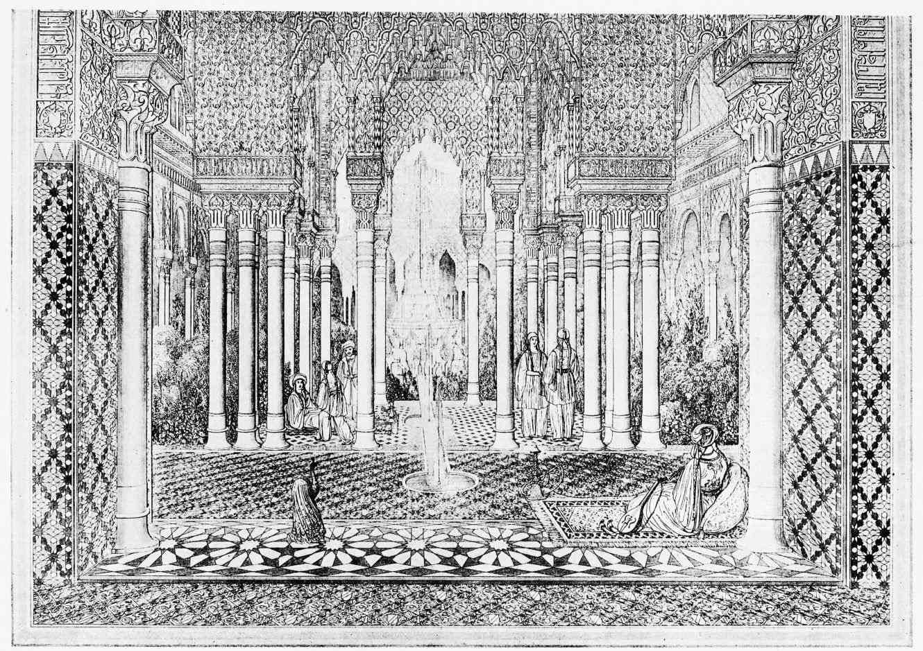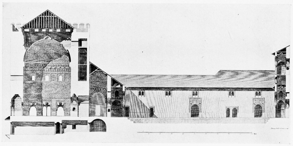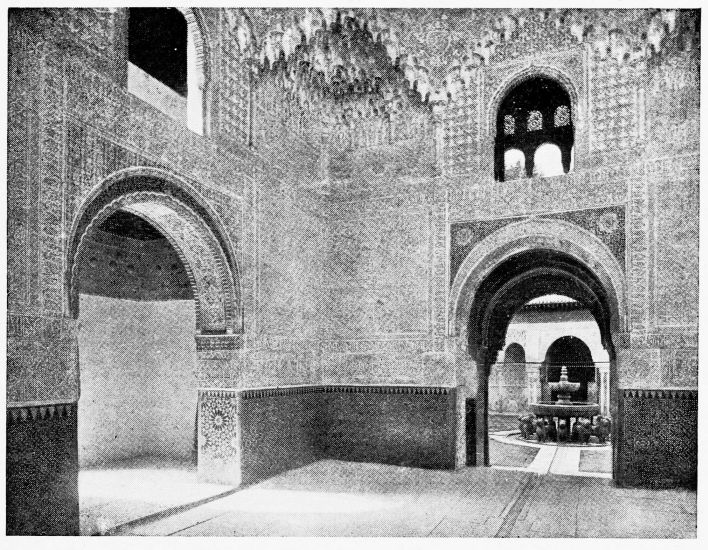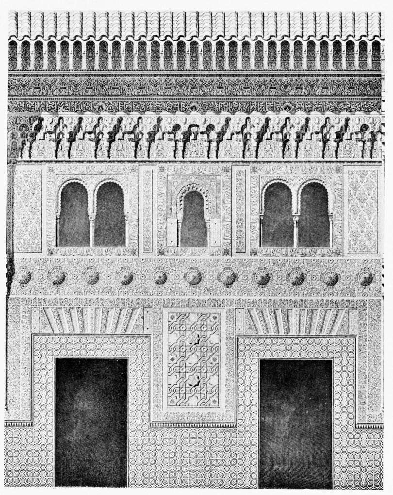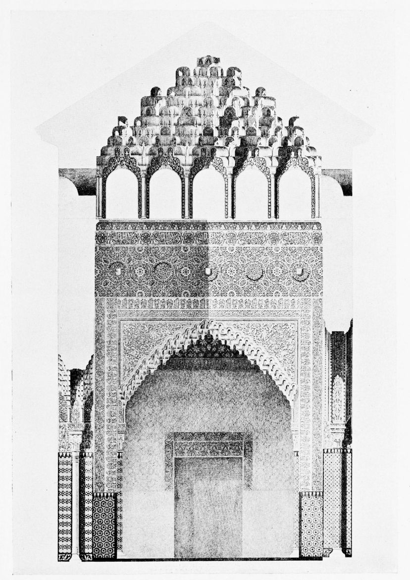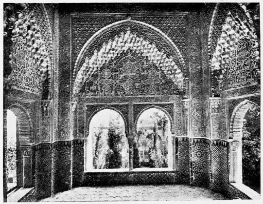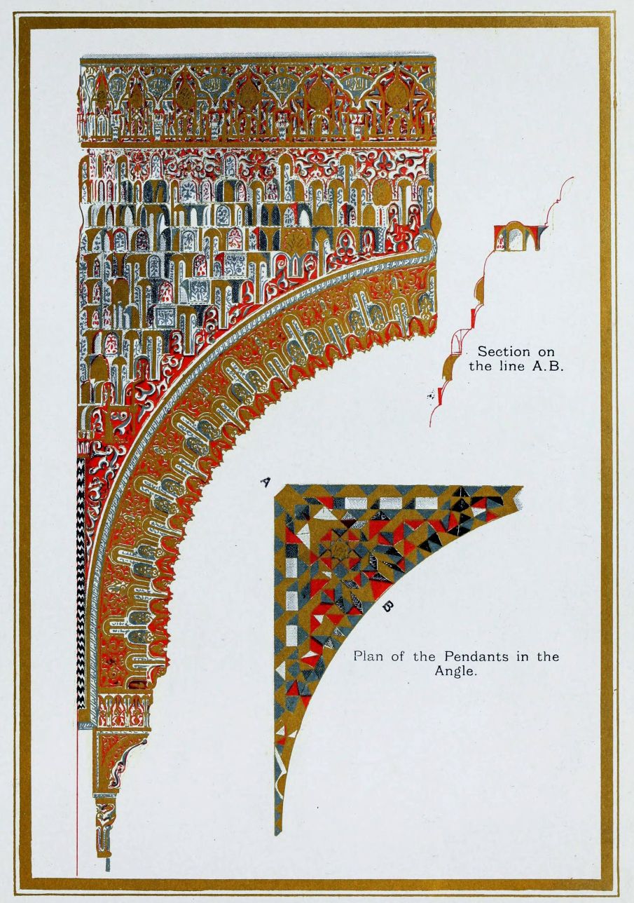 Don Mariano Contreras, Conservator of the Alhambra, the son of the gifted Raphaël Contreras, who devoted thirty-seven years of his life to the restoration of the Palace—gave me the benefit of his knowledge of this unique treasure-house of art; and I have also laid under contribution the beautiful plates of Owen Jones, who disposed of a Welsh inheritance in order to produce his great work on the Plans, Elevations, Sections and Details of the Alhambra. Jones’s Grammar of Ornament, which has been described as “beautiful enough to be the horn-book of the Angels,” also contains the result of his researches in the Alhambra, which occupied him for the greater part of eleven years. A selection of these illustrations is here rescued from the obscurity of public libraries and the inaccessible recesses of private collections. The inclusion of John F. Lewis’s drawings, and the reproduction of a series of pictures by James C. Murphy, who spent seven years in the study of the artistic marvels of the Alhambra, I do not feel called upon to defend. The photographs, several of which were placed at my disposal by Don Rafaël Garzón, represent the buildings as they appear to-day; the drawings were made before the Palace was damaged by the disastrous fire of September, 1890.{ix}
