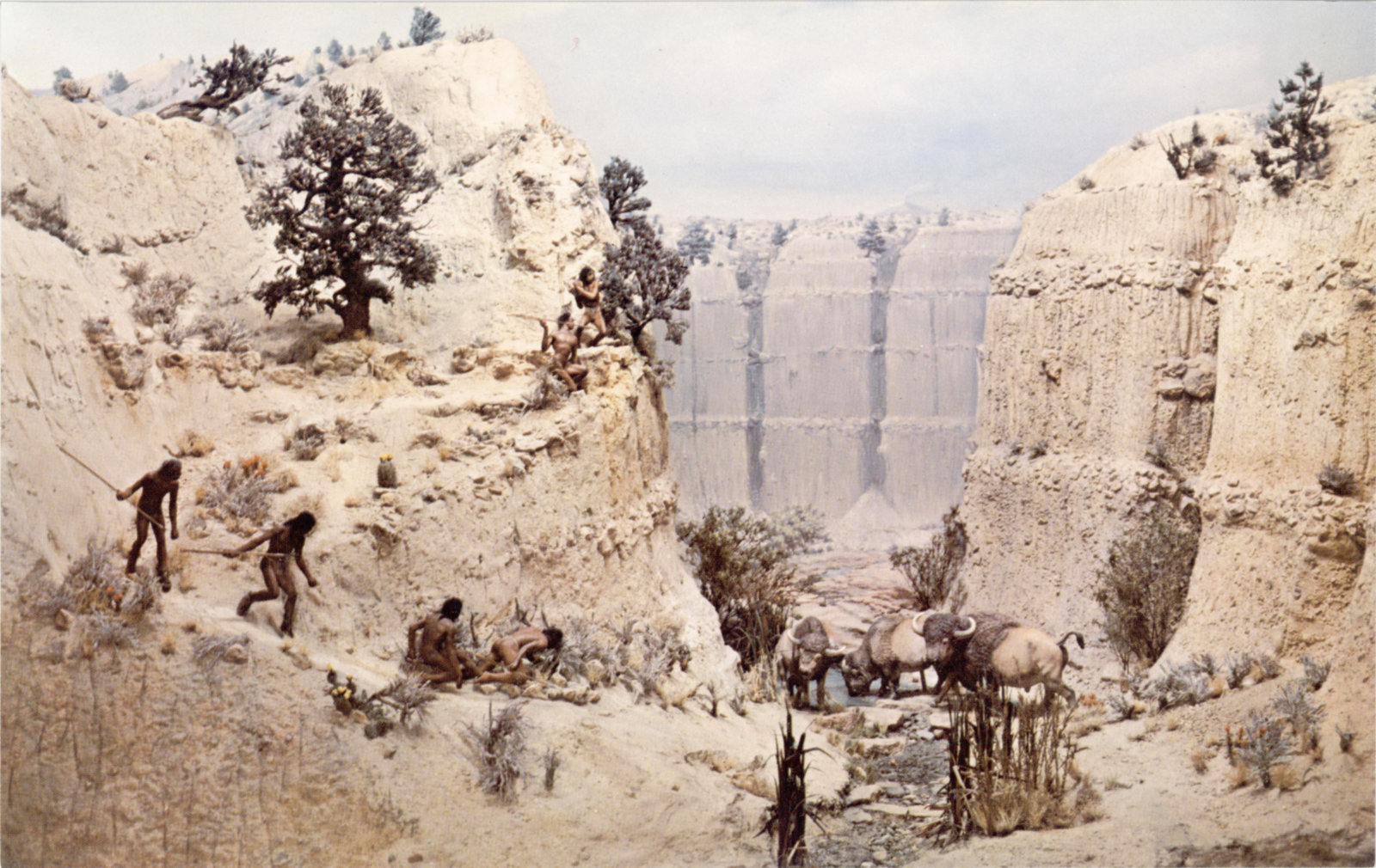 This diorama pictures a hunt such as may have taken place 10 or 12 thousand years ago in what is now northeastern New Mexico. In 1926, 1927 and 1928, the bones of 30 bison of an extinct species were dug out of the bed of an arroyo near the little town of Folsom, New Mexico. Associated with the bison bones were 19 spear points of an unusual type. The place where the bones and spear points were found had once been a water hole or marsh and men probably killed the bison when they came to drink or to wallow. They skinned the animals, cut off what flesh they wanted and left the carcasses in the mud. Sometimes spear points were lost or were left in the bodies and these points, preserved with the bones, tell the story of the early hunts.