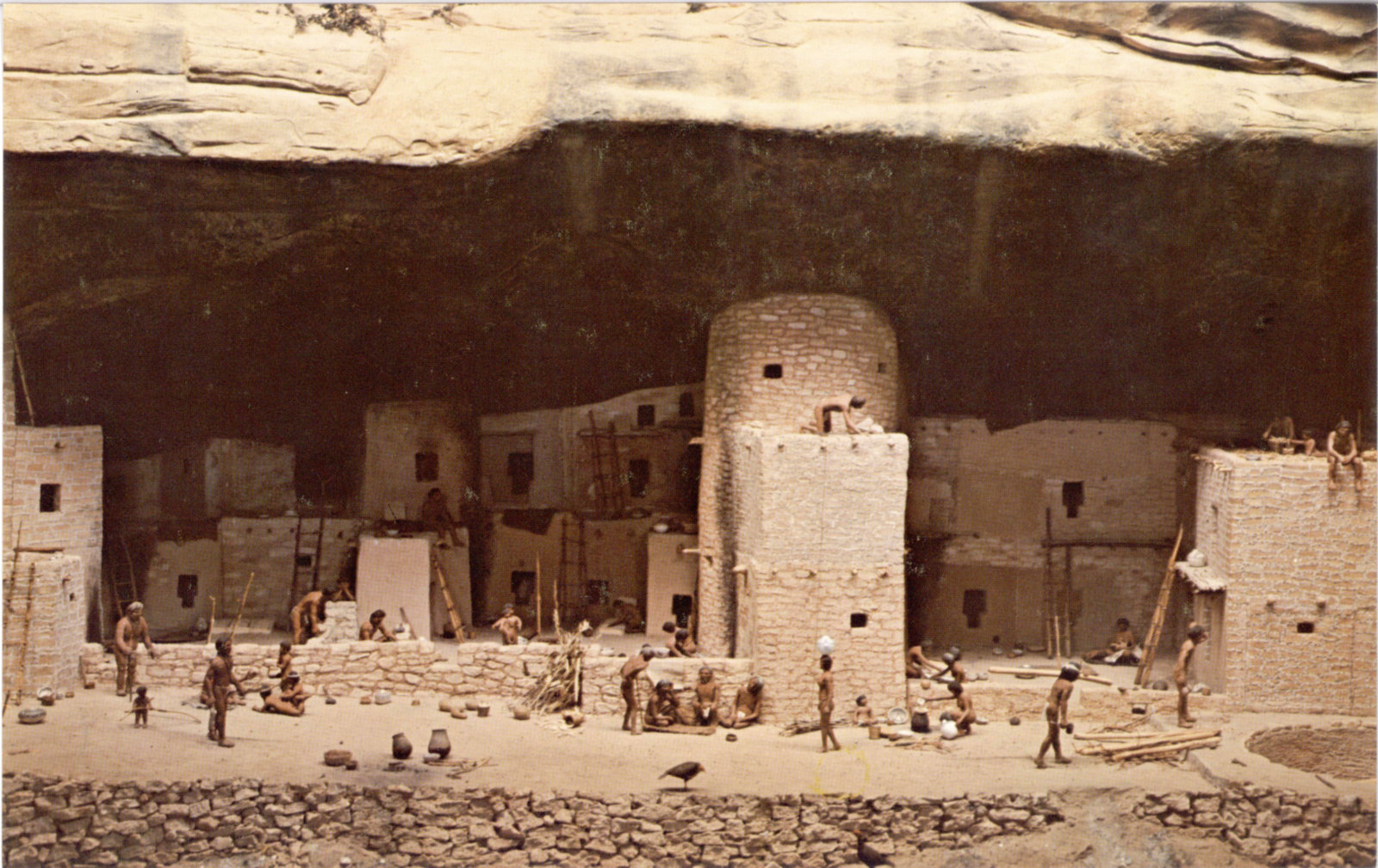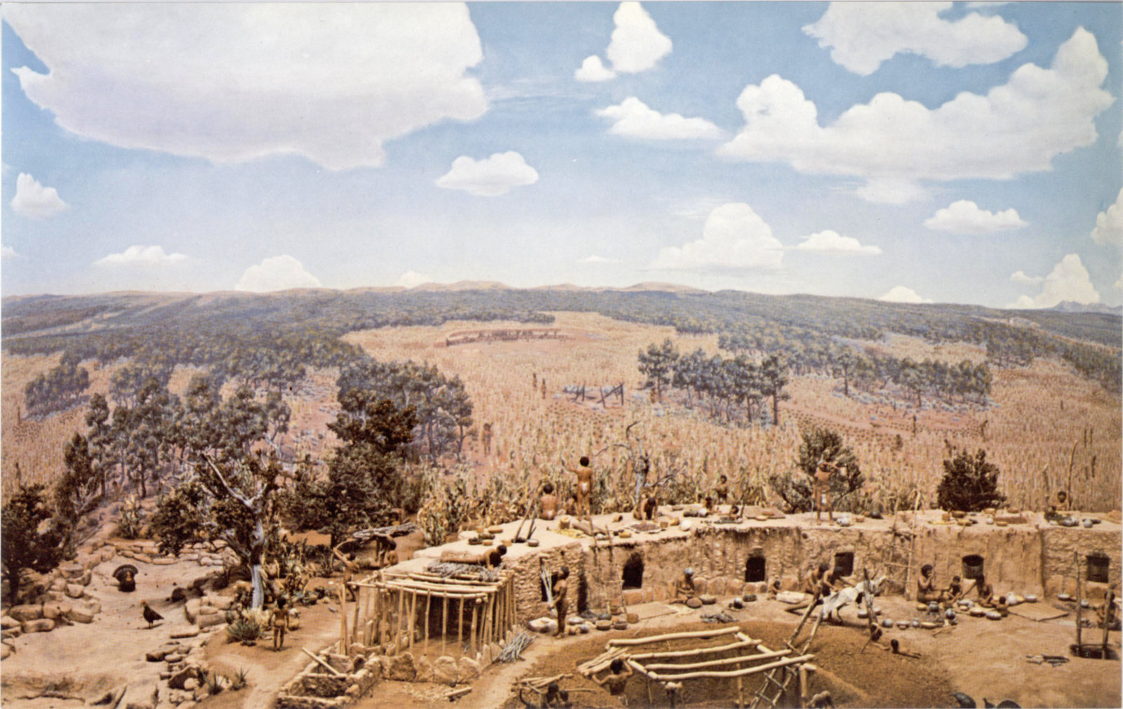Pictured here is a typical Mesa Verde pueblo of about 850 A. D. The houses are joined together in a long curving row, facing south. In front are two underground ceremonial rooms, one complete, the other under construction. Around the village are the fields and in the head of a small draw at the left is a spring which provides water. The people are engaged in the activities of a September day: gathering the crops, drying food, building houses, carrying water, cooking, dressing hides, making pottery and, in some cases, doing nothing at all.