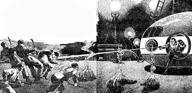 How long had it been since he crashed? It seemed hours. But it must have been seconds for ships suddenly landed out on the field in a storm of rocket fire. As he grew weak from loss of blood and the cold, he noticed a surging dark wave sweep across the field toward the ships. Then the sound of shouts, screams, shrieks reached his ears. It was the clamor of fear itself. Slowly he realized it was men racing across the field, now white with frost. The men swarmed around the ships. He could see little in the dim light of the red flares, could make out only a writhing mass of vague shapes around the silver ships which reared above them like huge turtles.