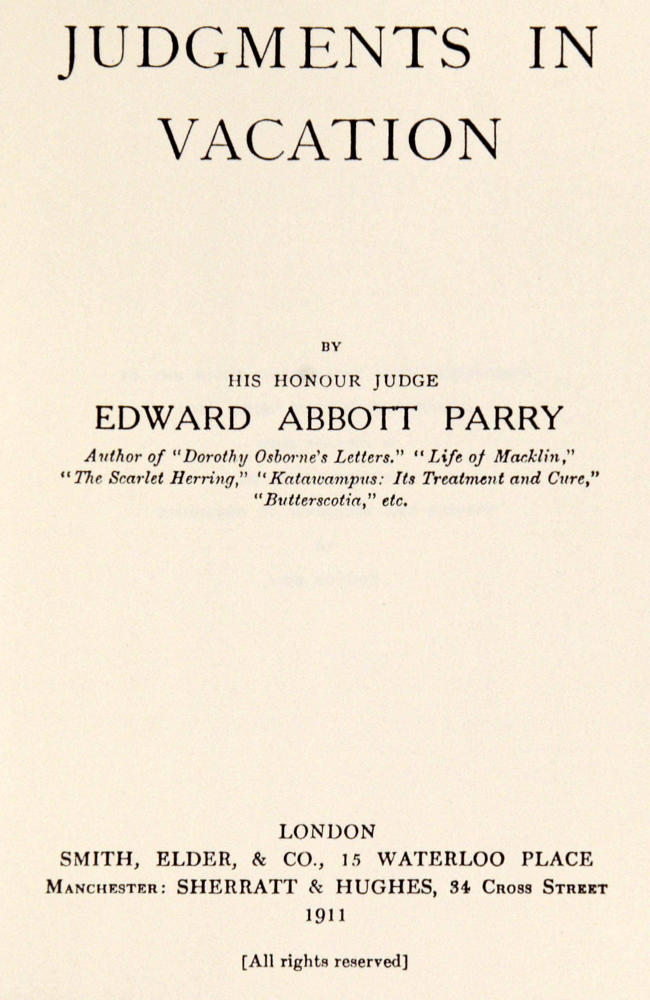 To a sane world one must offer some few words of excuse for writing judgments in vacation. One has heard of the emancipated slave who invested his savings in purchasing a share in another slave and of the historical bus-driver who made use of his annual holiday to drive a bus for a sick friend. And so it is with smaller men. One gets so used to giving judgments upon matters, the essence and properties of which one really knows very little about, that the habit remains after the sittings are over into the vacation. And on that rainy day, when golf and the more important pursuits of life are impossible, one finds oneself alone with pen, ink and paper, and thoughts that voluntarily move towards written judgments. And there is this excuse, that a Judge of a County Court can offer which would not be possible to his ermined brother—or should it be cousin, a poor relation had best be careful in claiming relationship—of the High Court. If we have any lurking desire to write our judgments, we shall not find leisure or opportunity to write them in term time. There is such a vast number of cases to try that judgments must be given forthwith, relying on authority perhaps rather than[x] accuracy for the kindly manner of their reception. Well do I remember a great Judge giving a parting word of advice to a friend of mine on the Northern Circuit who preceded me to the County Court Bench: “Better be strong and wrong than weak and right.” The wisdom of the world is on the side of this epigram, and demands that all judgments of real importance should be given forthwith and spoken rather than written. Thus that most influential arbitrator in the larger affairs of Englishmen, the umpire in the cricket field, is never allowed to write his judgments.