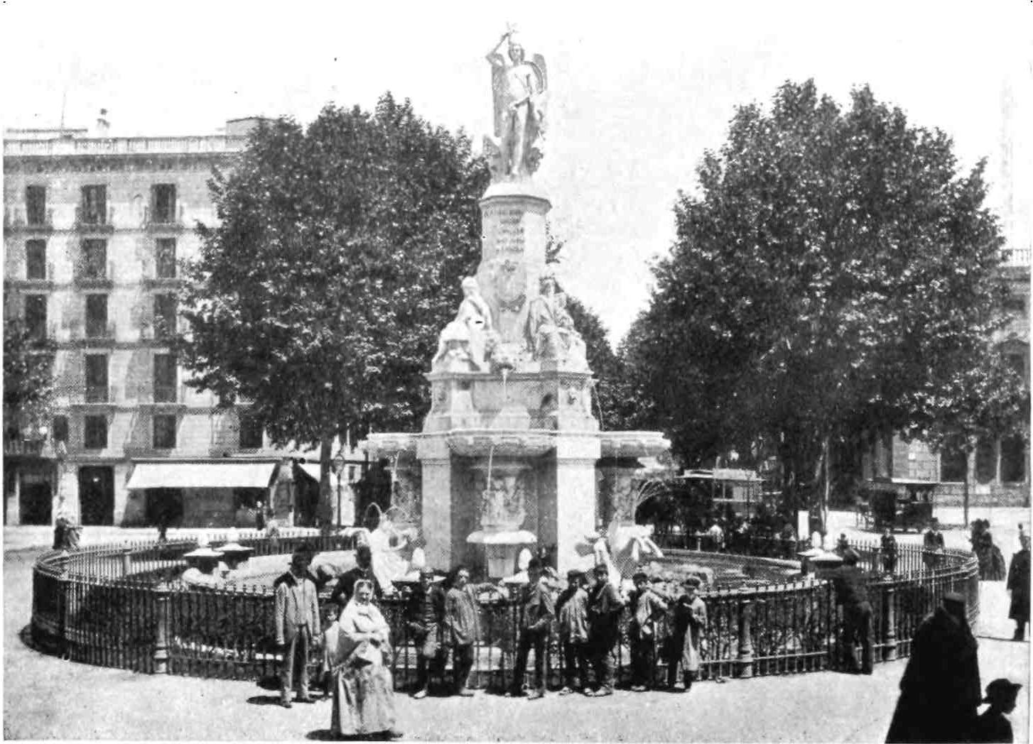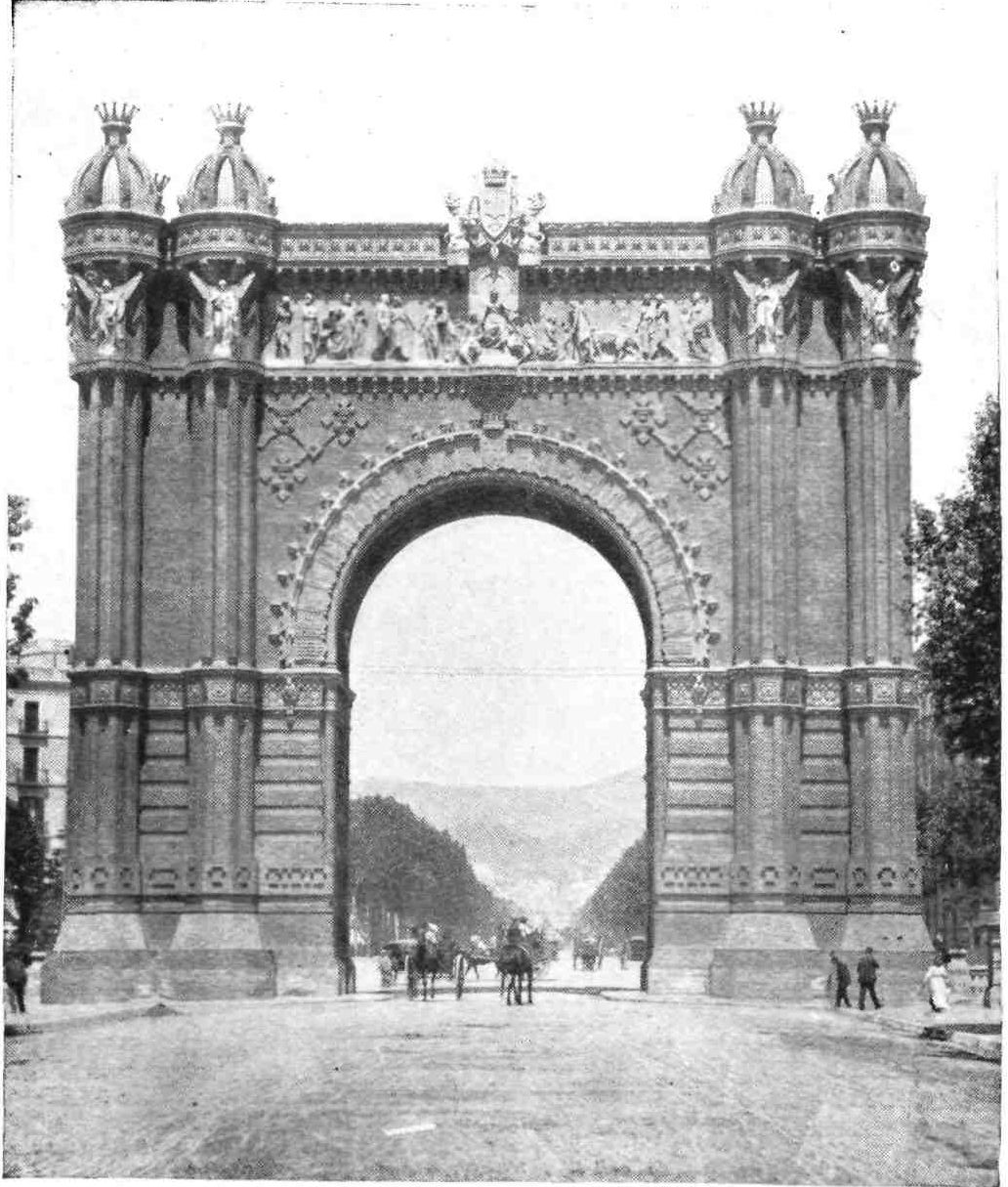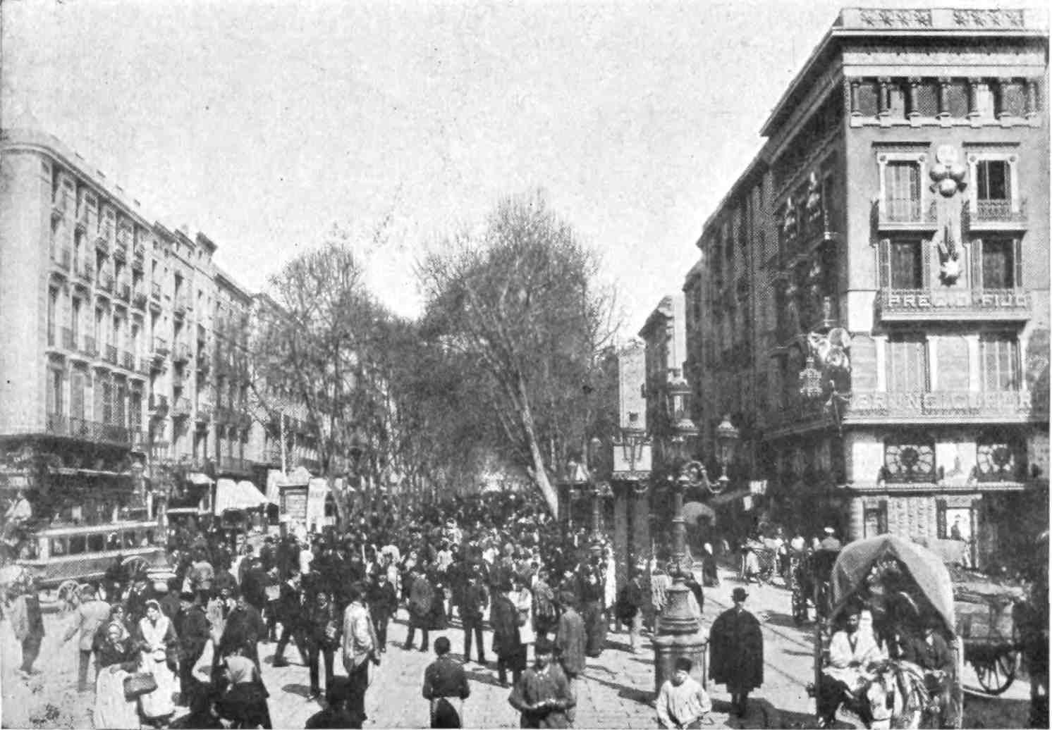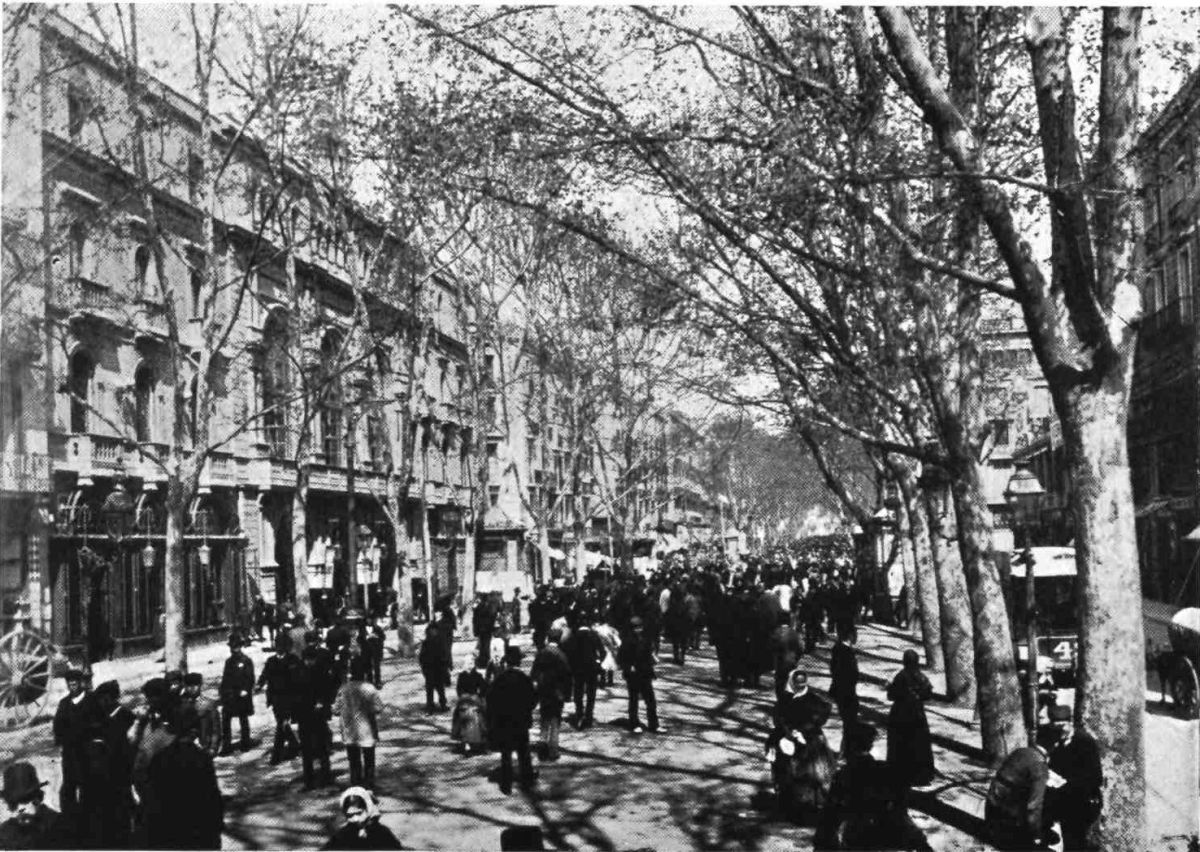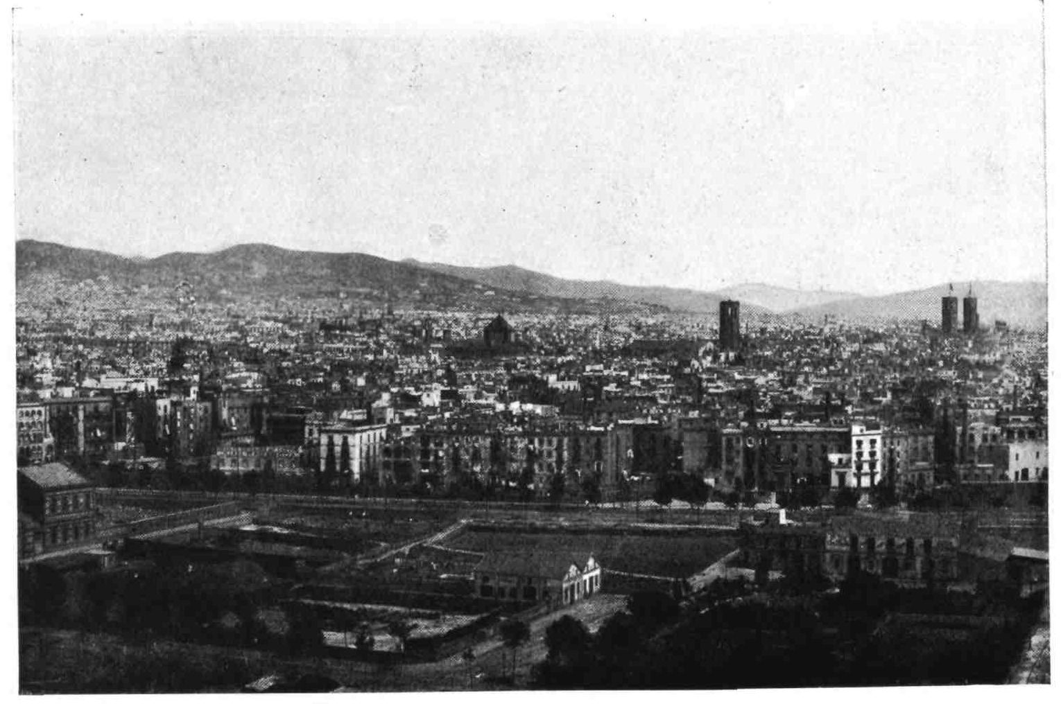Barcelona has remained true to her traditions. She is still, as of old, a city of merchant princes, a hive of industry, at once the Liverpool and Manchester of Spain. To those who visit the capital of Catalonia after an acquaintance only with the moribund cities of Old Castile, this vision of España Moderna comes as a shock and a revelation. The first impression is not pleasing. You approach the city through a vast wilderness of suburbs, teeming with life, and breathing apparently through grimy factory chimneys. We realise that we have returned to the civilised twentieth century. But the brighter side of modernity is soon revealed. In its heart Barcelona is clean, bright, and spacious. The boulevards are unequalled in Europe—except perhaps by Budapest—and the street prospects are worthy of Washington. The Rambla is the most delightful of promenades; in the Calle Fernando the contents of every shop window tempt the unthrifty. A noble, beautiful modern metropolis, still worthy of Cervantes’ encomium: “Flor de las bellas ciudades del mundo, honra{9} de España, reglo y delicia de sus moradores, y satisfacción de todo aquello que de una grande famosa, rica, y bien fundada ciudad, puede pedir un discreto y curioso deseo.”