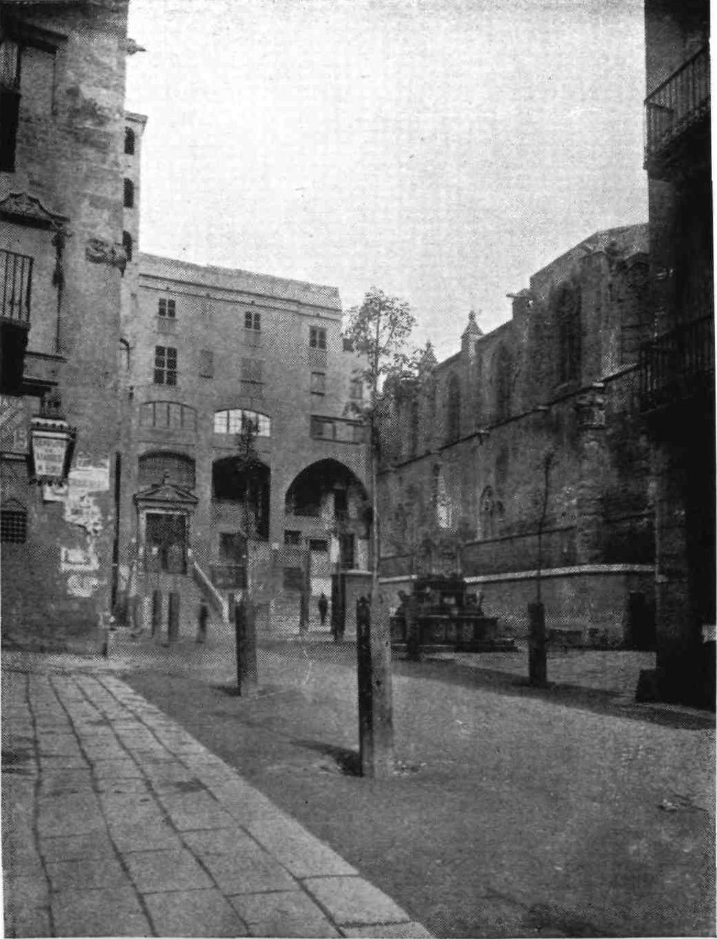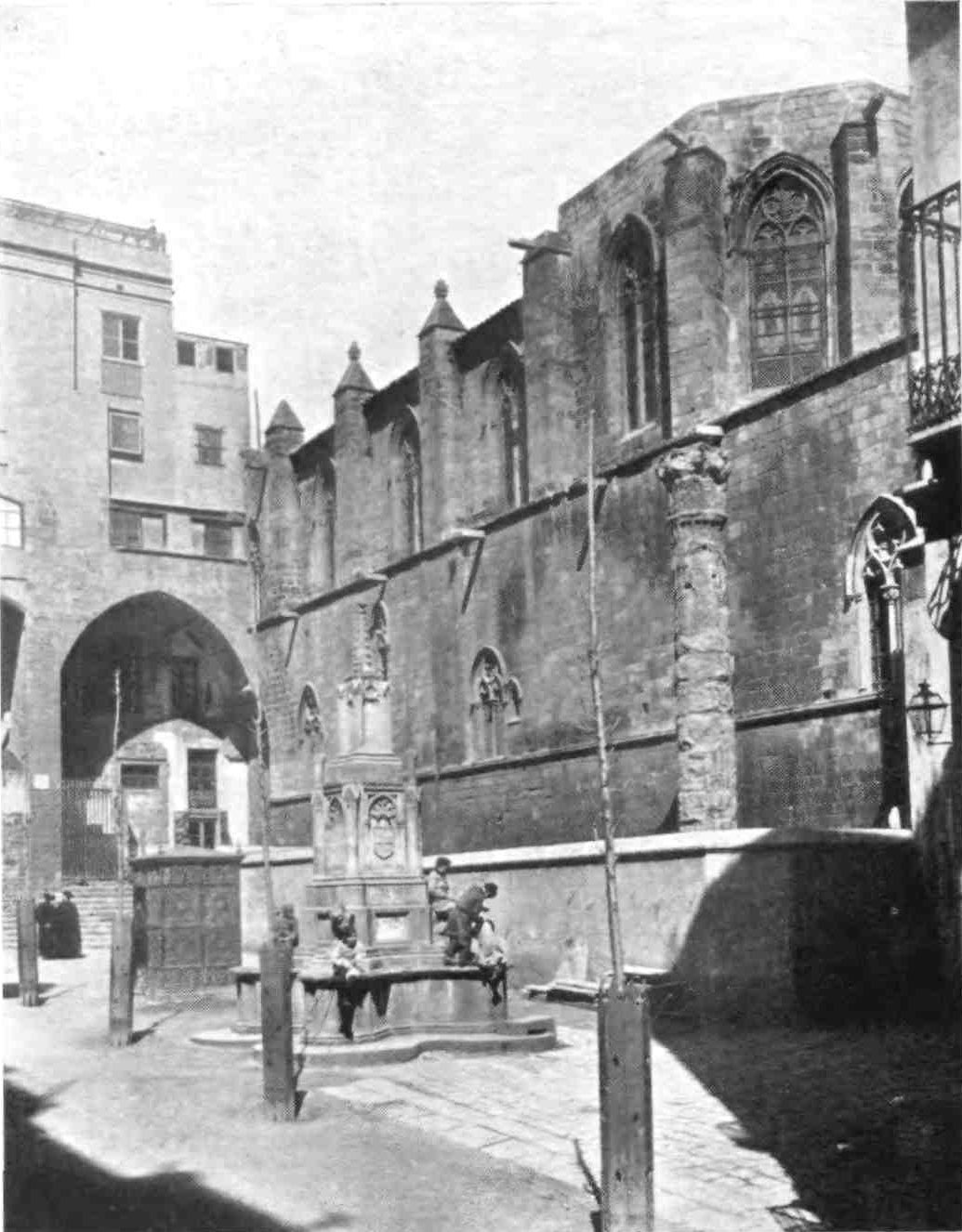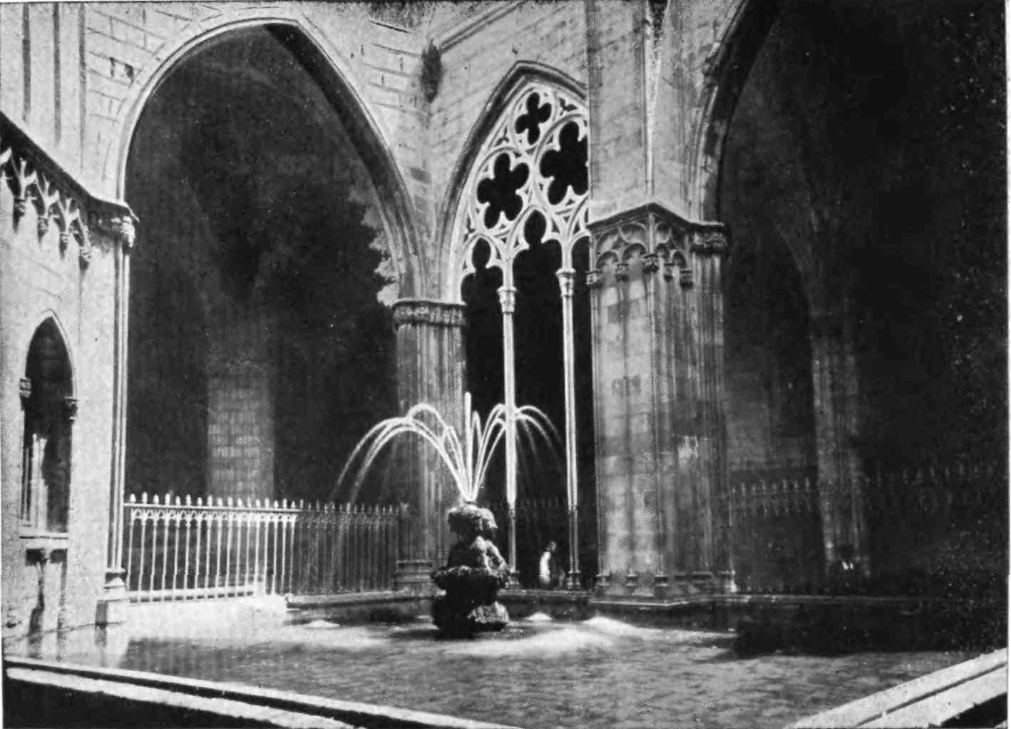 Barcelona is richer in monuments of the past than many a more ancient-looking city. Foremost among these is the Cathedral in the very heart of the town, one of the grandest examples of Gothic architecture in Spain. Its extreme sombreness and apparently massive character produce a similar impression to that created by the much larger Cathedral of Seville.