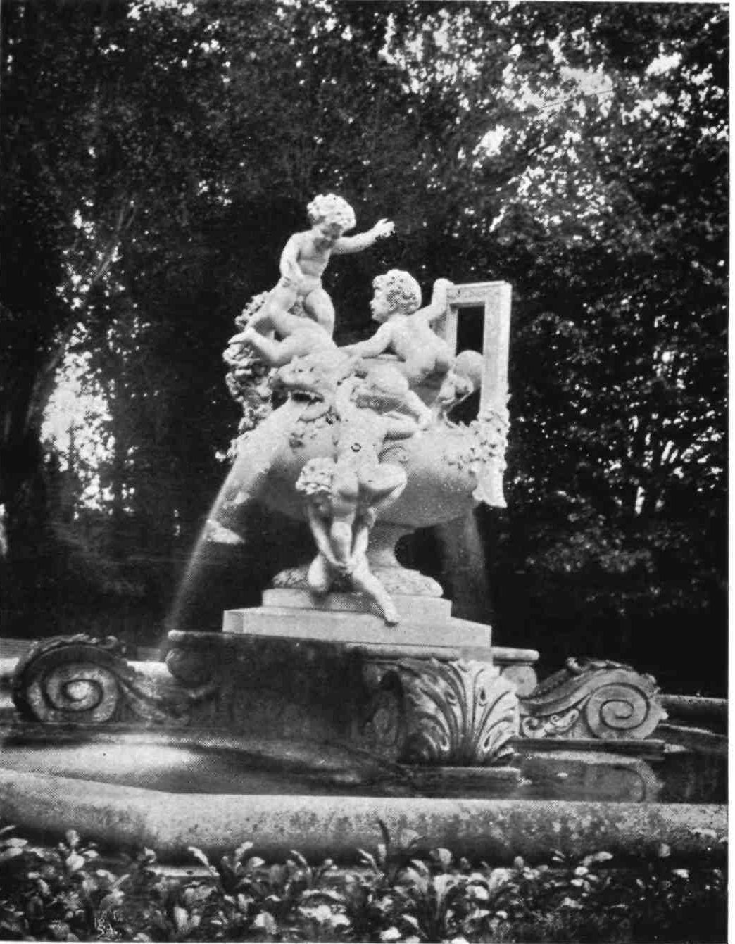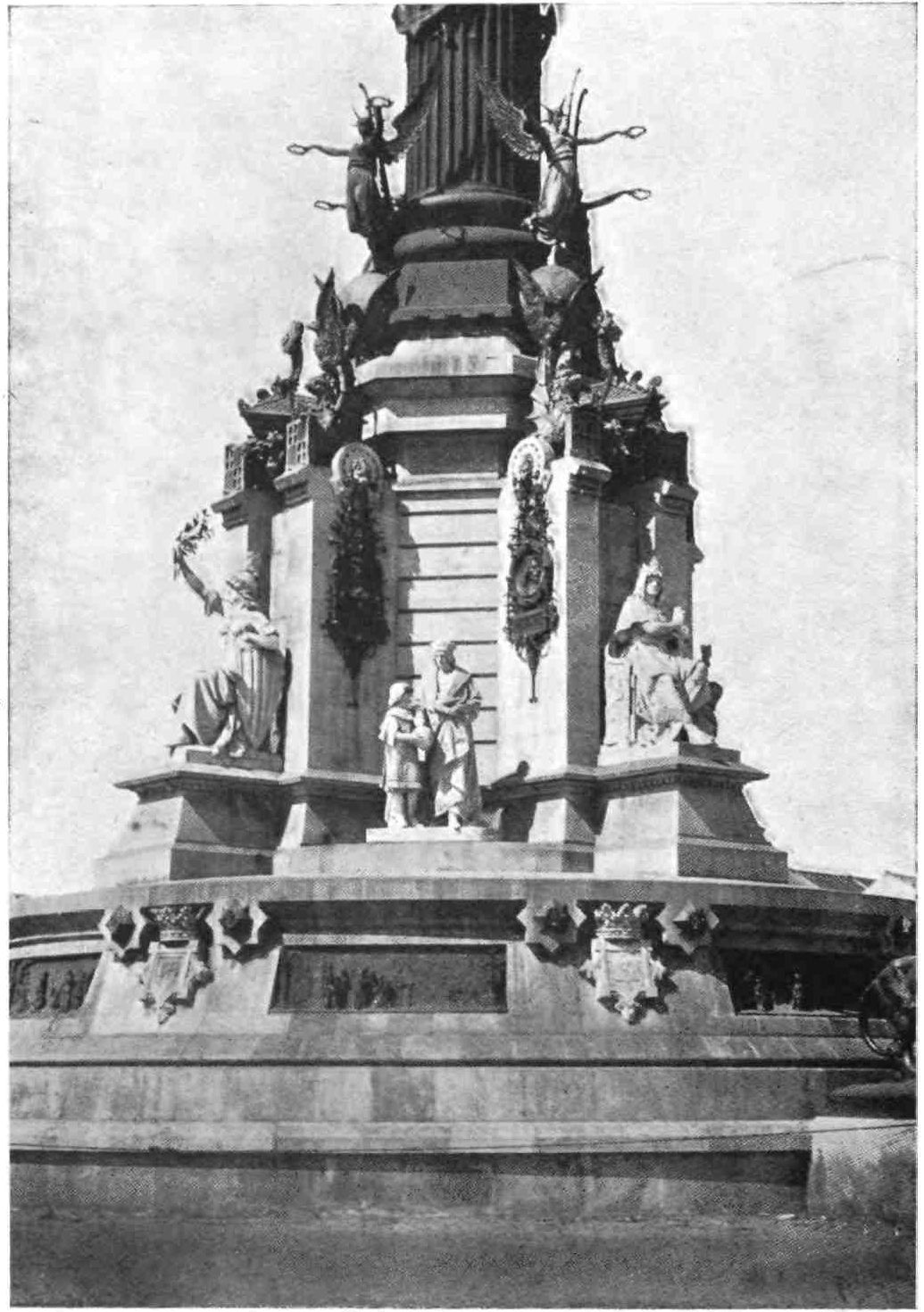 Returning from Lerida to Barcelona we pass the castle of Bellpuig, the seat of the great family of Anglesola—a massive fortress of red stone, restored in the sixteenth century. Its magnificent staircase still gives one some idea of the pomp and state of its former lords. The village extends from the castle to the church—a situation which inspired the erudite topographer of this country (Piferrer) with reflections that remind one of Don Quixote’s address to the goatherds. The church contains the tomb of Don Ramon de Cordova, one of the ablest lieutenants of Gonzalo de Cordova. His effigy, armed and holding his helmet, reclines in a sleeping posture on an urn adorned with reliefs of marine gods and monsters and upheld on the backs of sirens, whose hands are webbed; the sepulchral arch is formed by six Ionic columns, against which lean figures expressive of mourning; over the tomb is a relief of the Entombment. In niches on each side of{50} the arch are two life-size figures emblematic of Victory; above them, two figures leaning forth from medallions appear to extend laurels toward the hero. The plinth and cornice of this superb tomb are adorned with reliefs illustrating the victories and achievements of the deceased, who was as distinguished as an admiral as a general. His body remains in the urn practically incorrupt. The tomb is the work of Juan Nolano.