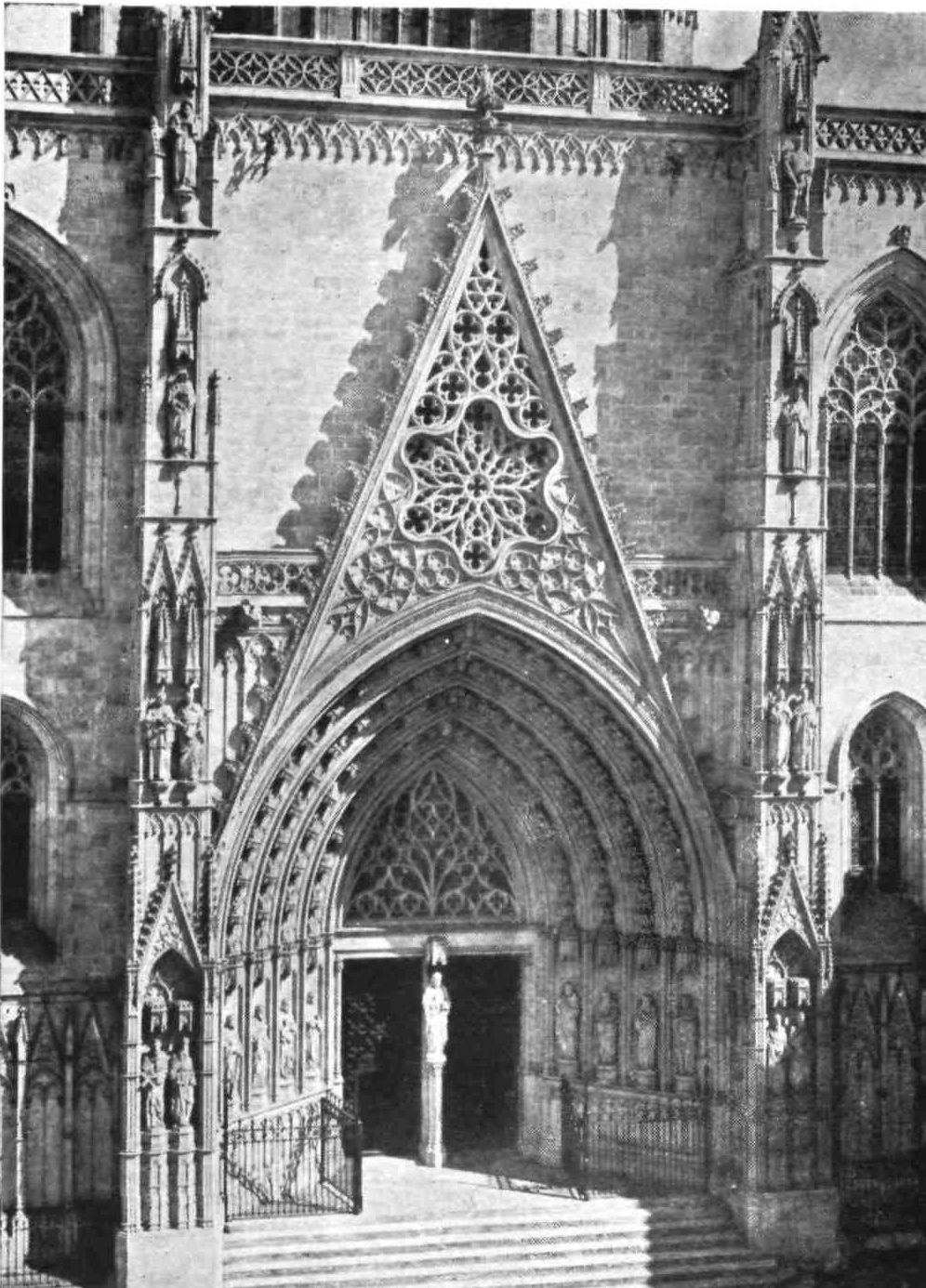 Standing on the sinister spot where, twelve years ago, twelve people were killed and fifty others injured by a miscreant’s bomb, we survey the fine west front. This is flanked by two octagonal towers, of the telescope kind, and has a magnificent rose-window, above which I rather felt that an attic or story gable was wanted. The portal is richly moulded, and adorned with sculpture. The doors are faced with iron.