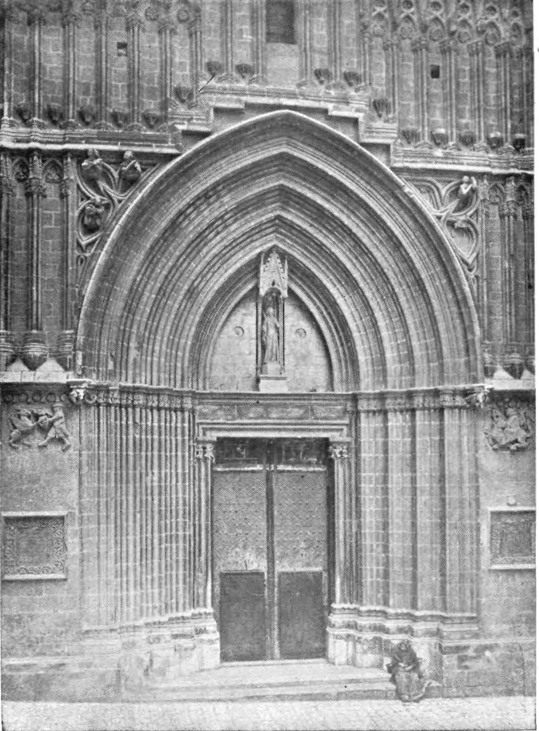 Cloisters are nearly always charming, and those adjoining the Cathedral on the south side are certainly so, with their palms and fruit trees and fountains. One of these last is adorned with a statue of St. George, a jet of water serving as a tail to the horse. In one corner is a goose-pond. I saw nothing of the cats who, Street says, were prowling about the cloisters and church, and contrived to get into the choir-stalls just before service, whence they were forthwith chased by the choristers and such of the clergy as happened to be there. I have witnessed such scenes in French churches, where they are very distracting to the devout. The cloister was begun by Master Roque and finished in 1448. The architecture has been variously criticised, and the tombs for the most part are poor. On these the profession of the deceased is indicated by the implements of his trade lightly graven. The resting-place of Mosém (Monseigneur) Borrà, the jester of Alfonso V. of Aragon, is distinguished by the cap and bells. In the Chapel of the Conception there used to be, says O’Shea, a picture painted by order of the municipality in gratitude for the cessation of the plague in 1651, at the intercession of the Virgin. The keys of the city, made in{15} silver, were presented to her on that occasion. In the chapel of Santa Lucia, at the south-west angle of the cloister, Street recognised a fragment of the old cathedral. The entrance into the south transept is of the same date. By the graceful Puerta Santa Eulalia we pass into the street.