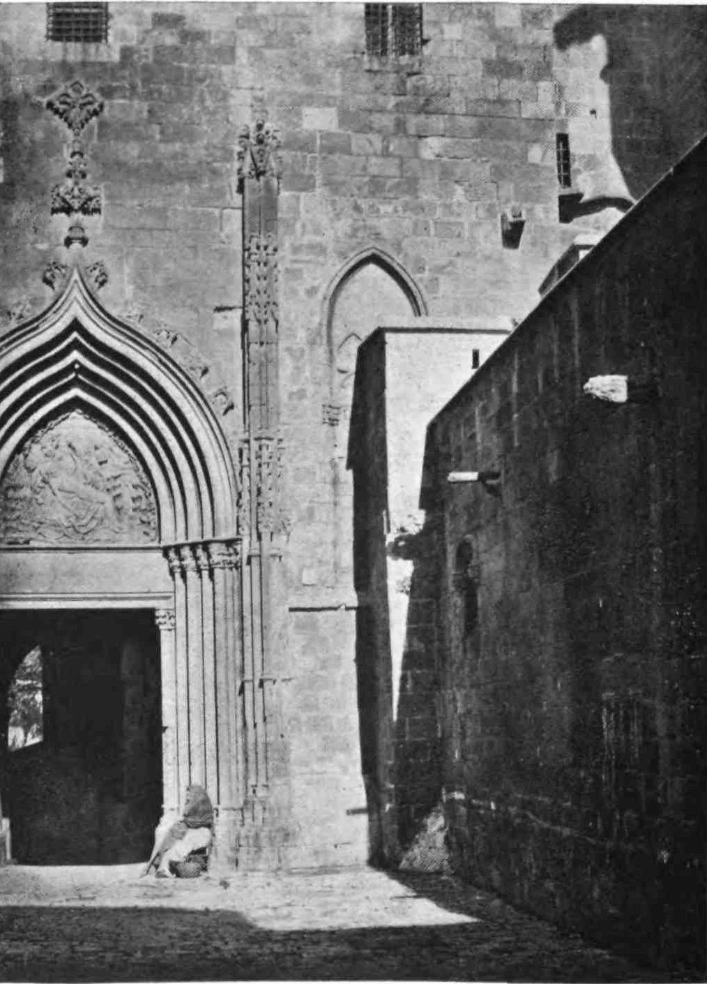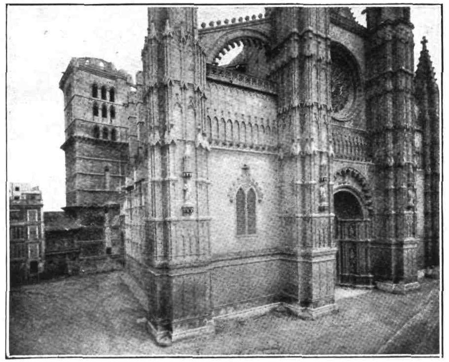 The cathedral towers above the whole city and{92} is one of the most important churches in the kingdom. The name of the architect is unknown, but the foundations were laid by order of Jaime the Conqueror soon after he had annexed the island. The plan is rectangular, the walls supported by massive flying buttresses, surmounted with pinnacles and turrets. The south front is the finest and is pierced by the beautiful Puerta del Mirador, in florid Gothic style, the work of Pedro Morey, who died in 1394. The west porch is an elaborate work, finished in 1601. On the north side is the noble square bell-tower.