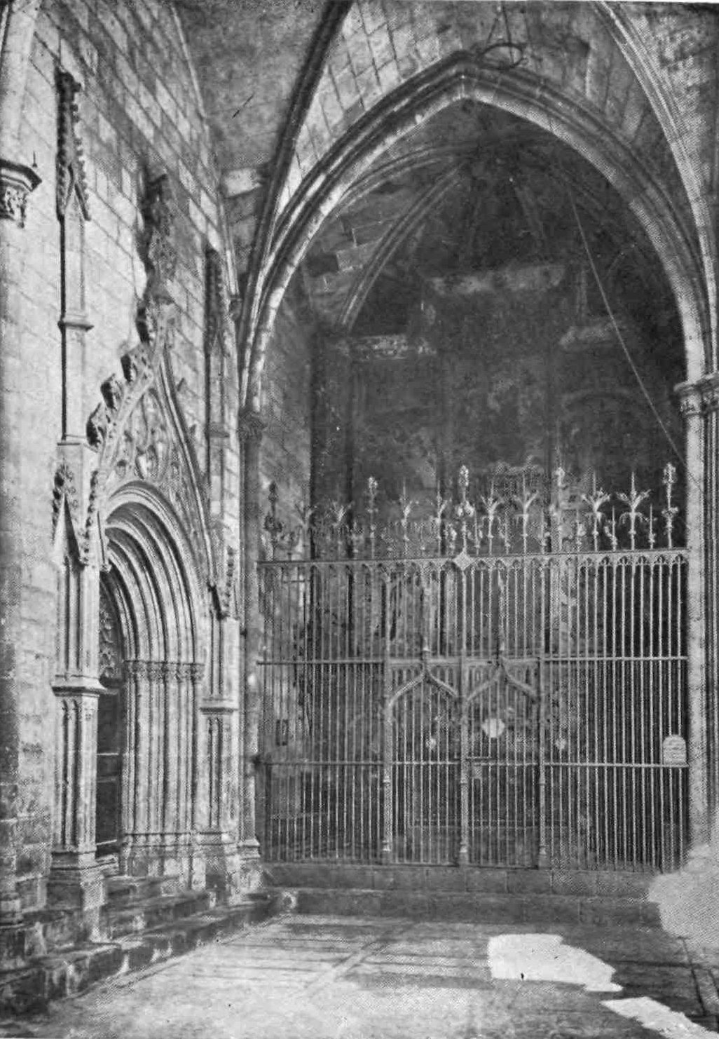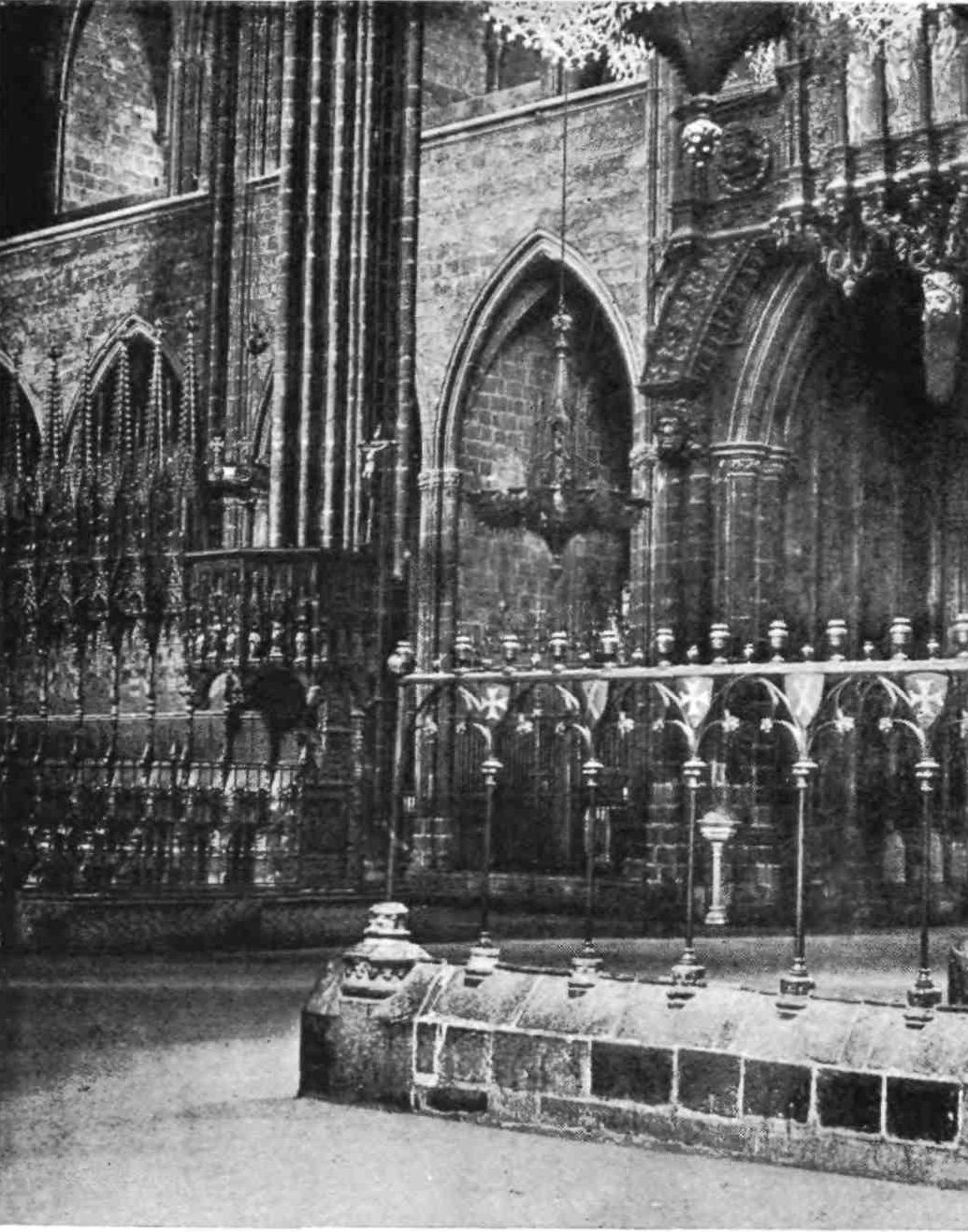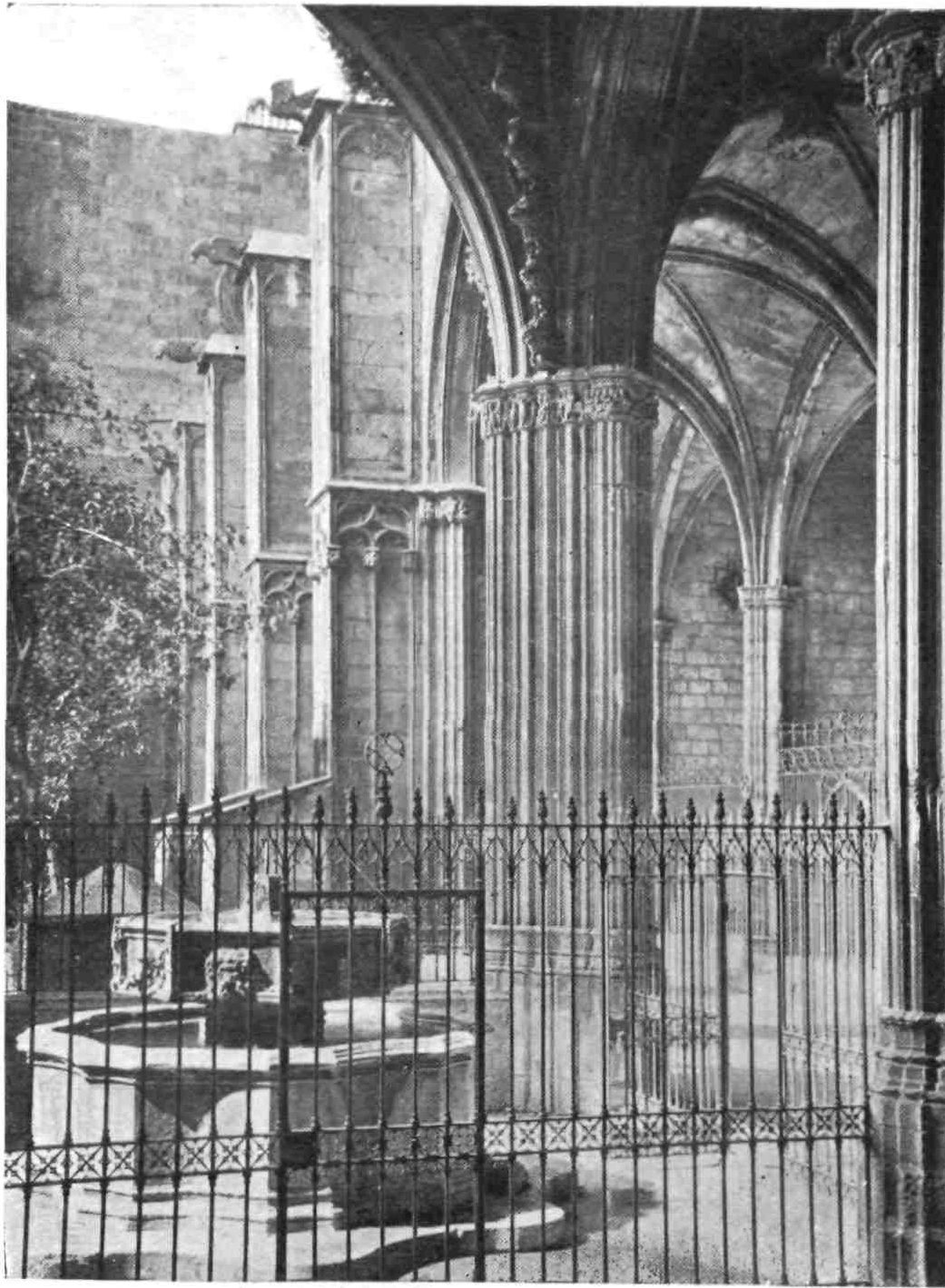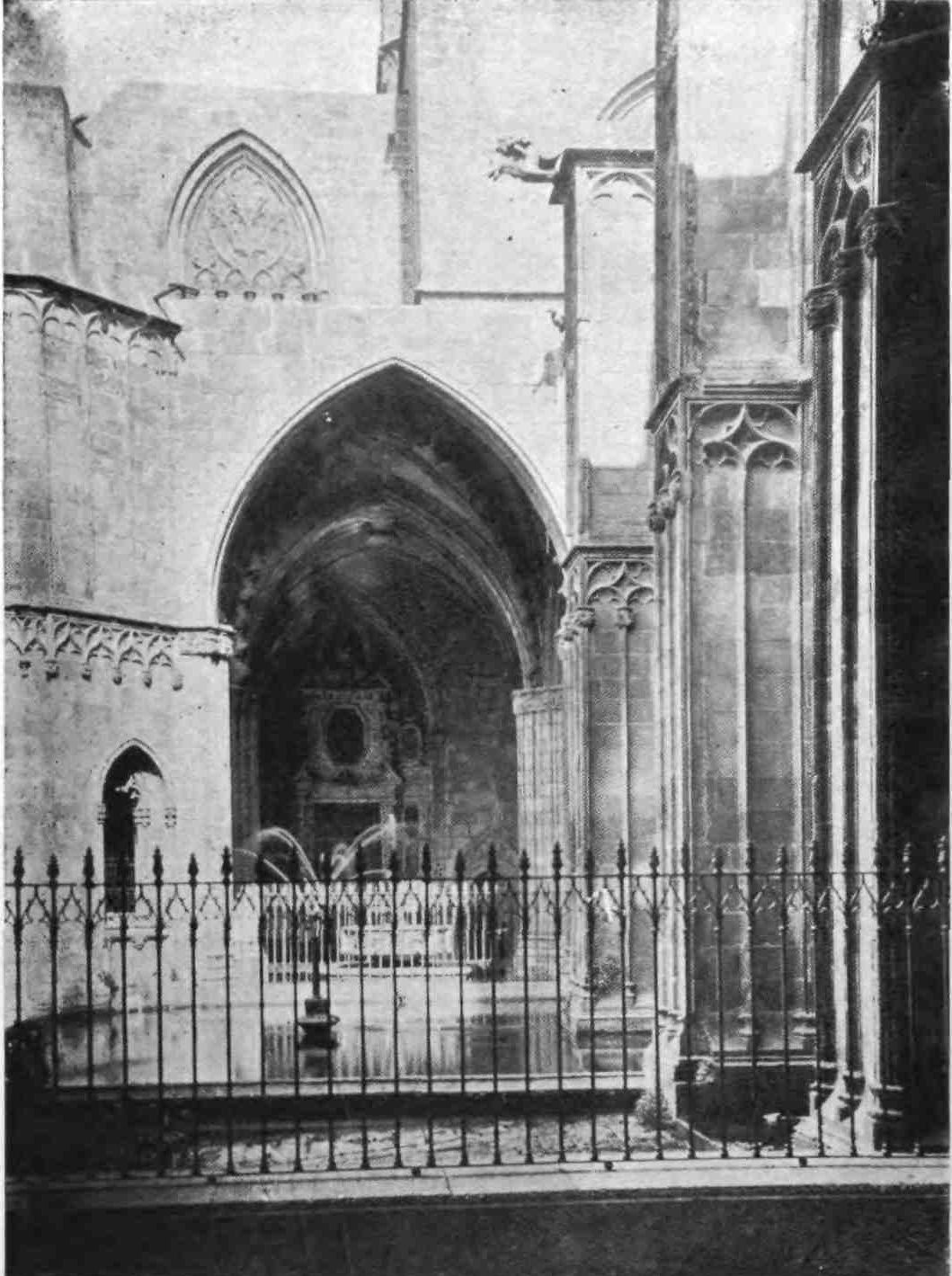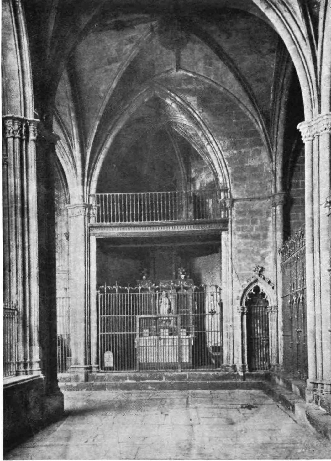 A floor runs round the church above the side chapels and is carried across the west front. The upper rooms were never used as places of worship. The chapels are closed by mediæval grilles of wrought iron. They date mostly from the sixteenth and seventeenth centuries, and present no very interesting features. This is fortunate for the painstaking sightseer, as the{13} obscurity renders an examination difficult. A crucifix in the uppermost chapel in the chevet is a memorial of the battle of Lepanto, where it was carried on the prow of Don Juan’s flagship. The image is believed by some to have bent its head to avoid the Turkish bullets. In the chapels of San Miguel Arcángel and Nuestra Señora del Patrocinio, close by, are the fine Gothic tombs of Bishop Berenguer de Palau (died 1240) and of one of his successors, Poncio de Gualba (died 1334). Leaving the ambulatory by the north, the chapel on the right contains another good Gothic monument to Bishop Escaler. The finest tomb, on the whole, is that of Doña Sancha de Cabrera, lady of Noalles, in the chapel of San Clemente, in the south aisle; and three chapels farther on is the sarcophagus of the great Catalan saint, Ramon de Penafort. The two wooden urns covered with crimson velvet in the wall between the south transept and the sacristy enshrine the ashes of Count Ramon Berenguer the Old, and his consort, Almodis (died 1070). Opening off the south aisle, close to the main entrance, is the large square chapel of the Holy Sacrament, or of St. Olegarius, with a fine star-vaulting, the seventeenth-century monument of the titular, and some paintings of Villadomat, a local artist of some repute, who lived in the first half of the eighteenth century. There are also some paint{14}ings of merit by the Tramullas, father and son, of Perpignan, but generally speaking this fine cathedral is poor in painting and statuary.