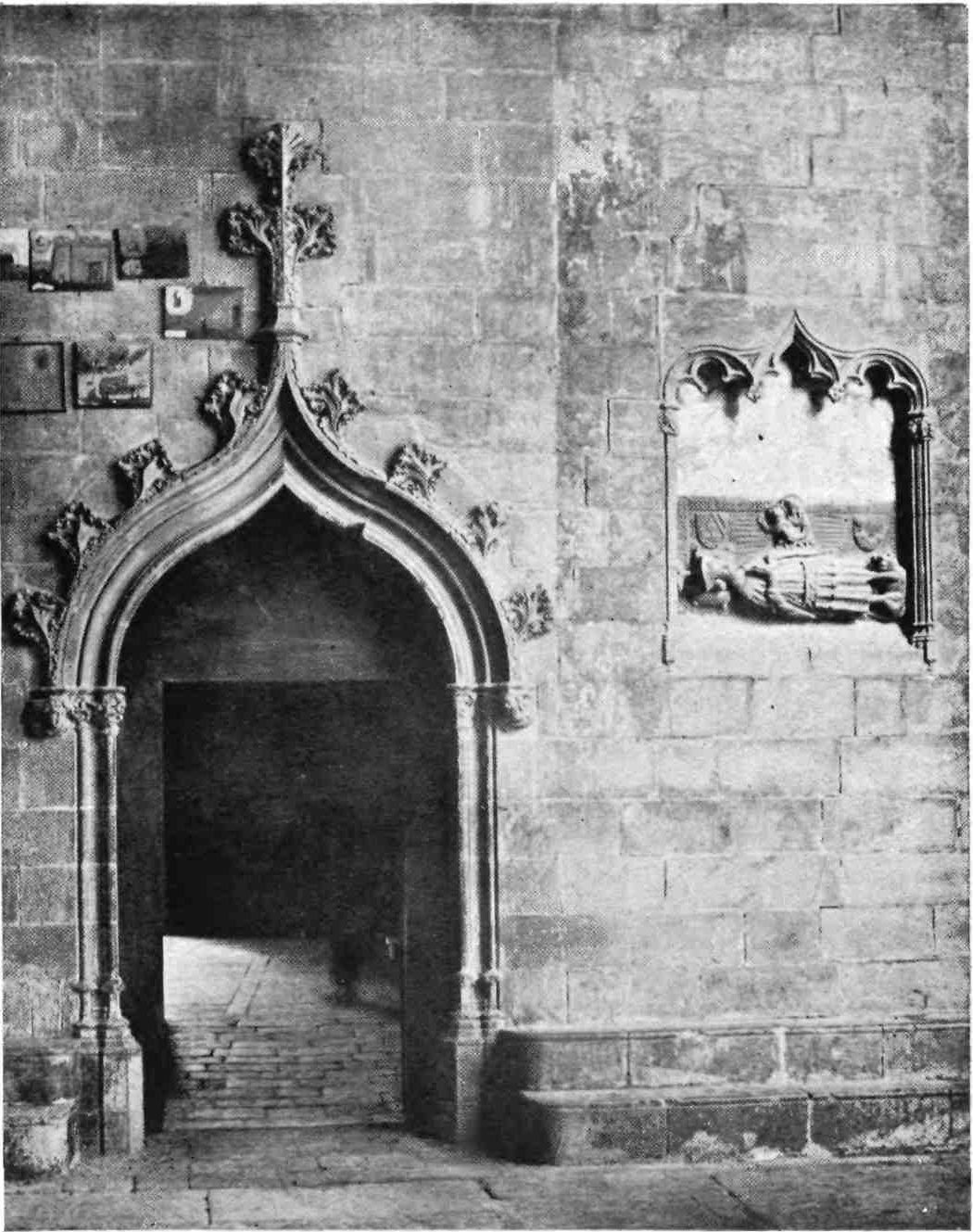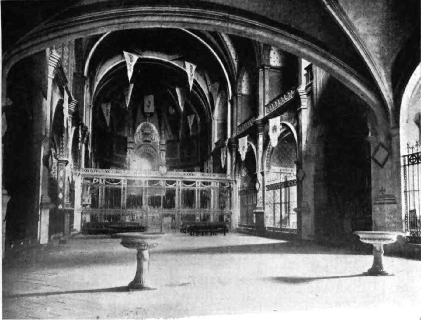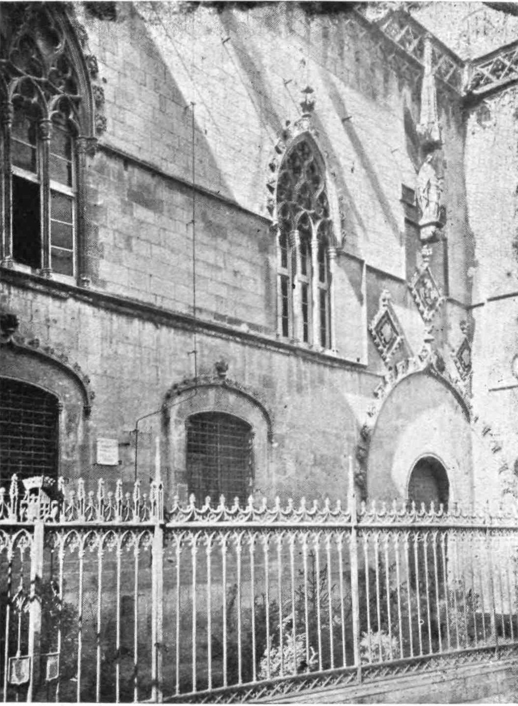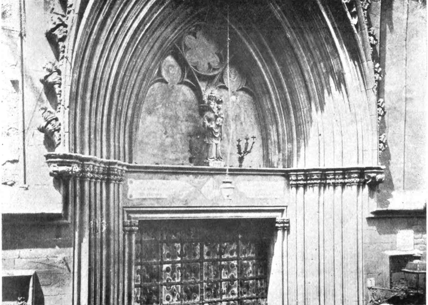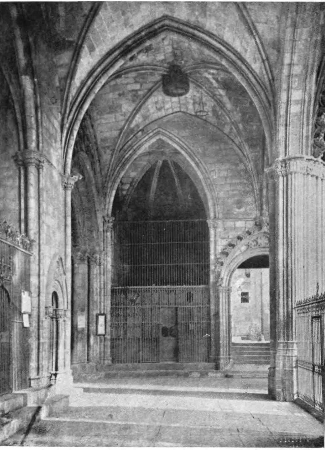 A floor runs round the church above the side chapels and is carried across the west front. The upper rooms were never used as places of worship. The chapels are closed by mediæval grilles of wrought iron. They date mostly from the sixteenth and seventeenth centuries, and present no very interesting features. This is fortunate for the painstaking sightseer, as the{13} obscurity renders an examination difficult. A crucifix in the uppermost chapel in the chevet is a memorial of the battle of Lepanto, where it was carried on the prow of Don Juan’s flagship. The image is believed by some to have bent its head to avoid the Turkish bullets. In the chapels of San Miguel Arcángel and Nuestra Señora del Patrocinio, close by, are the fine Gothic tombs of Bishop Berenguer de Palau (died 1240) and of one of his successors, Poncio de Gualba (died 1334). Leaving the ambulatory by the north, the chapel on the right contains another good Gothic monument to Bishop Escaler. The finest tomb, on the whole, is that of Doña Sancha de Cabrera, lady of Noalles, in the chapel of San Clemente, in the south aisle; and three chapels farther on is the sarcophagus of the great Catalan saint, Ramon de Penafort. The two wooden urns covered with crimson velvet in the wall between the south transept and the sacristy enshrine the ashes of Count Ramon Berenguer the Old, and his consort, Almodis (died 1070). Opening off the south aisle, close to the main entrance, is the large square chapel of the Holy Sacrament, or of St. Olegarius, with a fine star-vaulting, the seventeenth-century monument of the titular, and some paintings of Villadomat, a local artist of some repute, who lived in the first half of the eighteenth century. There are also some paint{14}ings of merit by the Tramullas, father and son, of Perpignan, but generally speaking this fine cathedral is poor in painting and statuary.