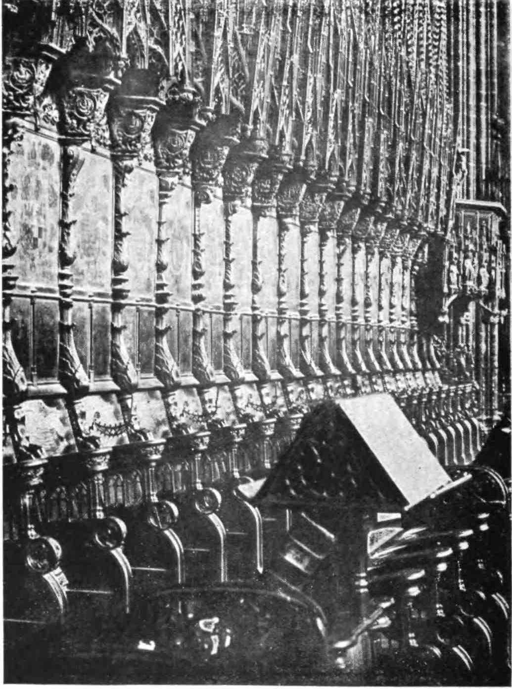 The high altar is of alabaster with a silver frontal, and belonged to the old cathedral. It was the gift of Ermesindes, the wife of Count Ramon Borel (1038). The reredos is a very rich and interesting work plated with silver. It was completed in 1348. The subjects in the three tiers of niches relate respectively to the lives of the saints, the life of the Blessed Virgin, and the life of Our Lord. The work is crowned by the figures of Christ and His Mother, and the saints Narcissus and Feliu. Of the same period is the baldachin, the vault of which is covered with sacred subjects, while the shafts are adorned with{28} heraldic achievements. Behind the reredos is the bishop’s throne, formed of a single piece of marble. “Here, when the bishop celebrated pontifically, he sat till the oblation and returned to it again to give the benediction to the people.”
