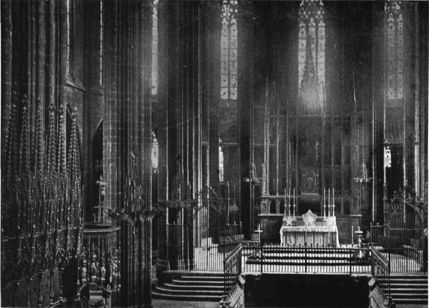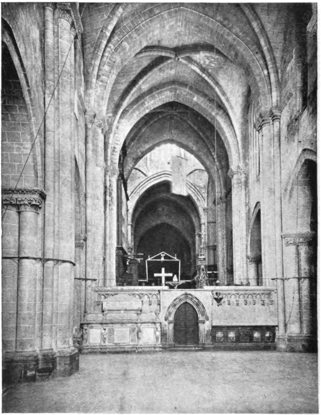 The west front, only finished ten years ago,{11} compares very unfavourably with the older portions. The dome over the first or westernmost bay of the nave is also modern. Little else of the exterior can be seen. Inside, as I have said, the church is extremely sombre, and very conducive to what an eminent divine called Gothic devotion. This is due partly to the dark colour of the stone, and partly to the smallness of the windows, which are filled with beautiful fifteenth-century stained glass. The windows of the chapels in the south aisle open into a corresponding row of chapels in the adjacent cloister. Everything, in fact, has been done to keep out the torrid rays. The chapels are continued all round the church, there being no fewer than twenty-seven. The choir is, as usual, in the middle of the nave, being separated by the crossing from the chancel. Twenty massive and somewhat inelegant clustered columns separate the nave from the aisles and the chancel from the ambulatory, and from their capitals spring the nineteen arches forming the vaulted roof. Nave and aisles are alike 83 feet high. The cathedral is dedicated to a local martyr, Santa Eulalia, whose body since the year 1339 has reposed in the crypt beneath the chancel. The shrine of the saint was the work of Fabre and is in Italian Gothic style. The ark is sculptured with scenes from the saint’s life.{12}