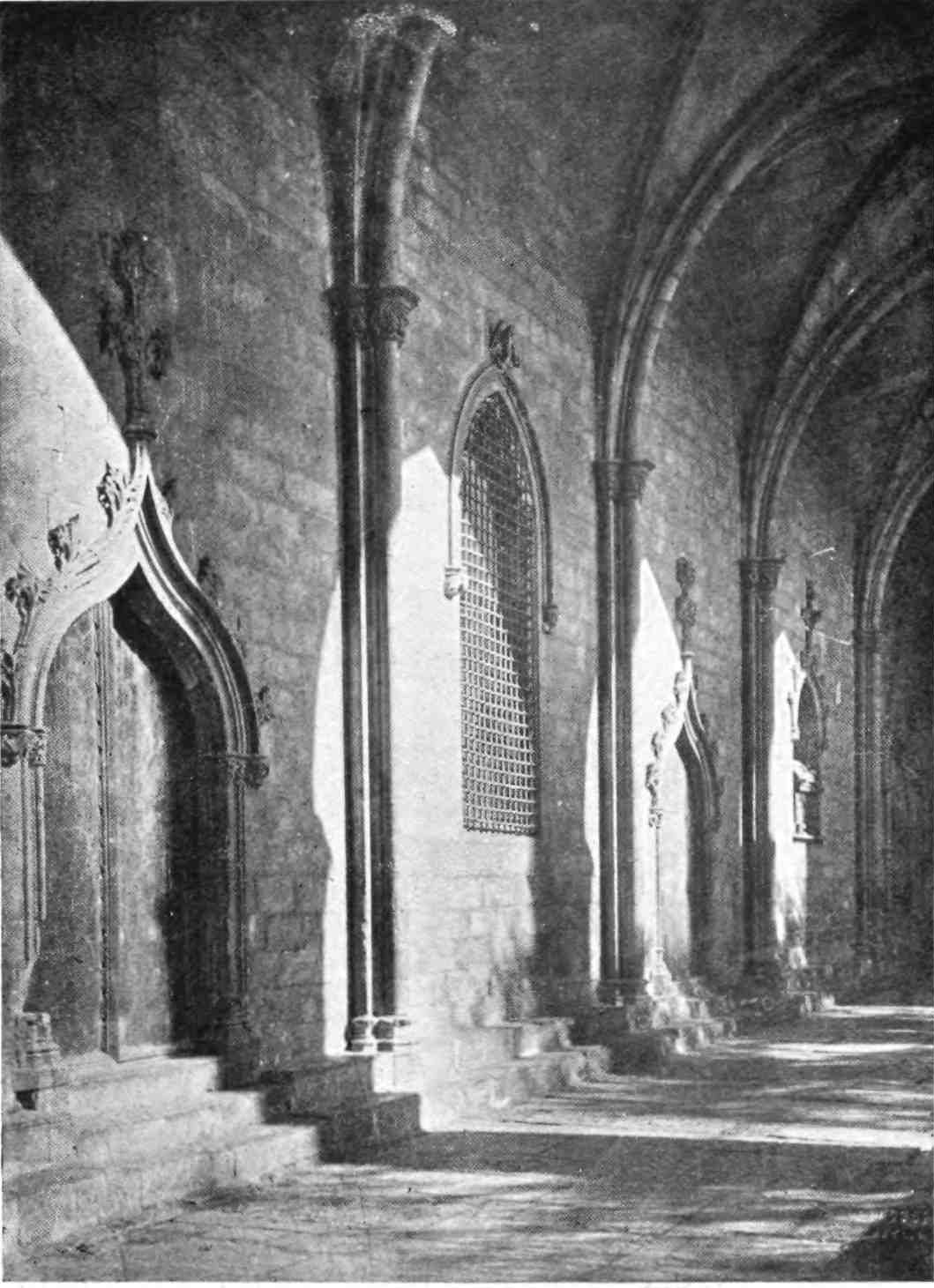 The inner ward is reached through a gatehouse of the Edwardine type, flanked by heavily machicolated drum-towers, and decorated with the escutcheons of Aragon and Castile. We approach the church, founded by Ramon Berenguer, but substantially the work of his son{66} and successor. The ugly Græco-Roman façade marks the ancient west front, which is approached across an atrium called the Galilee. The church is in the form of an elongated Latin cross. The simplicity of the architecture—its absolute freedom from ornament—illustrated the early Cistercian ideals. The aisles are of seven bays, and the chapels are confined to the south aisle and apse. There were once seventeen altars in the church, of which only four were kept up by the monastery, the rest being at the charge of individuals and corporations. All these, including the high altar, have been stripped of their ornamentations and accessories, and of the once magnificent choir only a fragment of the screen remains. Piferrer, who saw the monastery in its prime, gives a detailed account of it, and enumerated the tombs it contained. He speaks of the imposing entrance to the royal mausoleum, between the chancel and the choir. On the Epistle side lay Don Alfonso of Barcelona (II. of Aragon), opposite him was the sarcophagus of James the Conqueror, near him lay Pedro the Ceremonious. In addition to these monarchs Juan I., Martin, Fernando I., Alfonso V. and Juan II. of Aragon were buried here, with eight queens, thirty-six infantes and nine infantas. Here lies Carlos Prince of Viana, the illustrious scion of the house of Navarre; here were the{67} last resting-places of Aurembiax, Countess of Urgel and the last princess of her house; here lay the proud Cardonas and the noble knights and ladies of the Moncada and Anglesola lines. Nearly all the tombs that had not already been despoiled of their carving and marbles have been removed to Tarragona. Of those remaining, the best preserved is that of the Infanta Juana, with its figures relieved against thick blue glass.