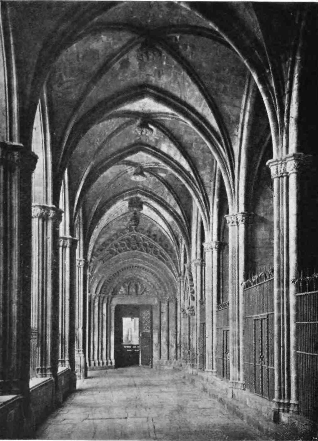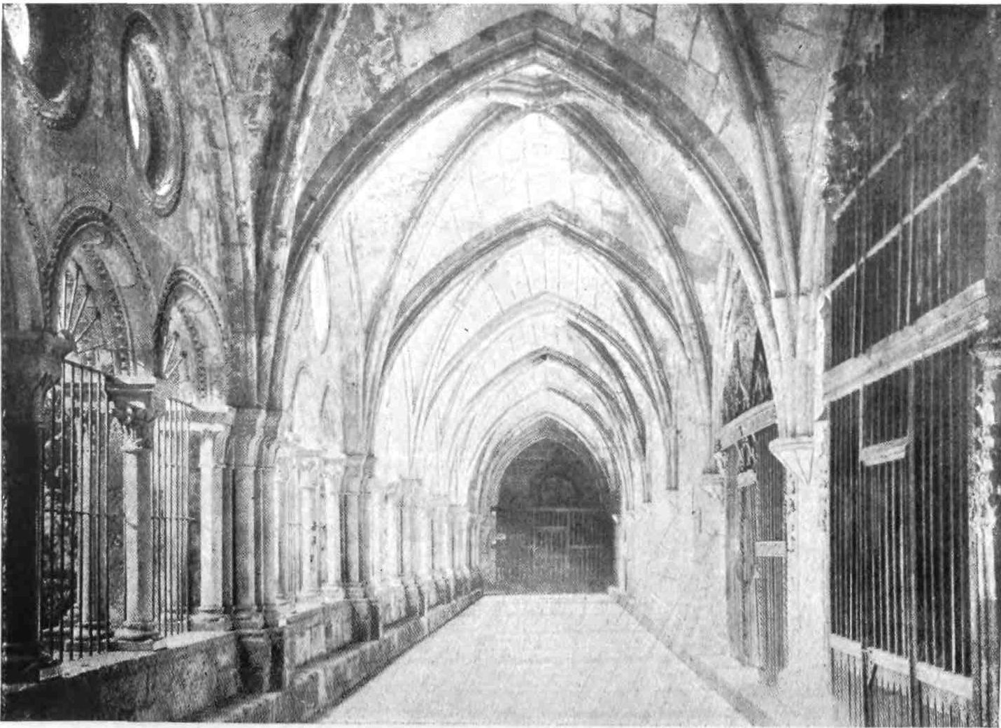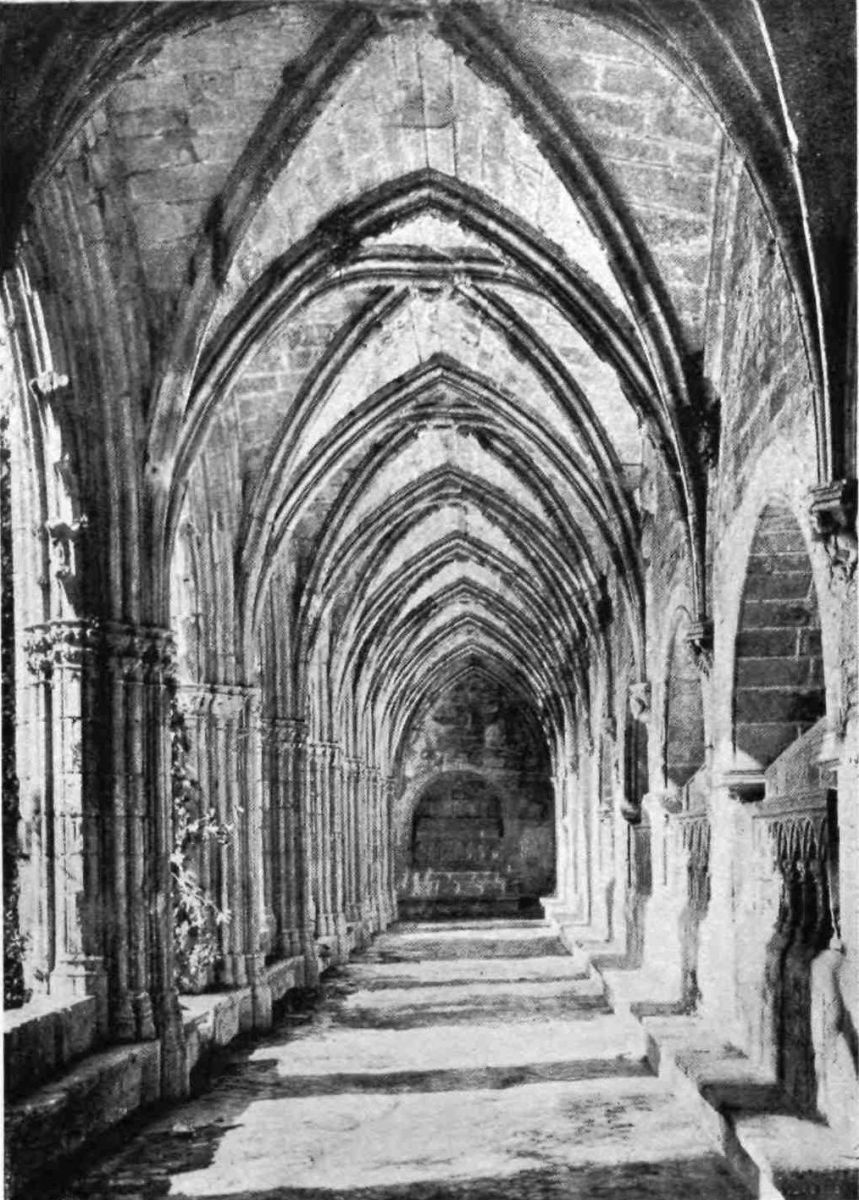The church communicates with a spacious cloister with four sides of seven bays, built at the beginning of the fourteenth century by order of Queen Blanca. The traceries of the windows remaining here and there are late Gothic, and contrast oddly with the severe lines and rude{71} capitals of the shafts. As at Poblet, in a corner of the cloister is a hexagonal chamber said to have been a lavatory. A great number of persons of distinction seem to have been buried in this cloister, in attendance, one might say, upon their lords within the church. Among these was the knight Queralt, who may been seen in effigy in a suit of fine mail, with surcoat and greaves and girt with two-handed sword. Some of the figures of divine persons to be seen over the tombs were evidently carved by late fourteenth-century sculptors.