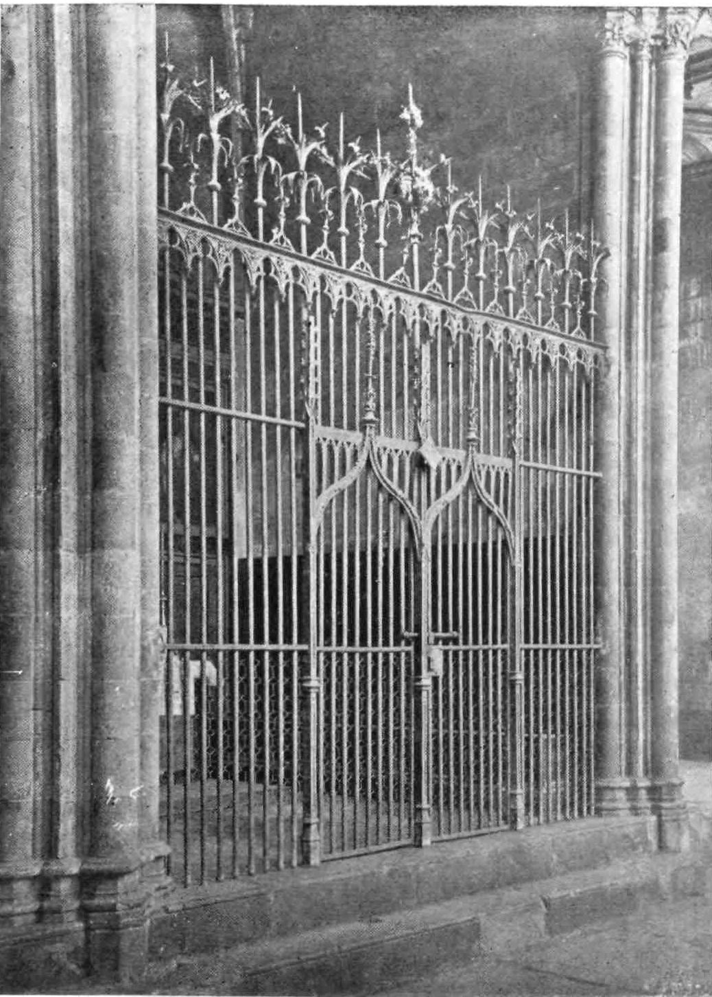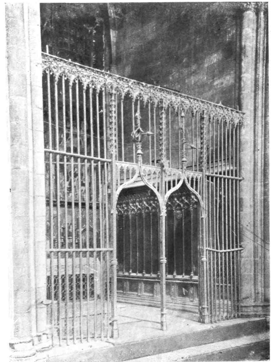 The chapter-house, the scene of many important councils, opens out of the south gallery of the cloister. The door is Norman. The exterior, like that of the cloister and cathedral generally, is most striking. The apse and the Tailors’ chapel are particularly fine seen from the outside.