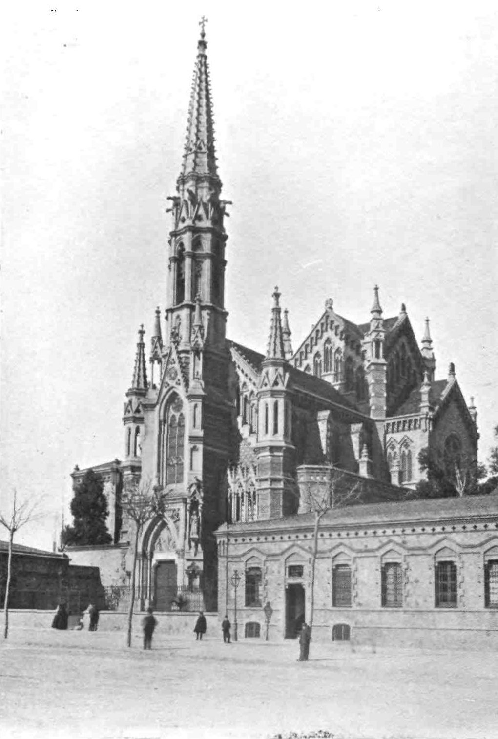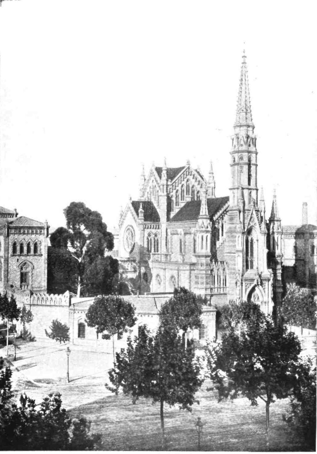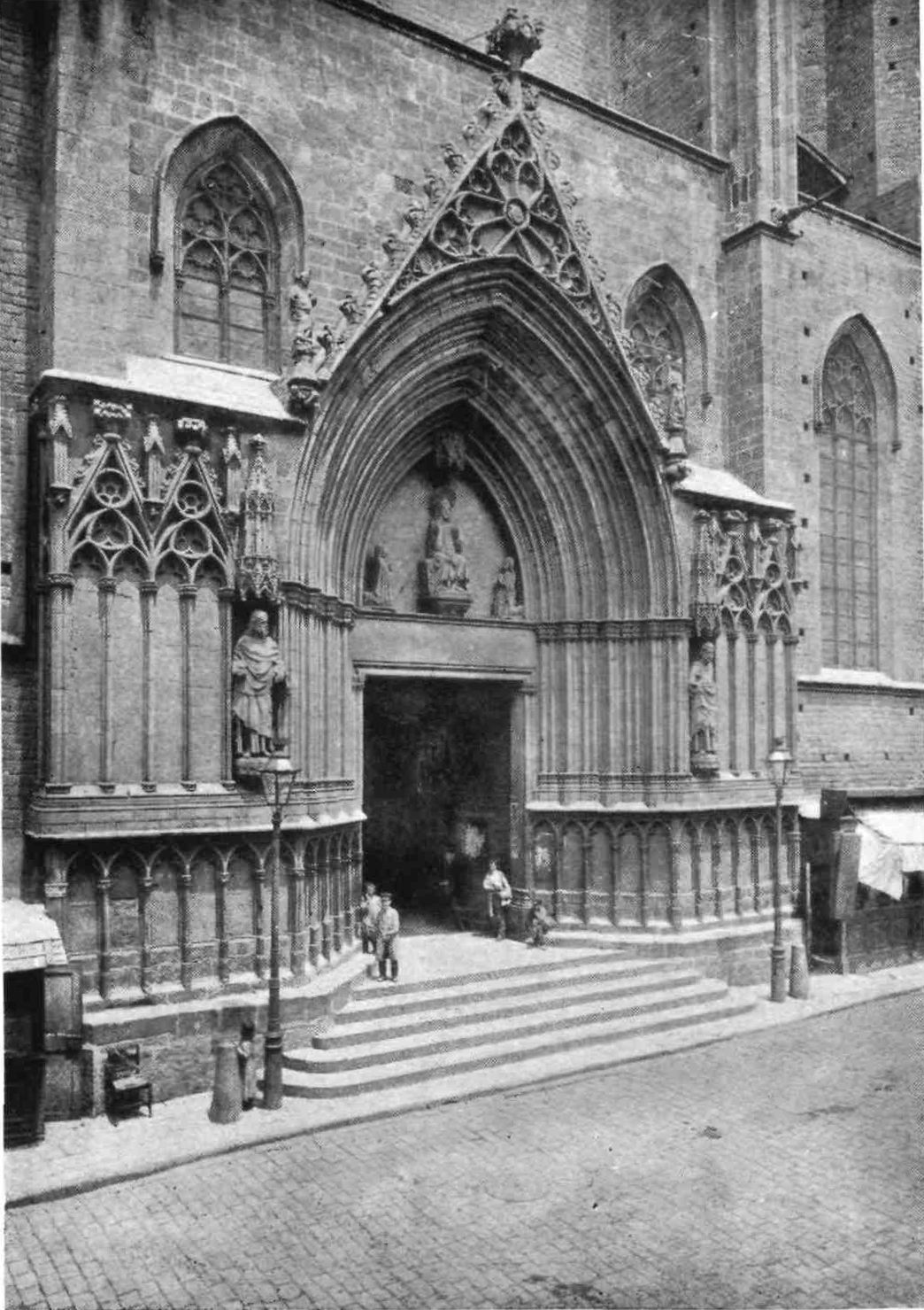 We presently pass the Bishop’s Palace, an eighteenth-century structure incorporating some late Romanesque arcading. But leaving other interesting buildings in this the oldest quarter of Barcelona for the moment, we will seek the next most notable church in the town, that of Santa Maria del Mar. It occupies the site of the earliest shrine of Santa Eulalia, over which Bishop Aetius built a temple in the thousandth year of our era. This modest church was replaced by another in the year 1329, which was restored and reconsecrated after a disastrous fire in 1383 under the reign of Pedro the Ceremonious. All classes of the community assisted in the work. Those who could not give money gave their labour, and in commemoration of this two small bronze figures carrying stone and timber adorn the principal door. The edifice is a good example of the Catalan church in its breadth and height of nave and simplicity of plan. Like the cathedral, it forms a parallelogram rounded at the east end, and presents an unbroken line of{16} wall to the exterior. Churches of this type usually consist of nave only, but Santa Maria del Mar has two aisles. Enormous octagonal columns carry the main arches and the groining ribs which all spring from their capitals. The wall rib towards the nave is carried up higher than the main arches, so as to allow space between them for a small circular and traceried clerestory window in each bay. The arches of the apse are very narrow, and enormously stilted. There are small windows above them, but they are modernised. The aisles are groined on the same level as the main arches, a few feet, therefore, below the vault of the nave, and they are lighted by a four-light traceried window in each bay, the sill of which is above the string-course formed by continuing the abacus of the capitals of the groining shafts. Below this are three arches in each bay, opening into side chapels between the main buttresses. Each of these chapels is lighted by a traceried window of two lights, and the outer wall presents a long unbroken line, until above the chapels, when the buttresses rise boldly up to support the great vaults of the nave and aisles.[A] The interior, though still simple and dignified, has been marred by modern restorations. Another peculiarity remains to be noted: the choir is placed{17} behind the high altar. Of this latter, a costly but churrigueresque erection, the less said the better. The royal pew in the south aisle, recalling the days when Barcelona was a capital, was connected with the palace by a gallery now destroyed. The church contains some good glass and examples of the art of Villadomat, a painter of whom Catalonia can boast. His fate was extremely sad: for the last seventeen years of his long life, he was paralysed in both hands.