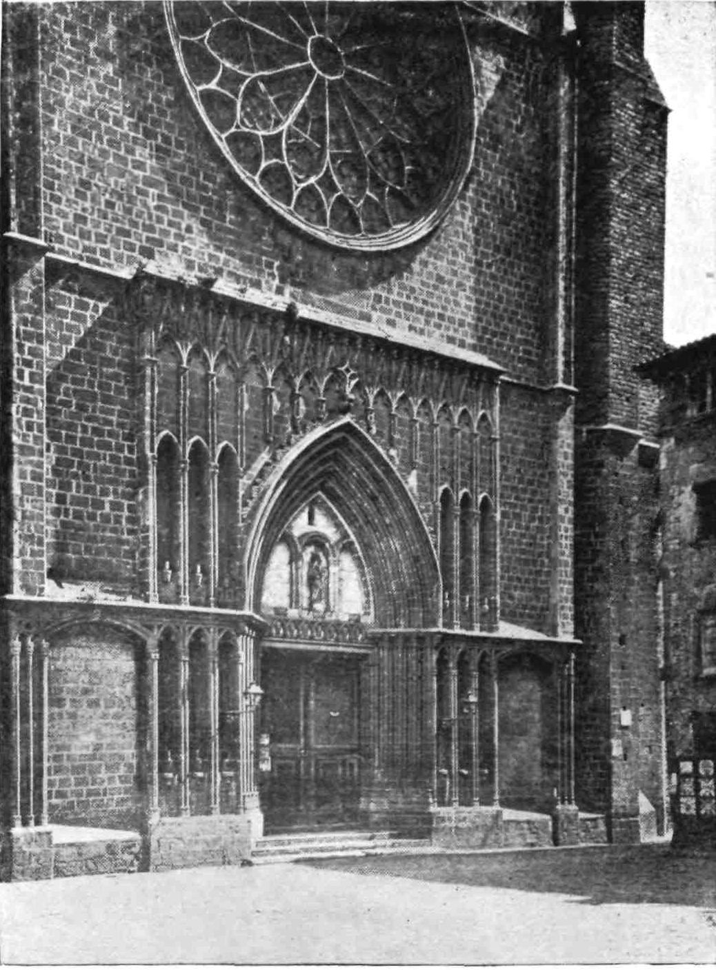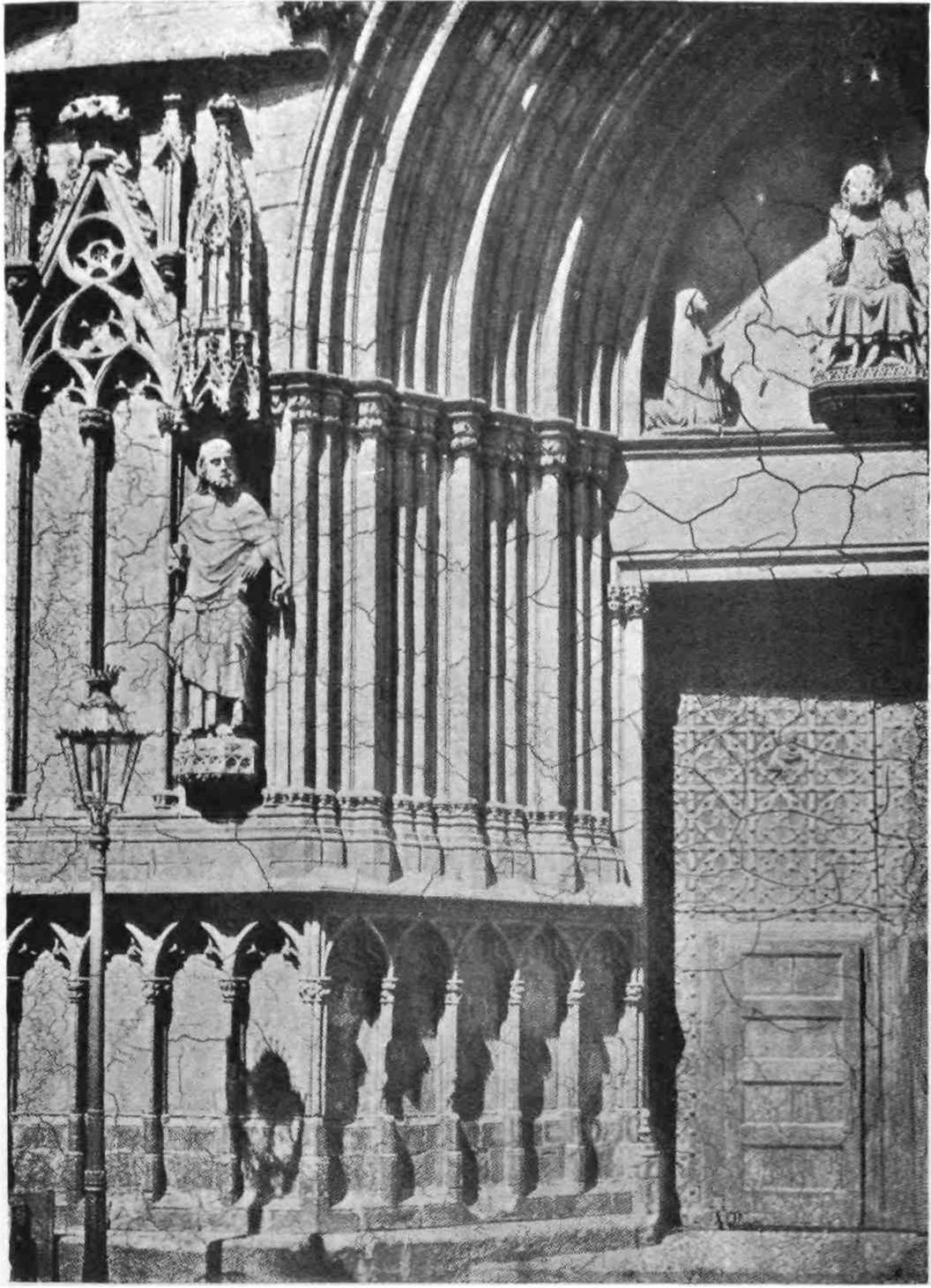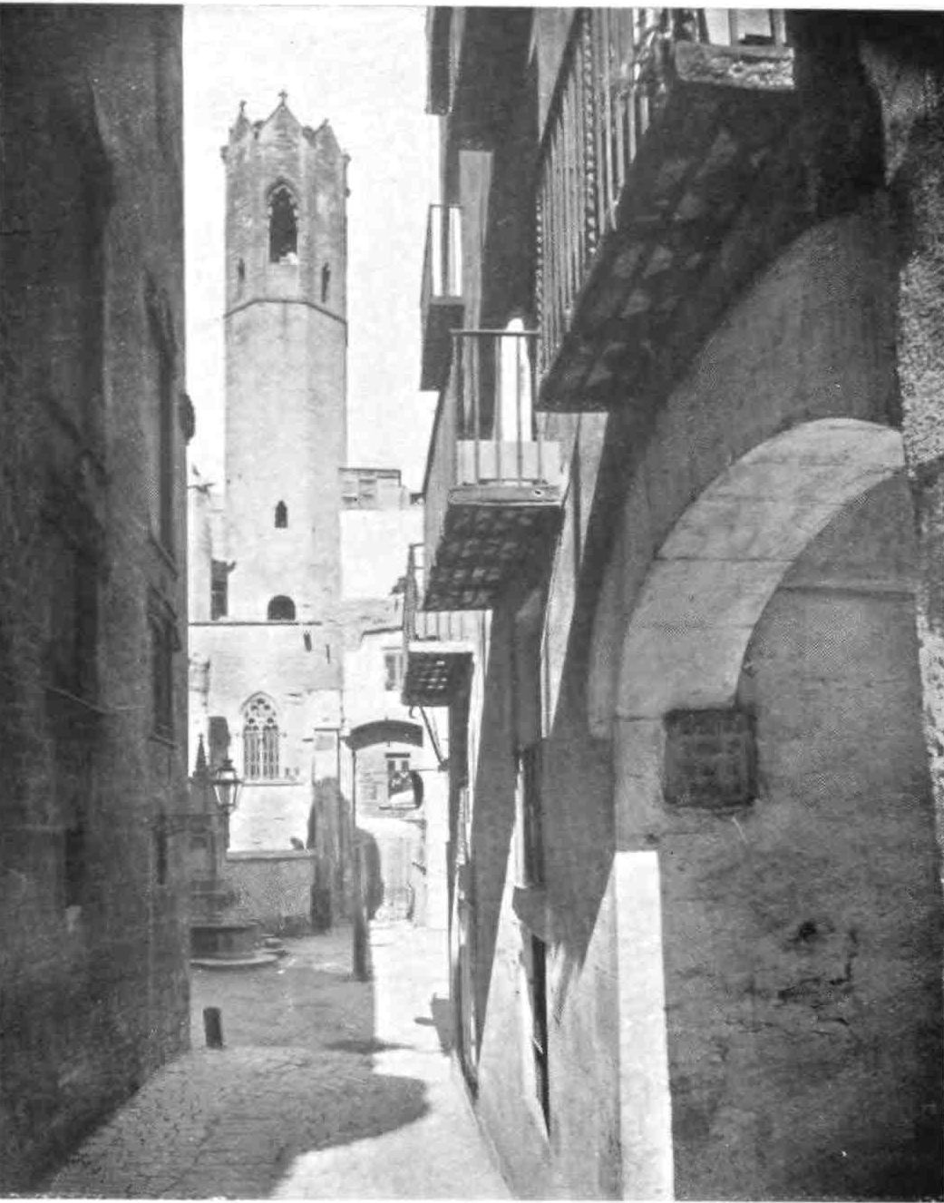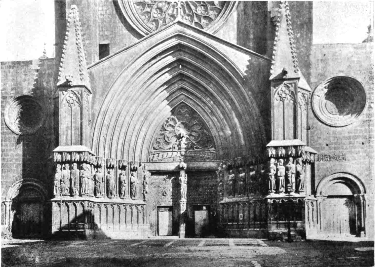The transept doors are also very fine, especially the southern one. The cornice is beautifully sculptured and the wheel window above reveals in its details the influence of the Italian Romanesque. These entrances make us regret the effacement of the west porch, which is concealed by the vast square cloister covering that side of the church. This remarkable building, now occupied by troops, is the grandest, Street declared, he had ever seen. In its present desecrated state, it must be confessed it needs a highly trained eye to appreciate its beauty. The arcades are walled up, and there is some ground for supposing that when in ecclesiastical occupation the galleries were used as dormitory and refectory. The details vary greatly. The bays vary in width, the sculpture is of all sorts of design, and of all periods. Adjoining this vast cloister on the north side is a long barrel-vaulted hall, lighted only at one end. On{45} the west side the cloister is entered through an enormous western doorway with a pointed arch. South of this and almost detached from the cloister stands that beautiful octagonal steeple which served Pedro Balaguer as a model for the Micalet Tower at Valencia. It is 170 feet high and divided into five stages, “the whole construction being of the most dignified and solid description.”
